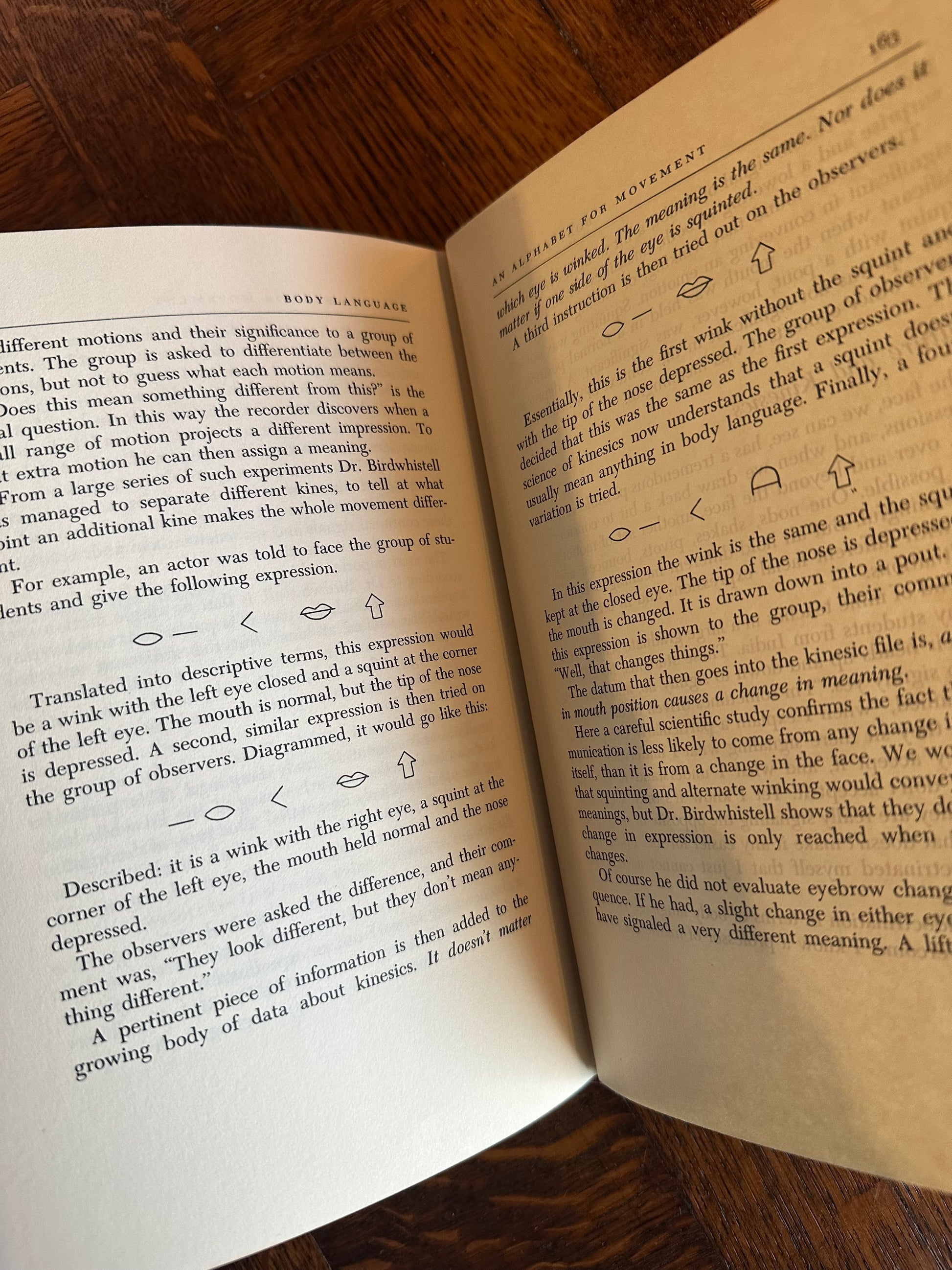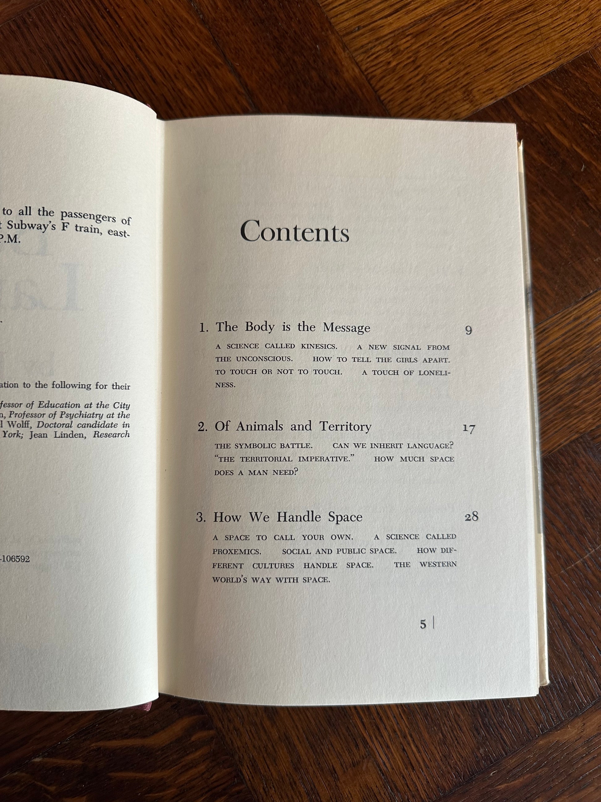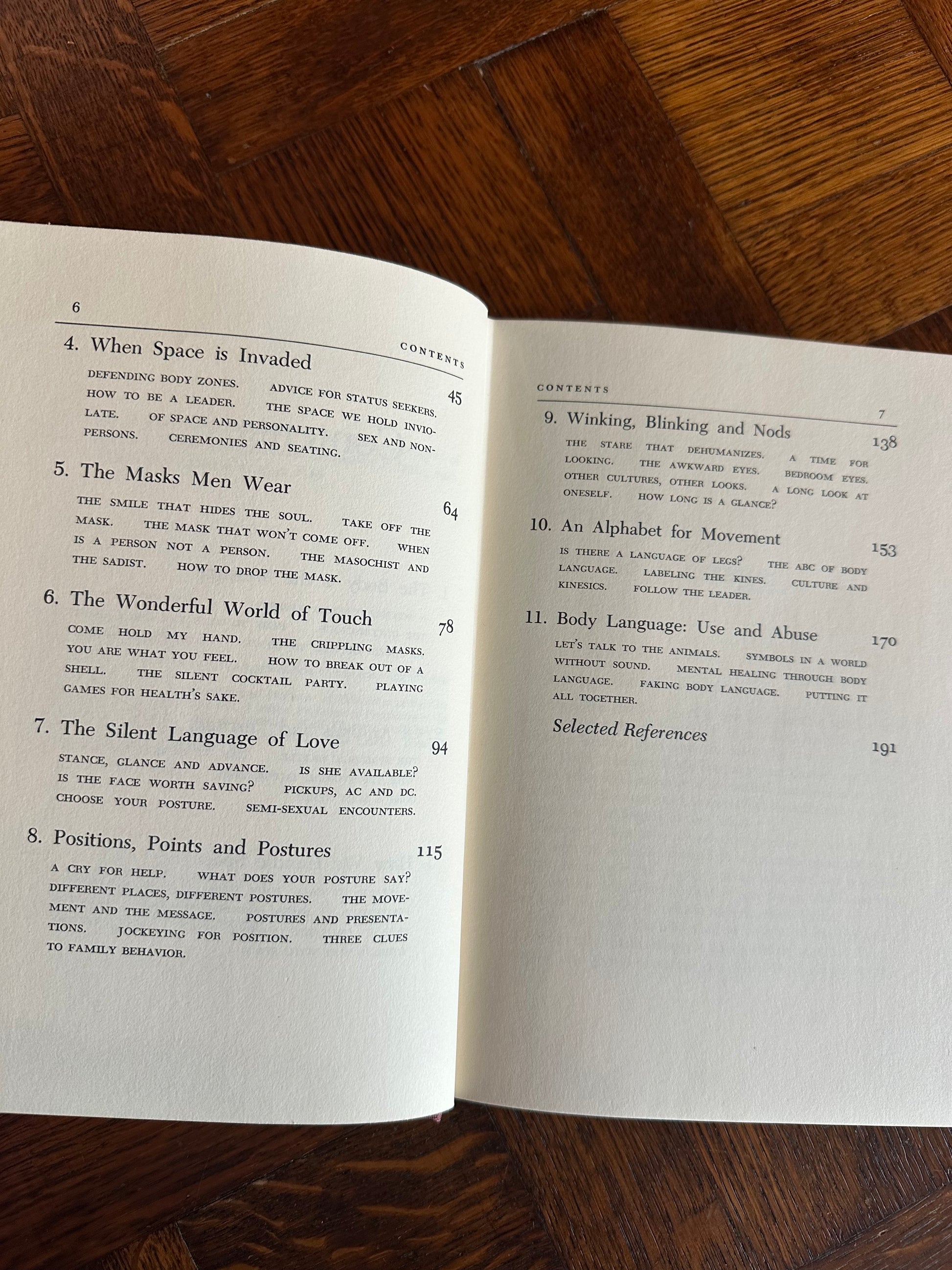 Contents include: The Body is the Message, Of Animals and Territory, How We Handle Space, When Space is Invaded, The Masks Men Wear, The Wonderful World of Touch, The Silent Language of Love, Positions, Points and Postures, Winking, Blinking and Nods, An Alphabet for Movement, Body Language: Use and Abuse.