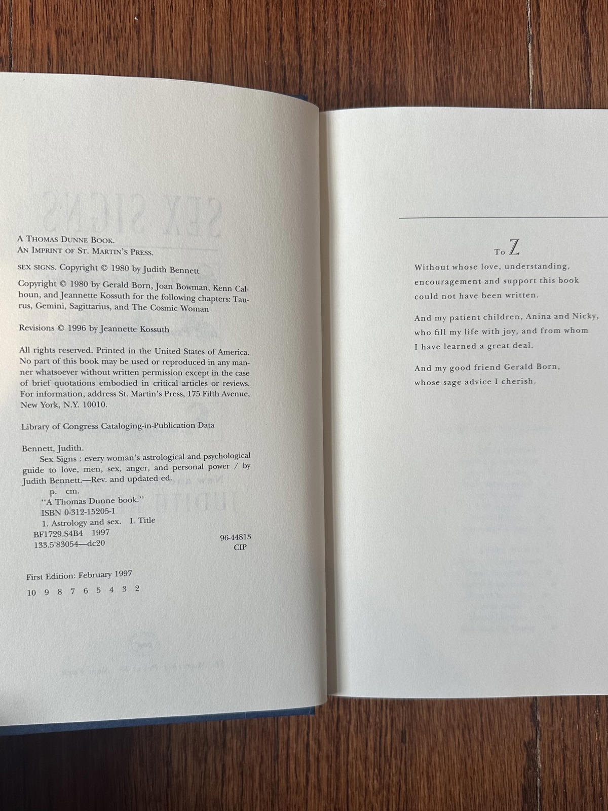 'Sex Signs: Every Woman's Astrological and Psychological Guide to Love, Men, Sex, Anger, and Personal Power' by Judith Bennett. New and Revised Edition.