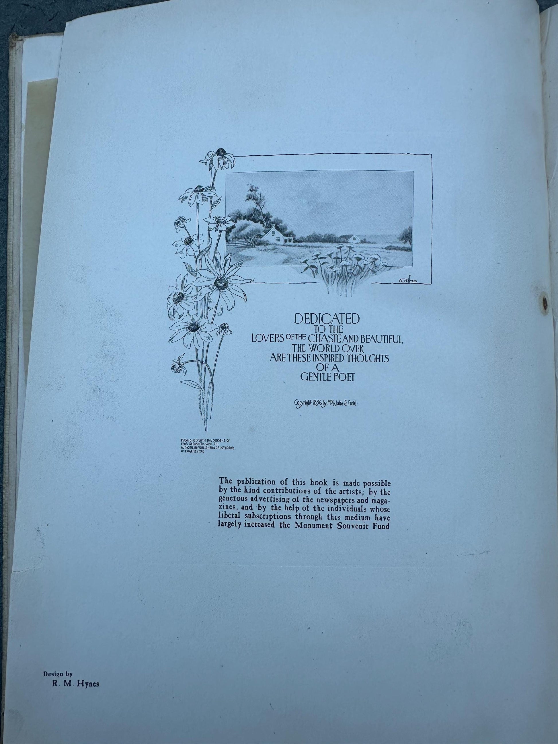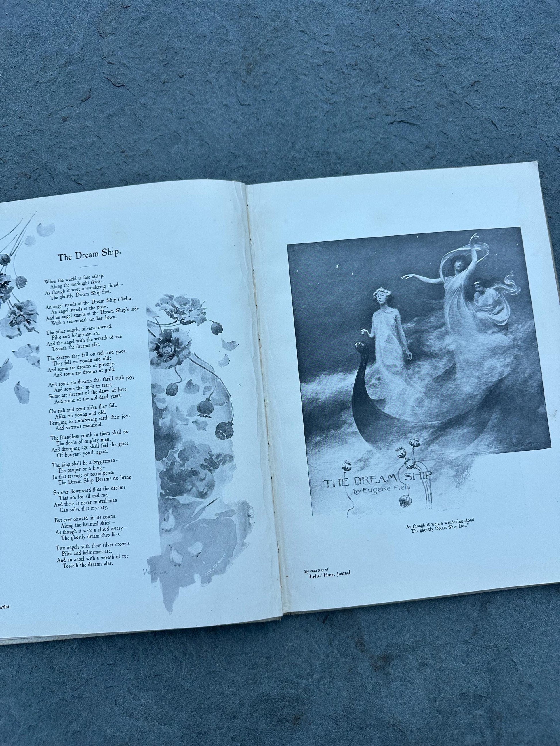 A limited edition collection of Field's poems, with full page and in-text illustrations of country scenes by artists of the day, to raise funds for building a memorial to Fields. Contents include: “The Dream Ship,” “Little Mistress Sans Merci,” “Cornish Lullaby,” “Over the Hills and Far Away,” “Jes’ ‘Fore Christmas,” “Be My Sweetheart,” “A Little Bit of a Woman,” “Barbara,” “Some Time,” “The Rock-a-by Lady,” “Seein’ Things,” “The Tea-Gown,” “When I Was a Boy,” “Jewish Lullaby,” & “The Brook”.