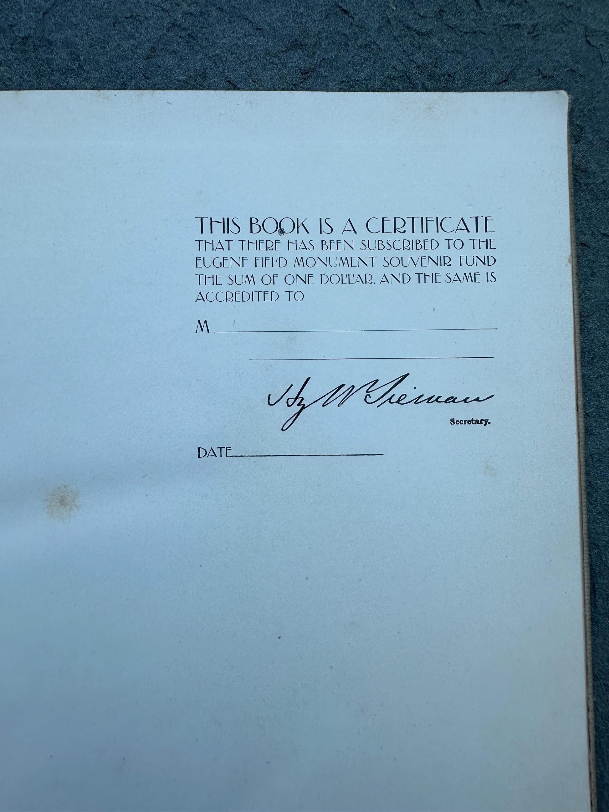 Published with the consent of Chas. Scribners Sons, the authorized publishers of the works of Eugene Field. Published under the auspices of Mrs. Eugene Field with the approval of the Monument Committee for the purpose of creating a fund, the proceeds of which will be equally divided between the family of the late Eugene Field, and the fund for the building of a monument to the memory of the beloved poet of childhood.