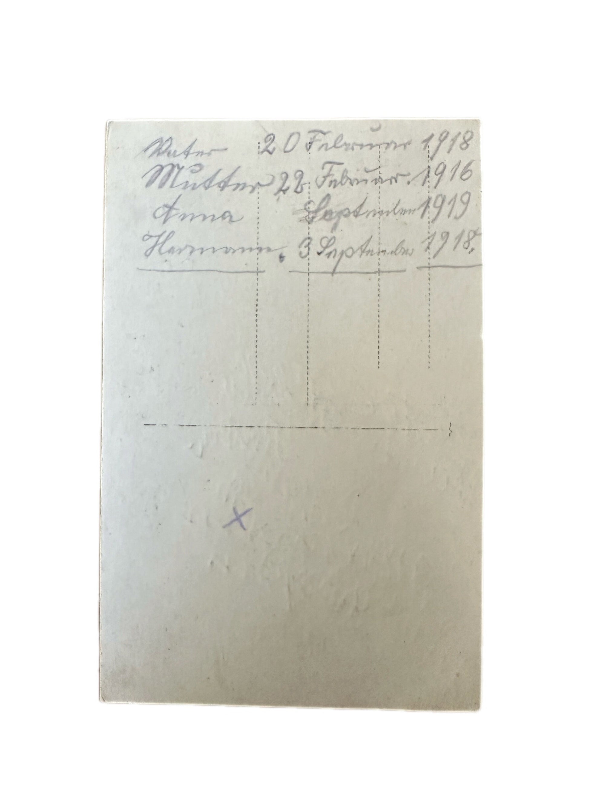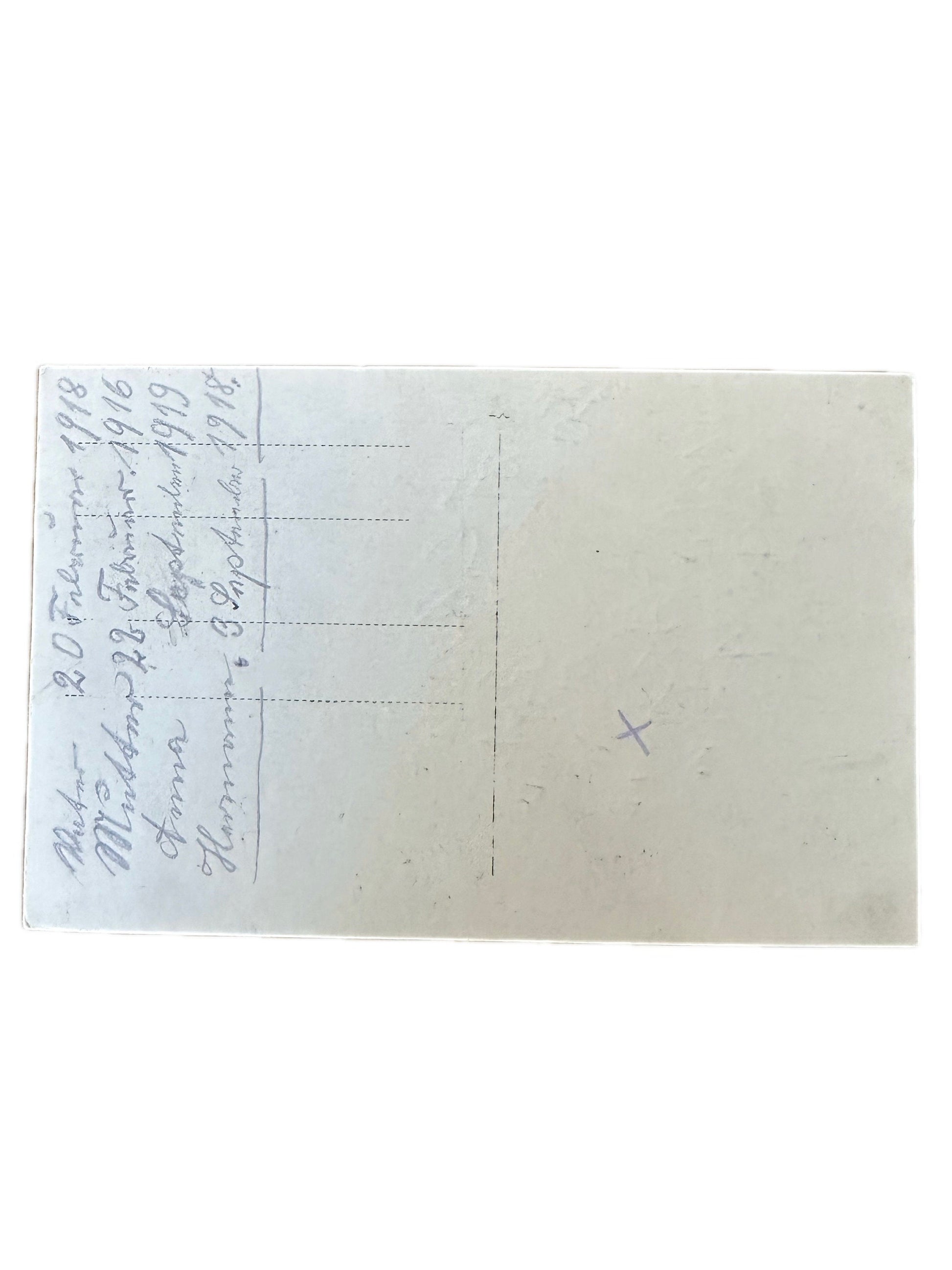Multiple names and dates are handwritten on the back of postcard. Unable to decipher names, but the dates are as follows: February 20, 1918, February 22, 1916, September 1919, and September 3, 1918.