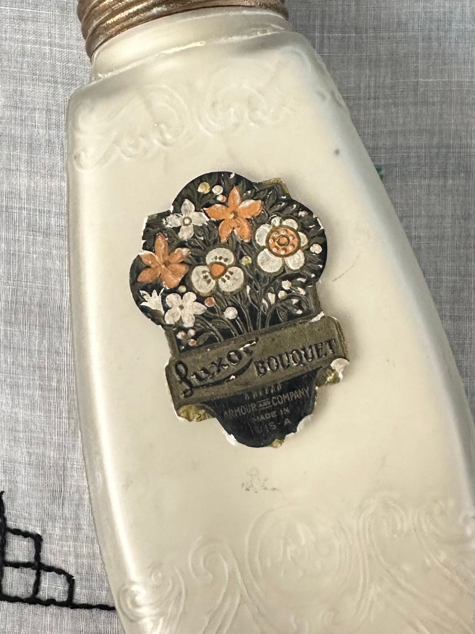 Bottle has an interesting embossed scroll design and the bottom of the bottle is embossed “ARMOUR & CO CHICAGO”. Sticker on front of bottle has a floral depiction, with Luxor logo, “Bouquet, which one can assume is the style/scent of the powder, and “Armour and Company, Made in USA”.