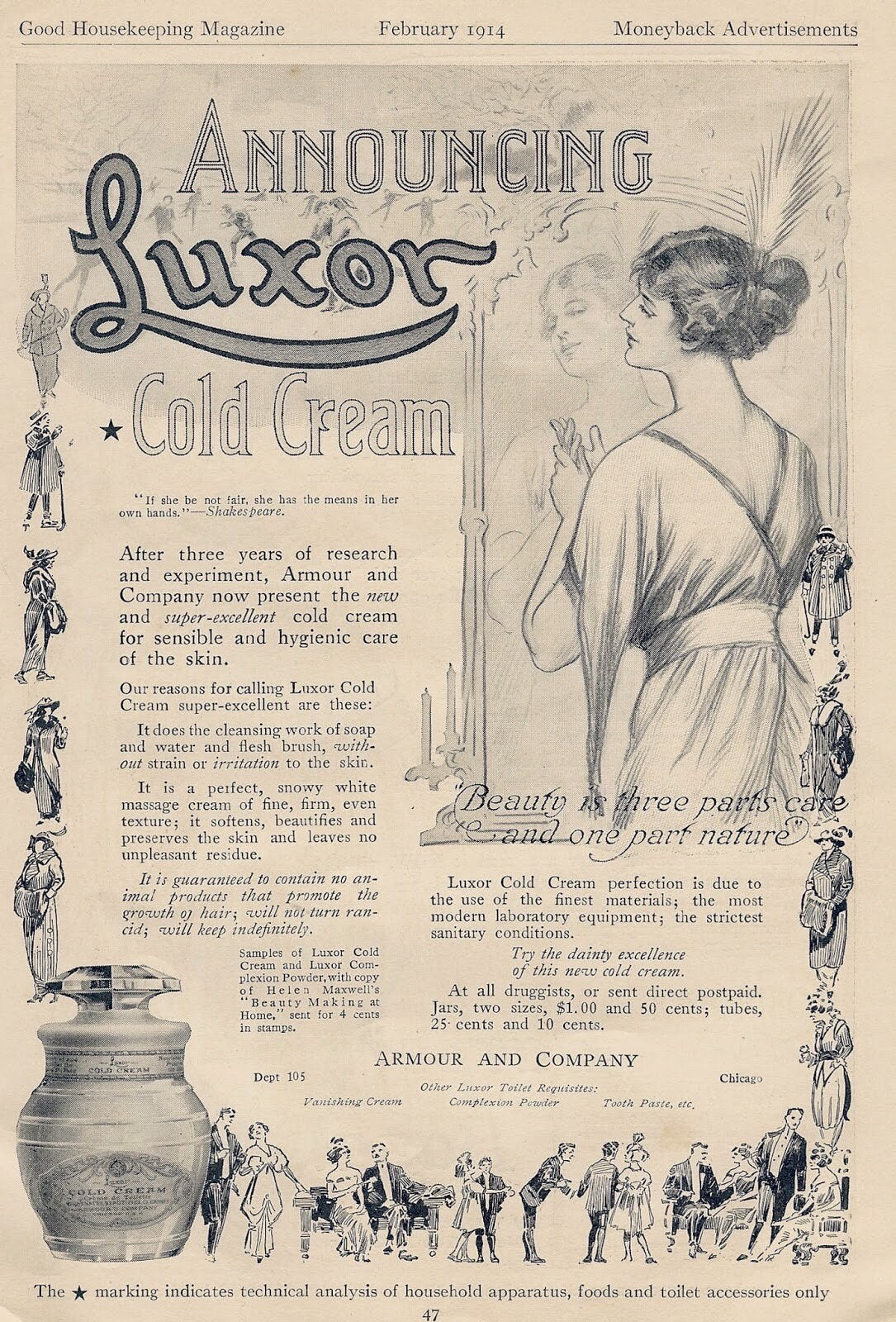 Armour & Company was an American company and was one of the five leading firms in the meat packing industry. It was founded in Chicago, in 1867, by the Armour brothers. By 1888, Armour had entered the soap business, producing a laundry bar called Armour family soap (later, they produced Dial!). In 1914, Armour’s Luxor cold cream was introduced and proved to be a popular product for the next thirty years. By the early 1920s, Armour’s Department of Soap and Toilet Requisites had been replaced by a new corporate entity known as Luxor Ltd – Perfumers. From 1923 there was a noticeable increase in advertising of Luxor products. In about 1931, The Luxor trademark was updated with the letter L losing its scimitar-like tail. (Source: collectingvintagecompacts.blogspot.com)