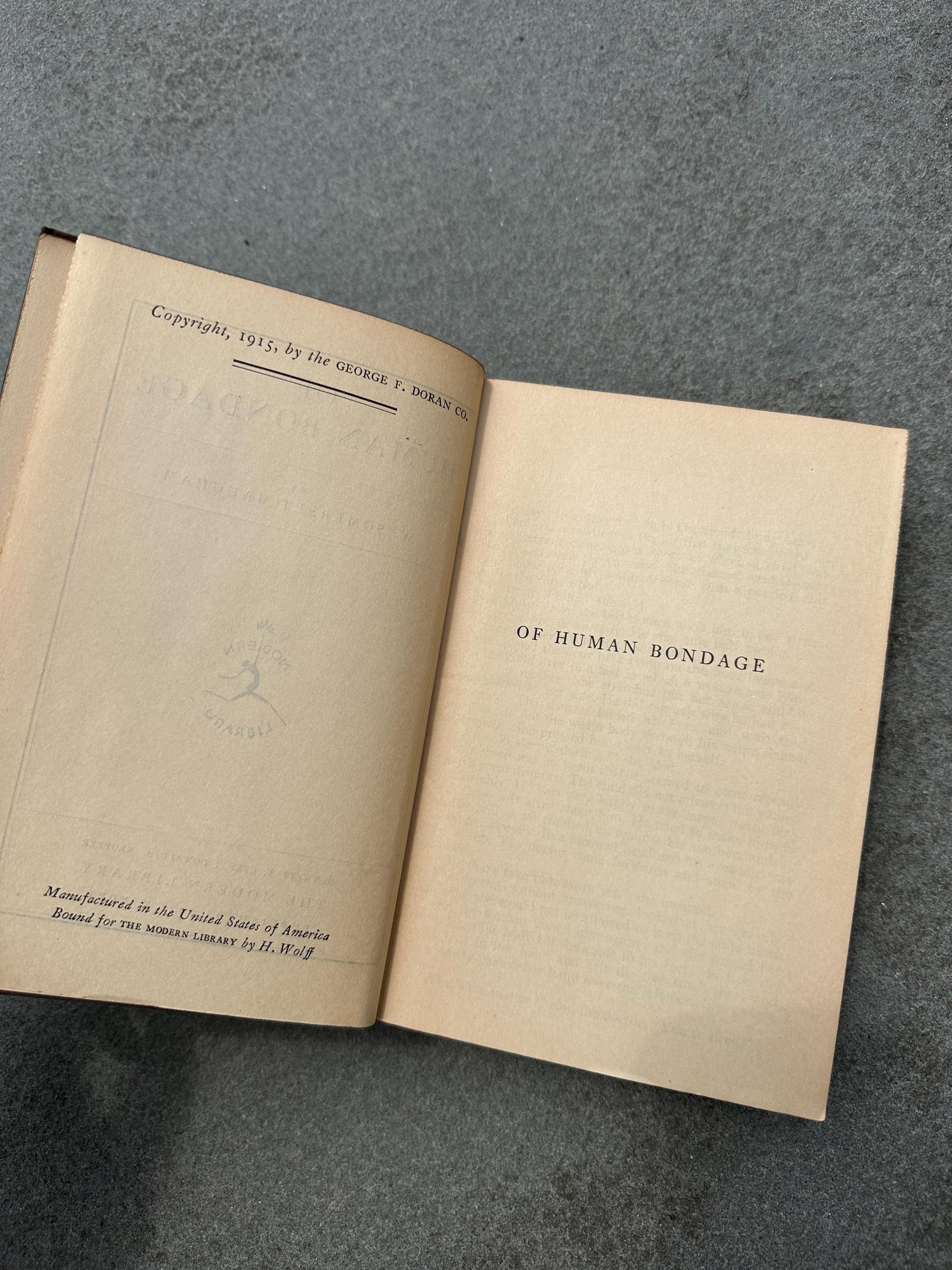 By W. Somerset Maugham. Copyright 1915 by the George F. Doran Co. Manufactured in USA. Bound for The Modern Library by H. Wolff. Published by The Modern Library Publishers, New York.