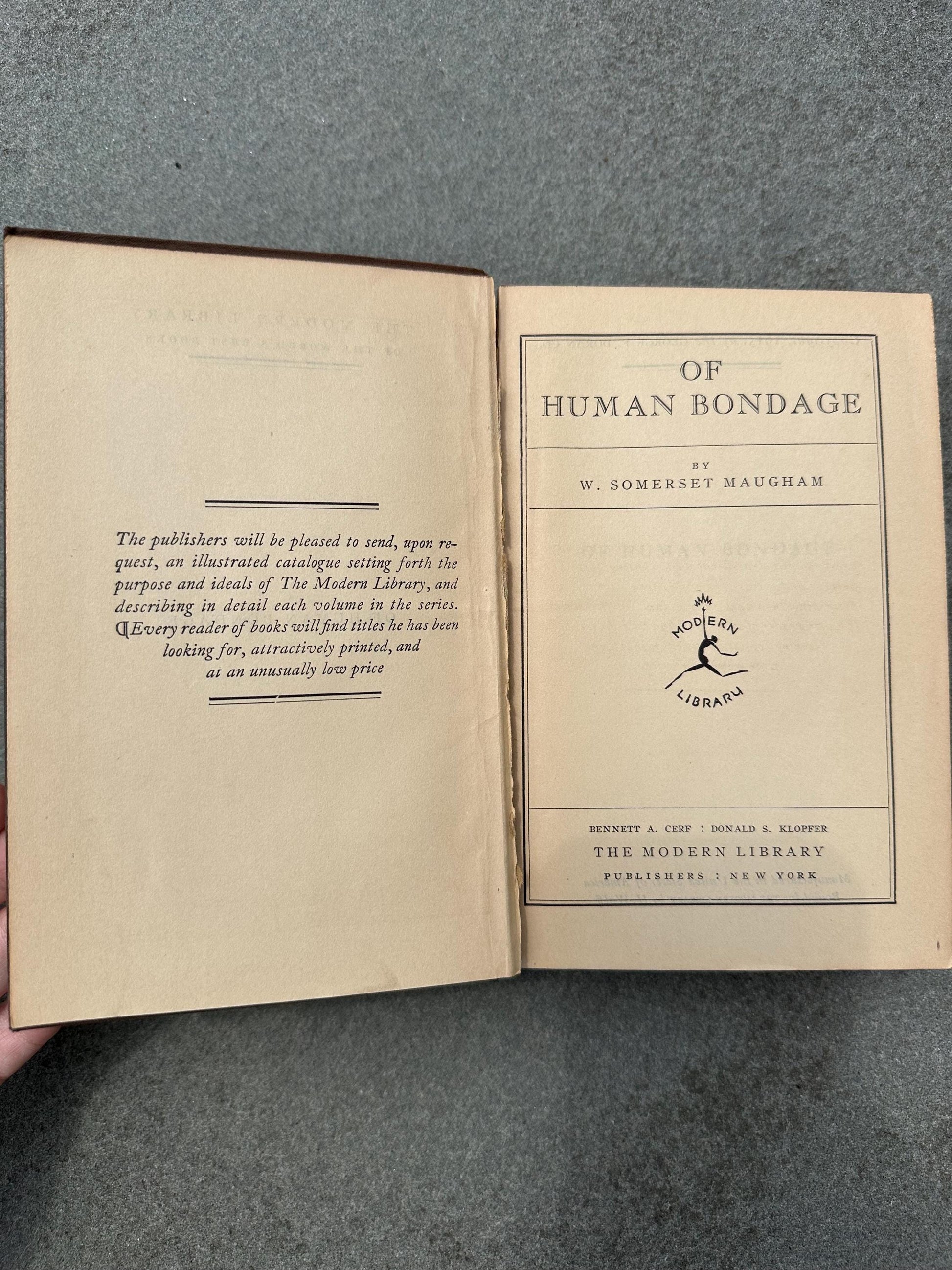 Antique 1915 Of Human Bondage Hardcover Book by W. Somerset Maugham The Modern Library