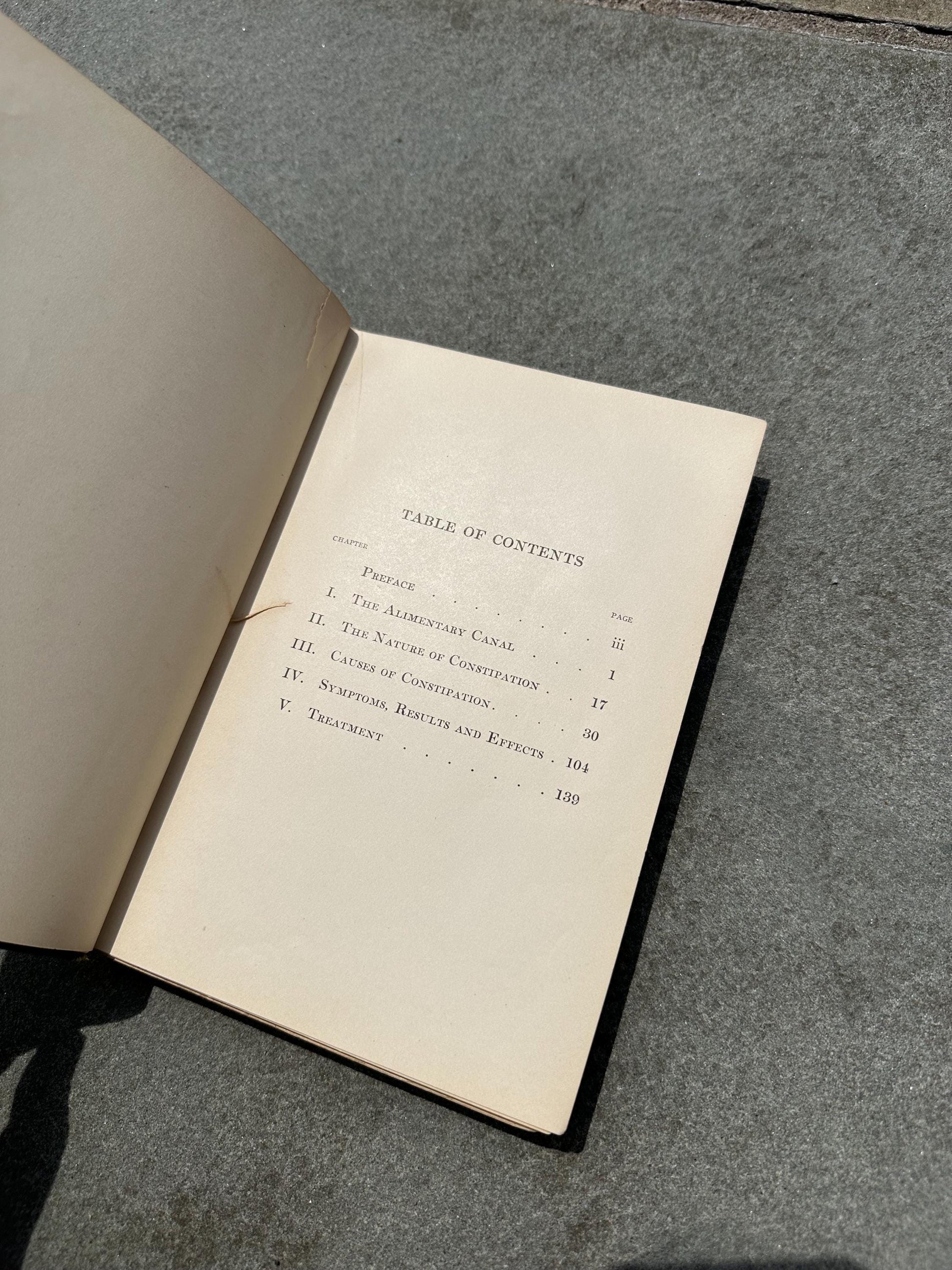 Contents include: The Alimentary Canal, The Nature of Constipation, Causes of Constipation, Symptoms, Results and Effects, & Treatment.