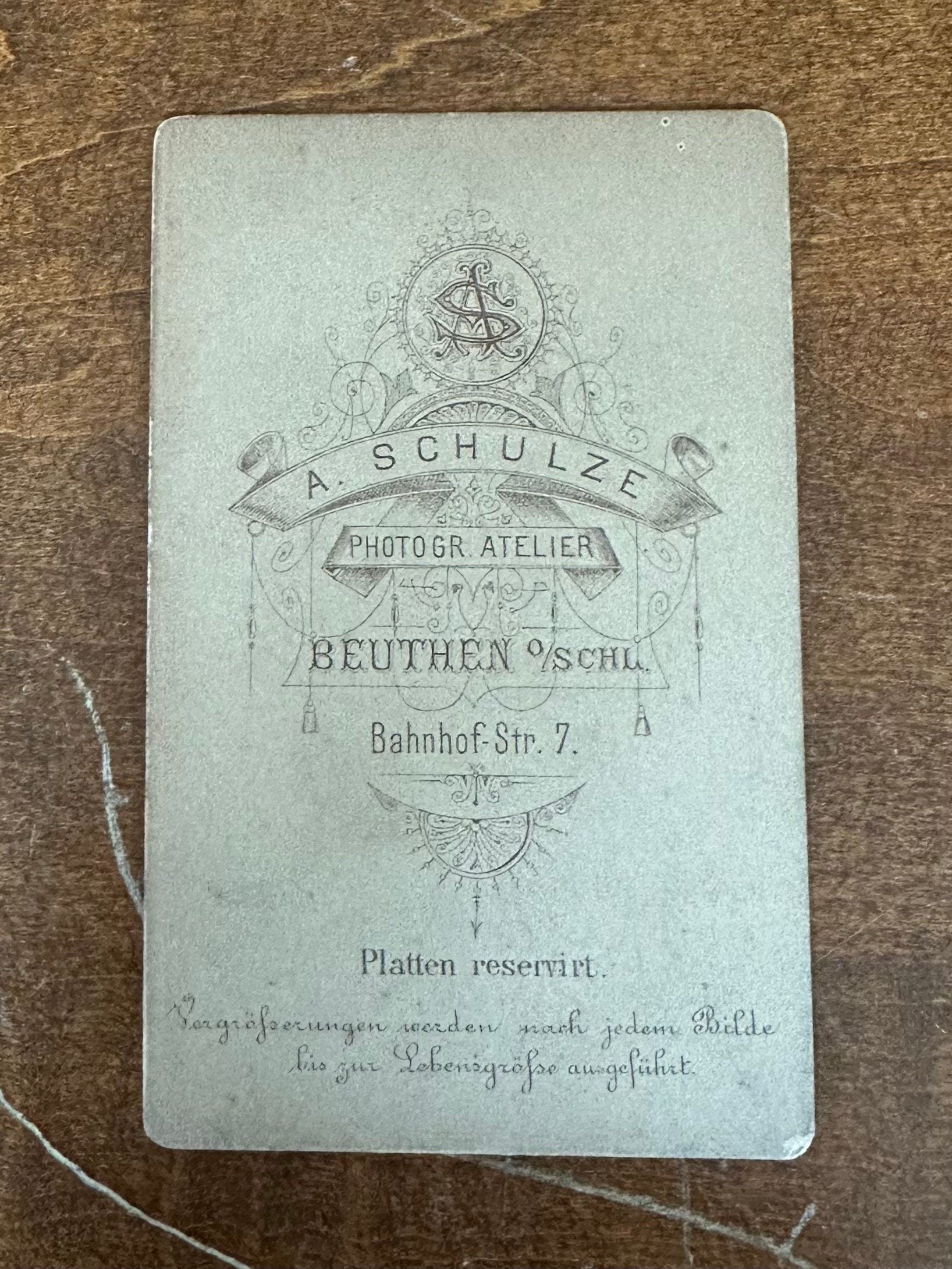 Lower edge mount bears A. Schulze Beuthen °/Schl. Bahnhof - Str. 7 imprint. Back of card also bears studio information and is beautifully decorated with banners and linework.