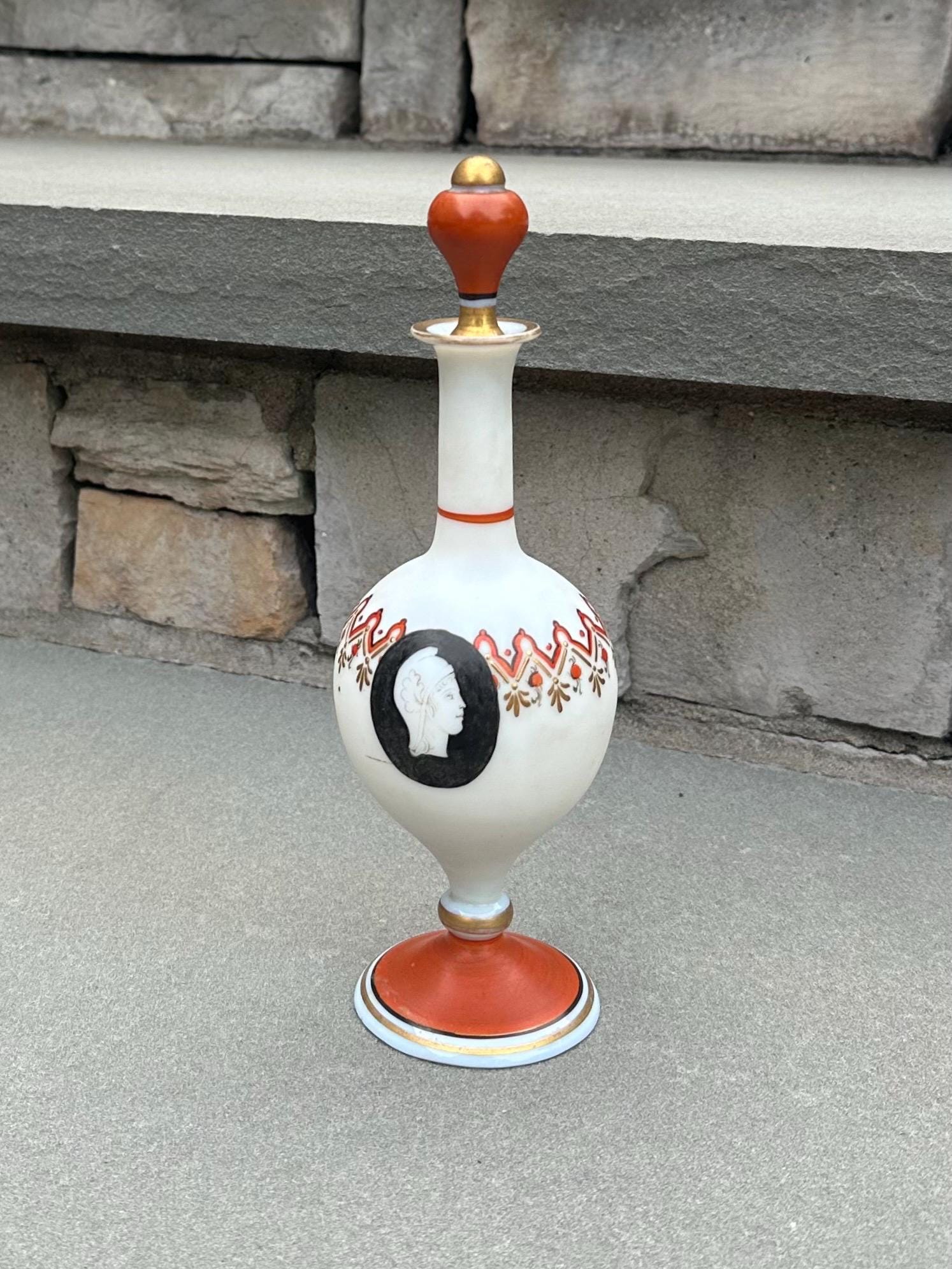 Antique 19th Century Napoleonic Era French Opaline Glass Hand Painted Greco Roman Decanter Bonne Nuit Night Service Bottle with Stopper
