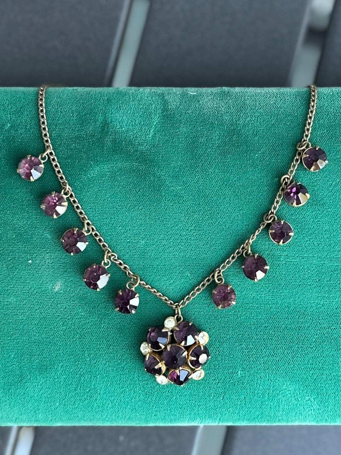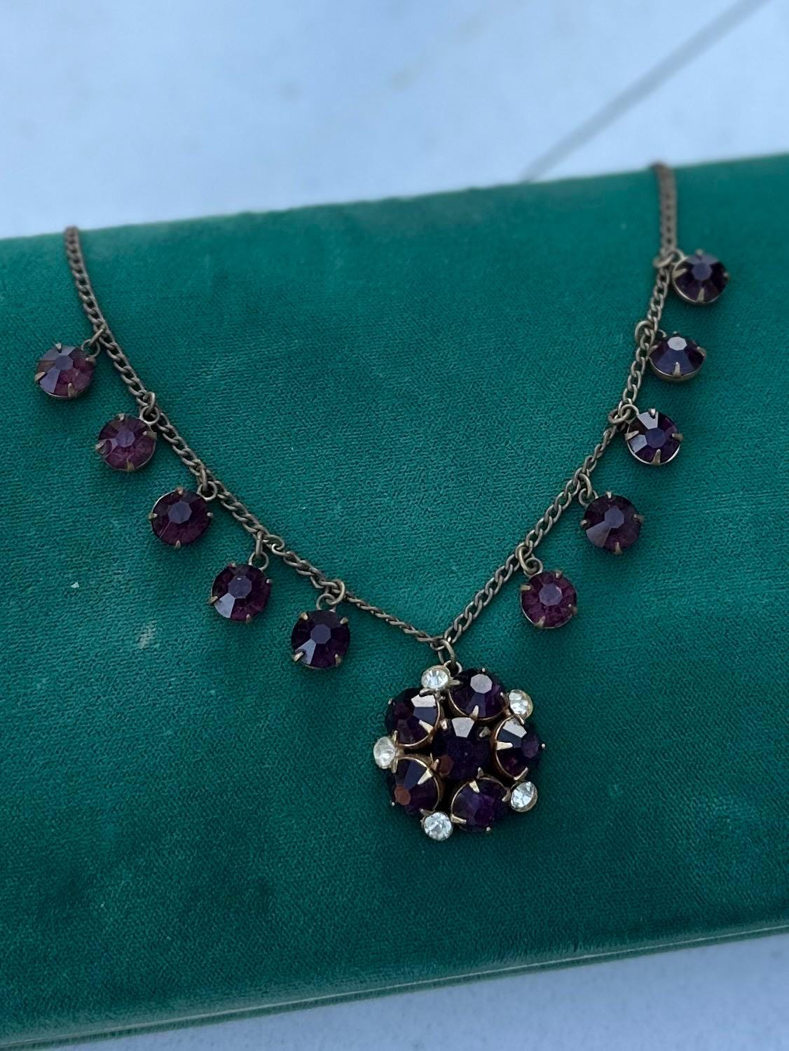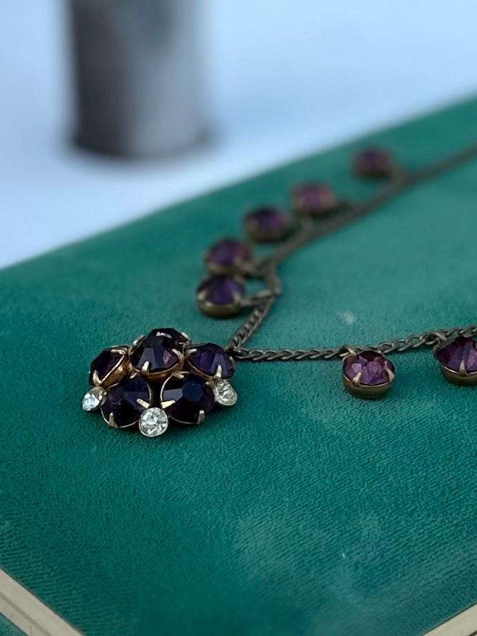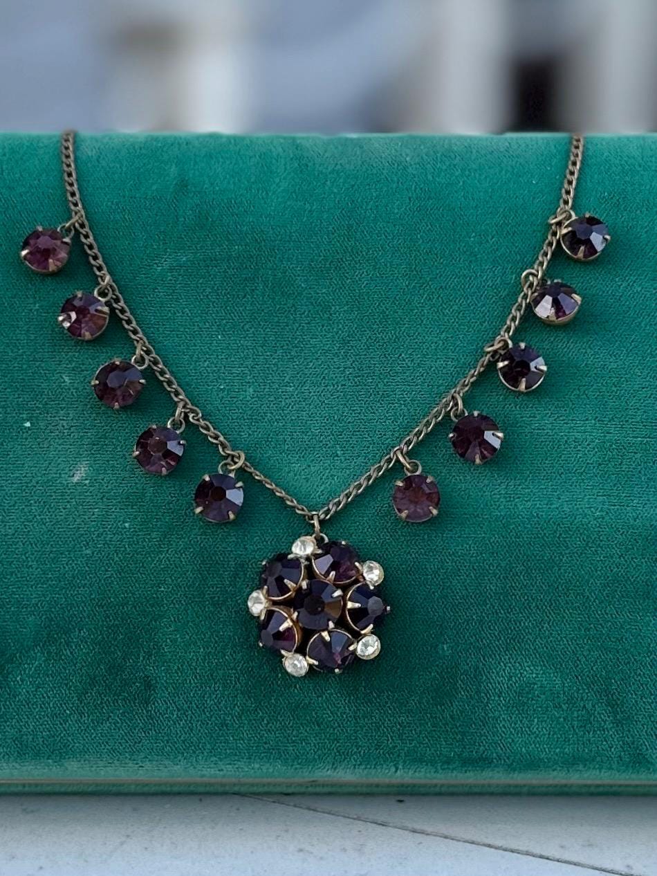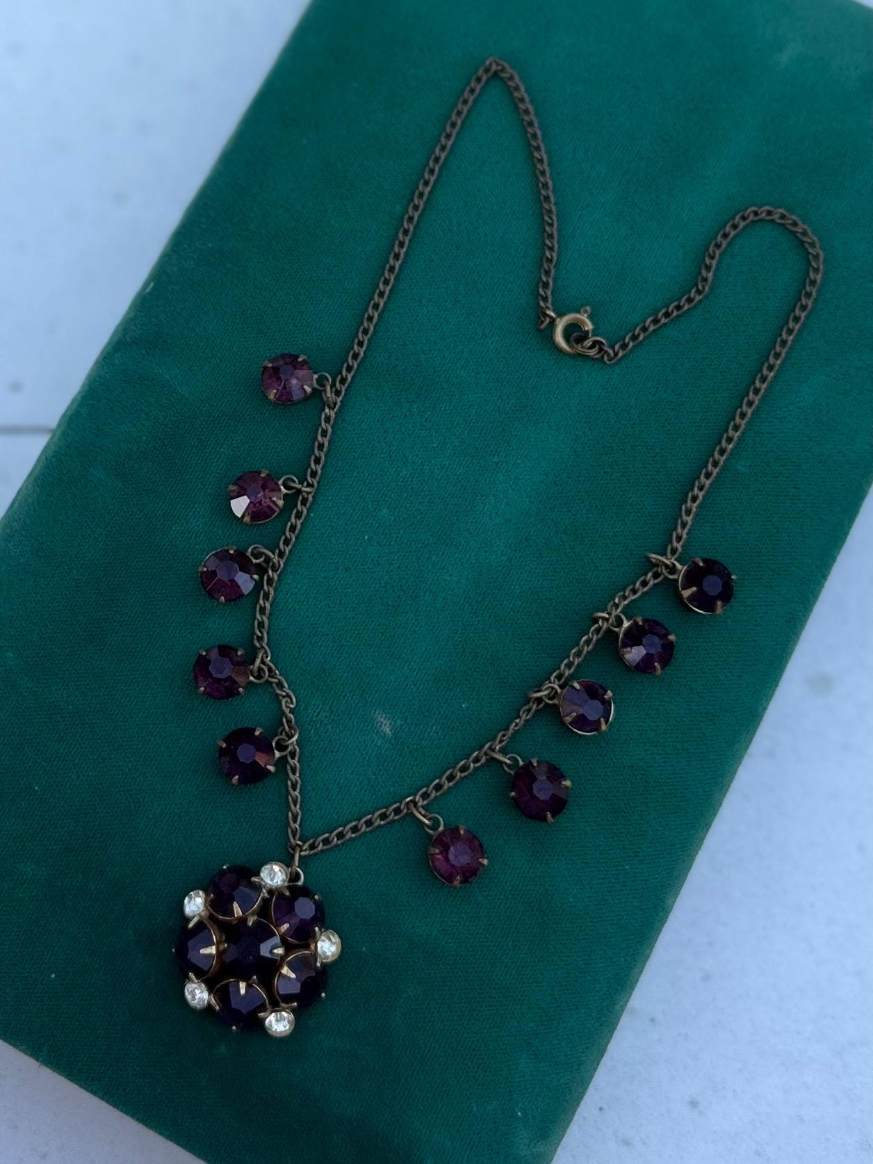 Antique 1930s Art Deco Faceted Purple & Clear Czech Glass Cluster Pendant Necklace