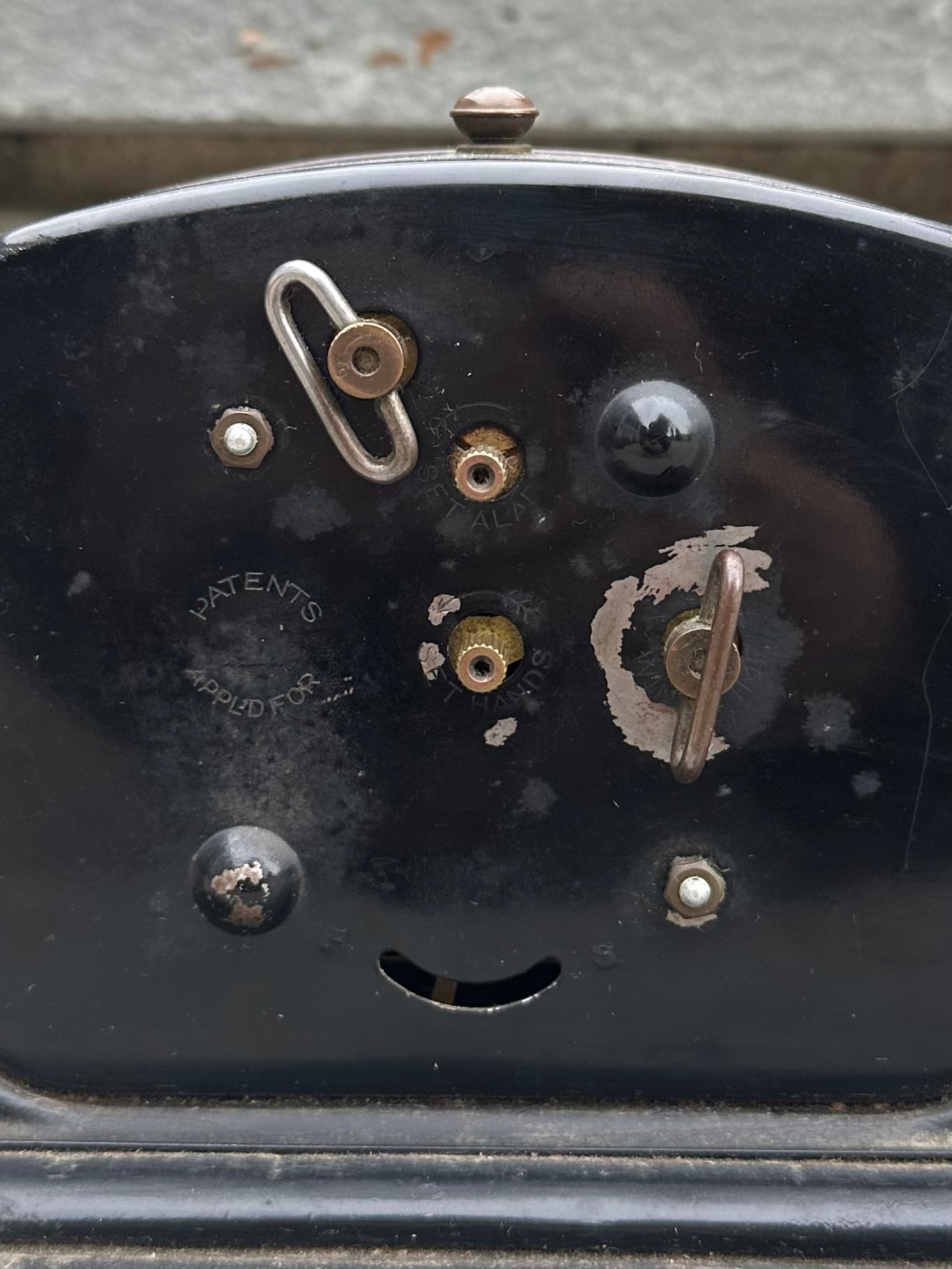 Antique Art Deco Gilbert Alarm Clock Black Metal Case on Repurposed Wooden Crate Base