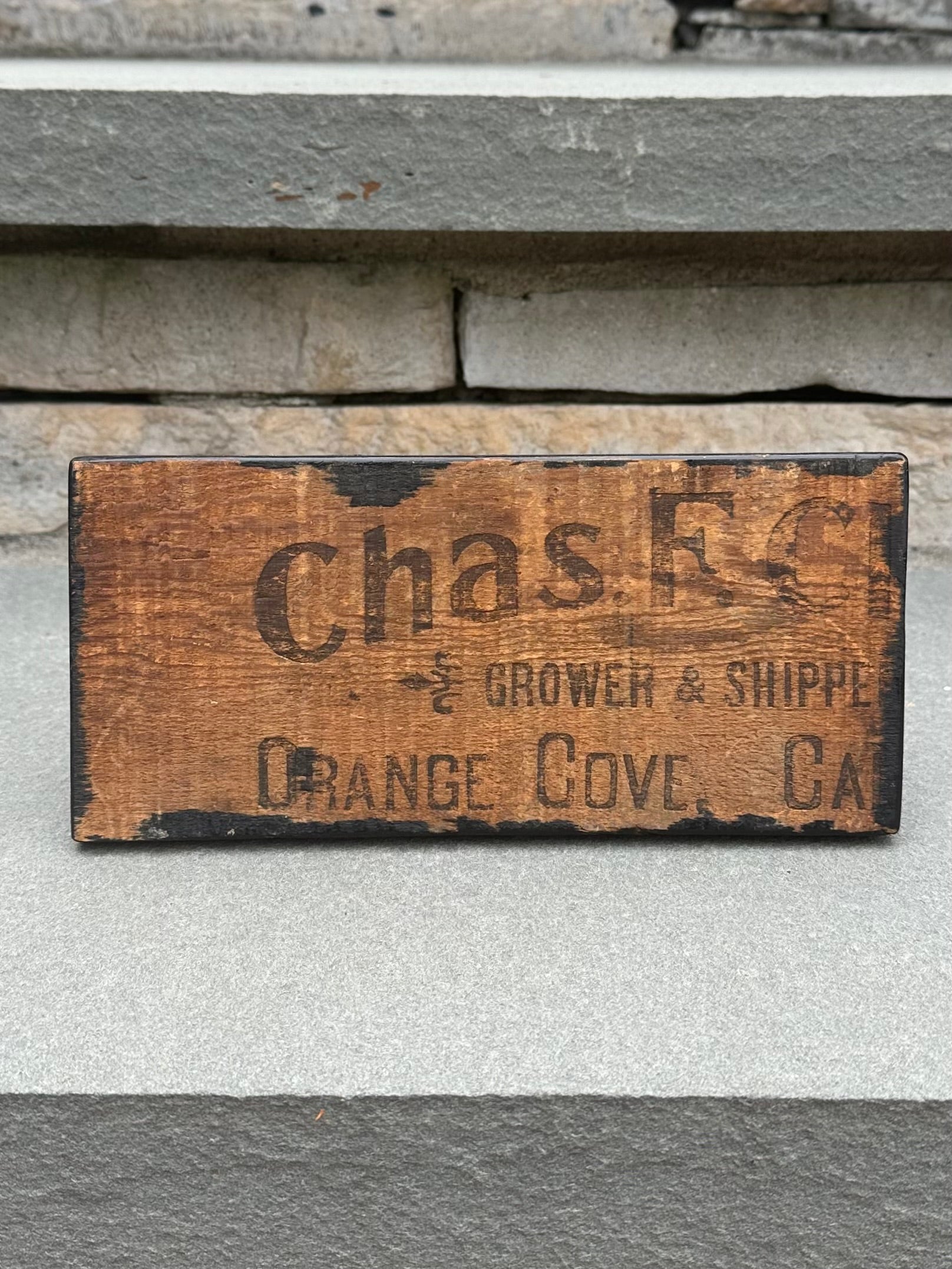 A Gilbert alarm clock mounted onto a piece of an old wooden shipping crate. Underside of base reads "Chas. F.C. Grower & Shipper, Orange Cove, CA". Very unique, one of a kind piece.