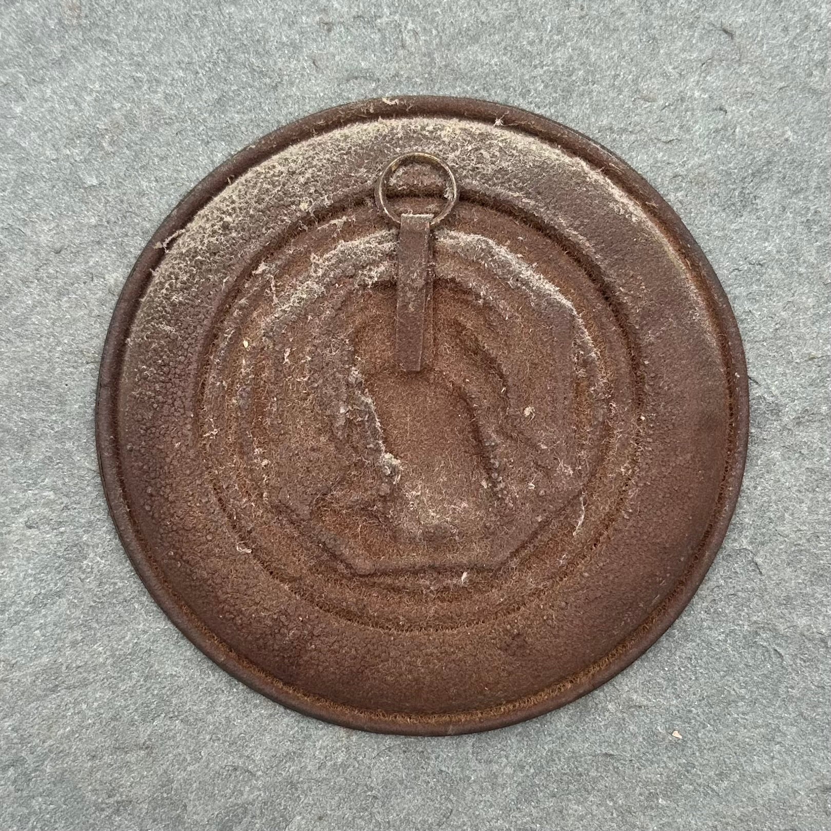 Measures approximately 4 inches in diameter. Back is affixed with a small metal loop for wall hanging.