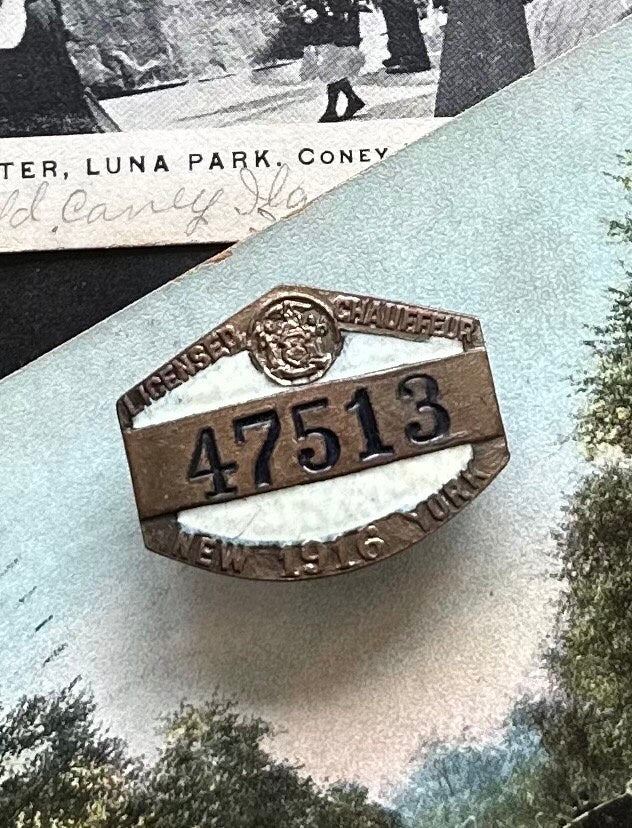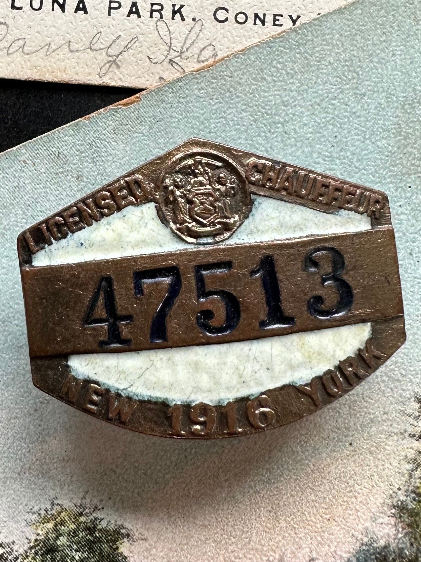Top of badge reads “Licensed Chauffeur” with emblem of justice, followed by ID number “47513”, and “New York 1916”.