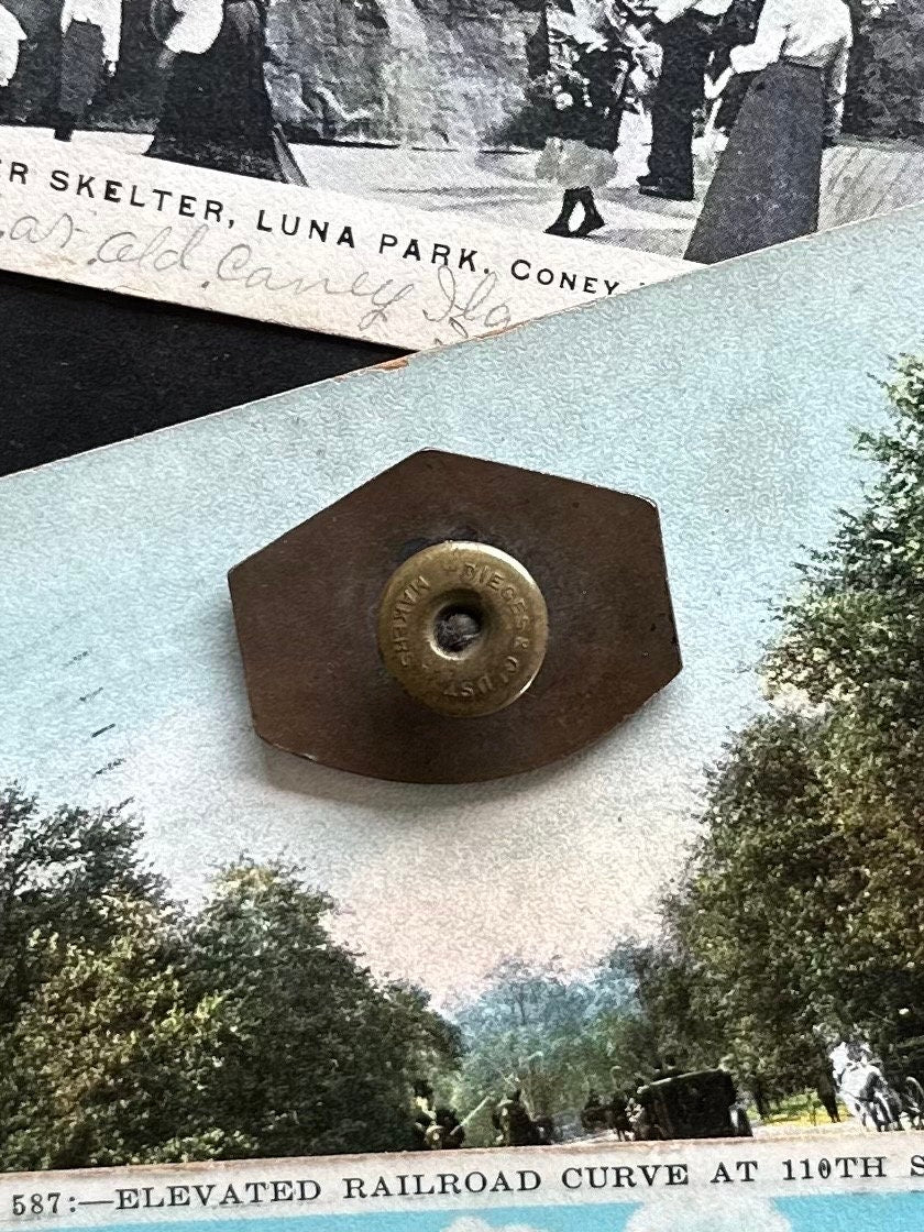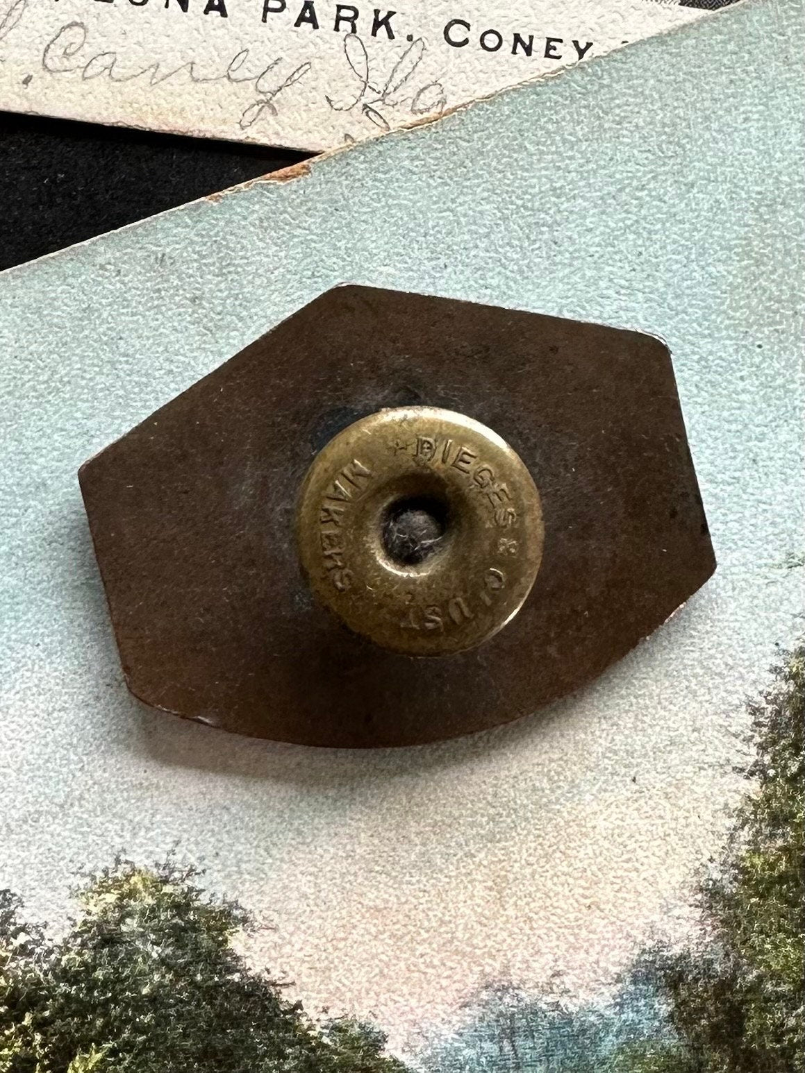Back of pin has a screw mechanism for wearing, and reads “Dieges & Clust Makers”.