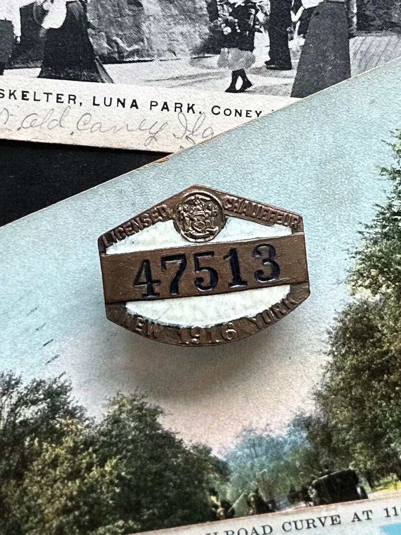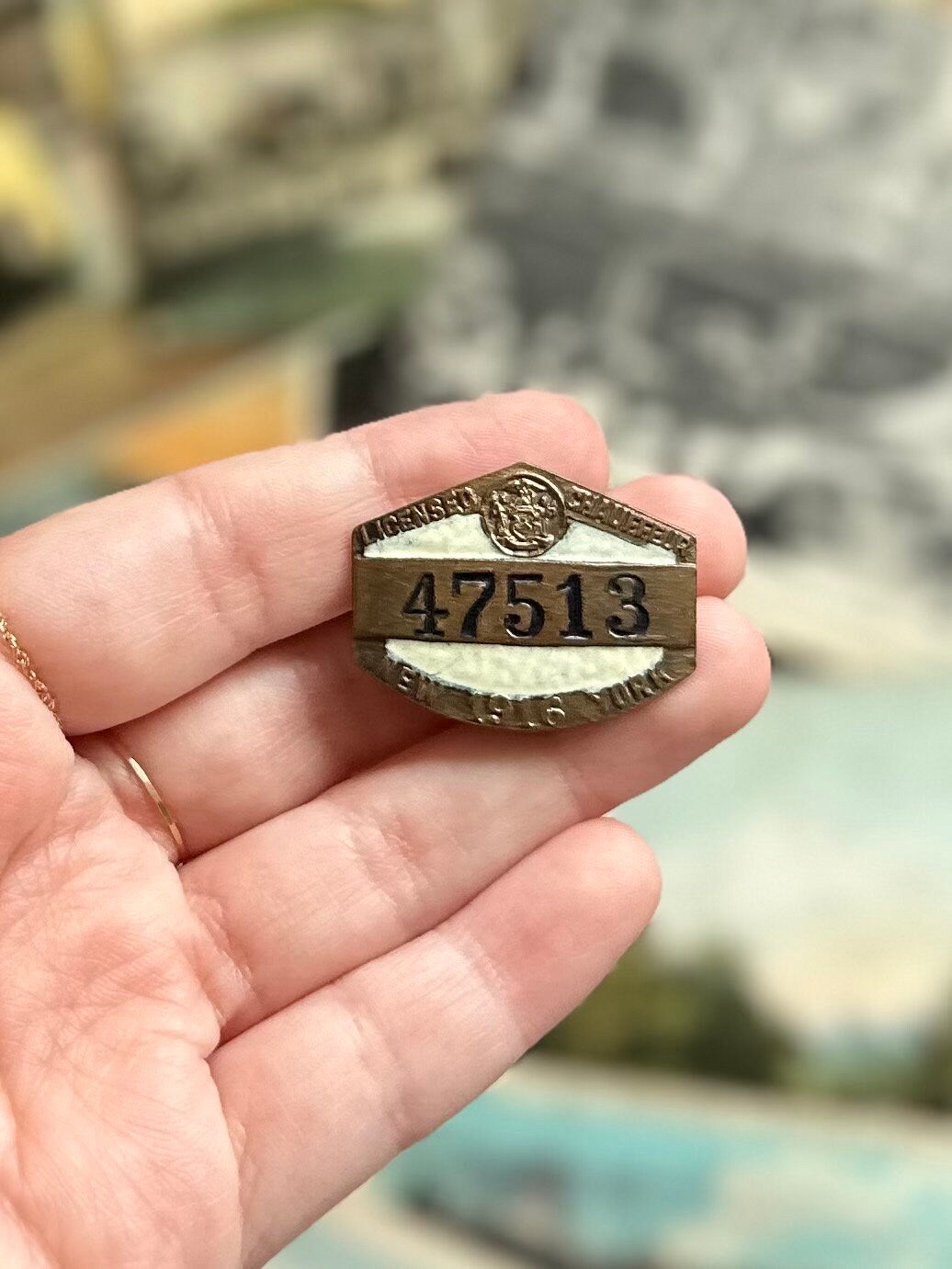 Antique Early 1900s Licensed Chauffeur Badge ID No. 47513 Pin New York NYC 1916