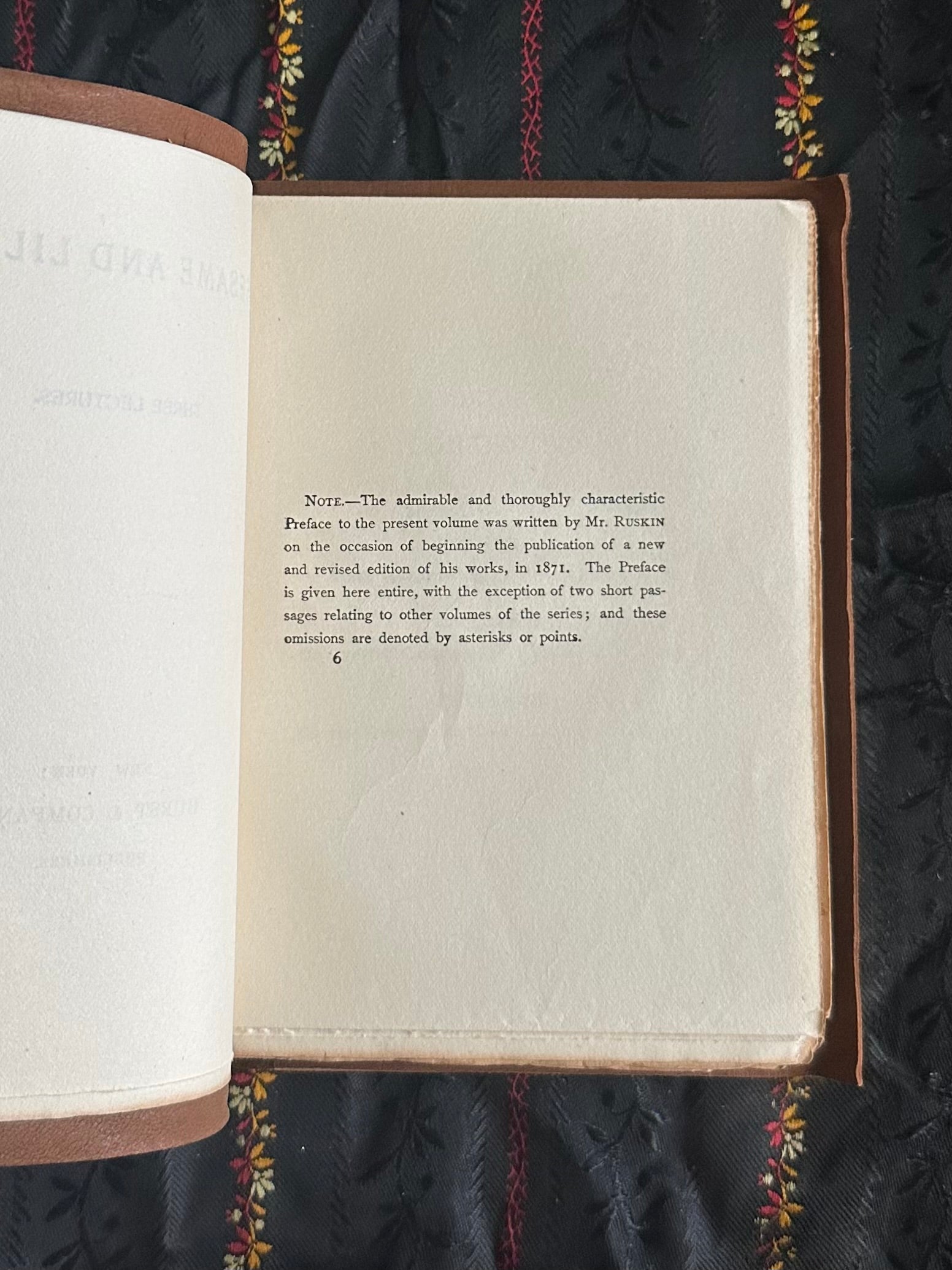 Front page reads "The admirable and thoroughly characteristic Preface to the present volume was written by Mr. Ruskin on the occasion of beginning the publication of a new and revised edition of his works, in 1871. The Preface is given here entire, with the exception of two short passages relating to other volumes of the series; and these omissions are denoted by asterisks or points."