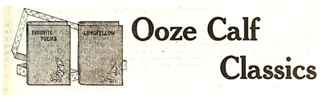 "A beautiful line of dainty gift books containing the very cream of literature. These charming volumes are bound in genuine Ooze Calf, with titles in gold. Gold tops. Each book with uncut edges, fancy end sheets...".