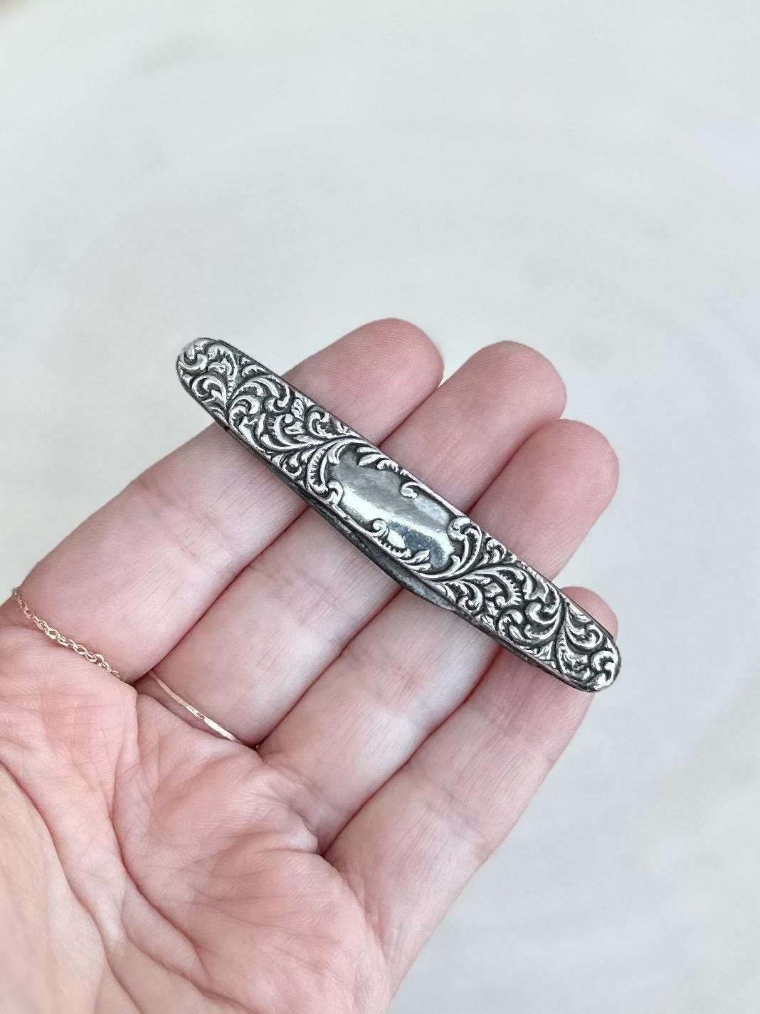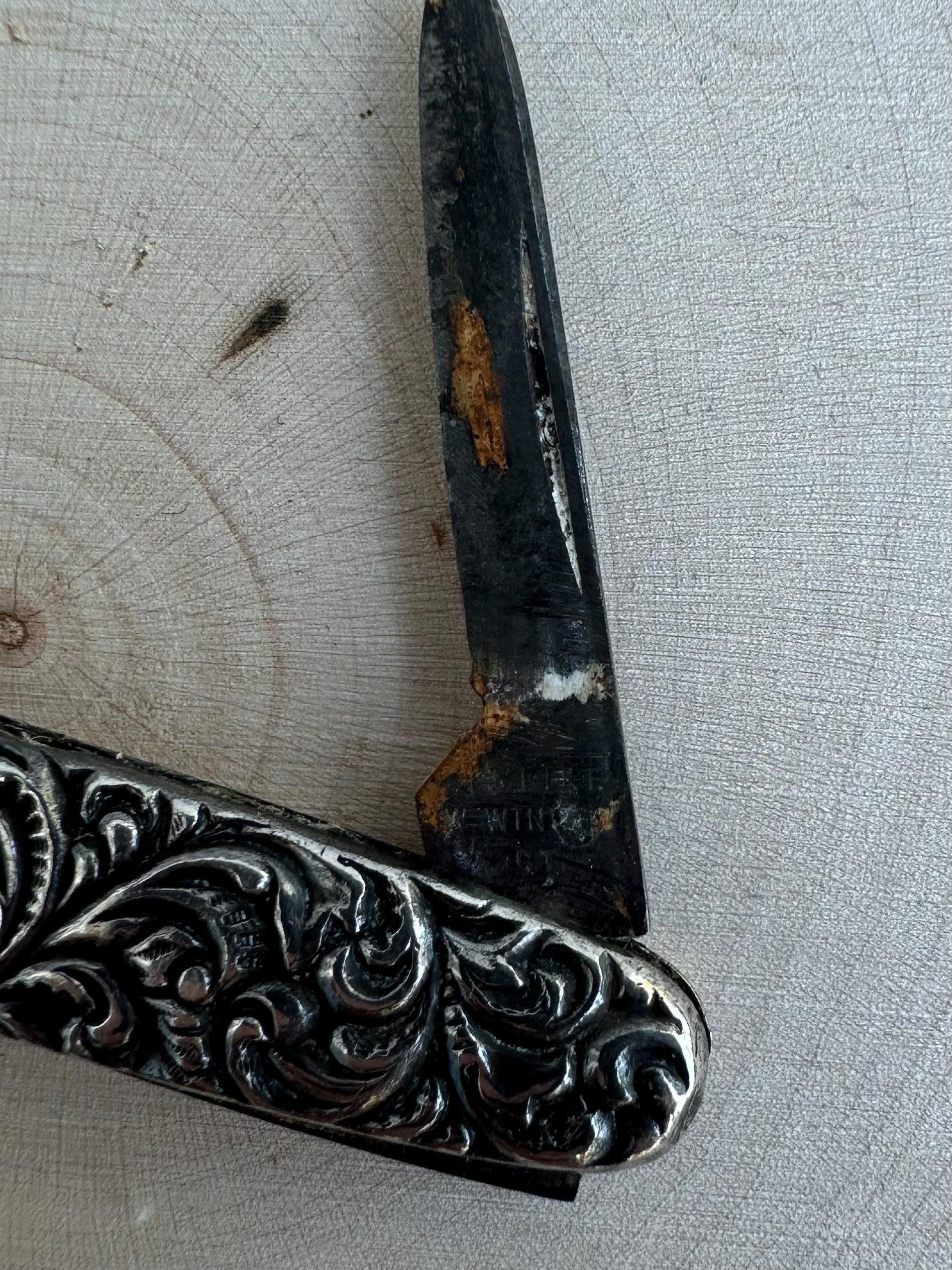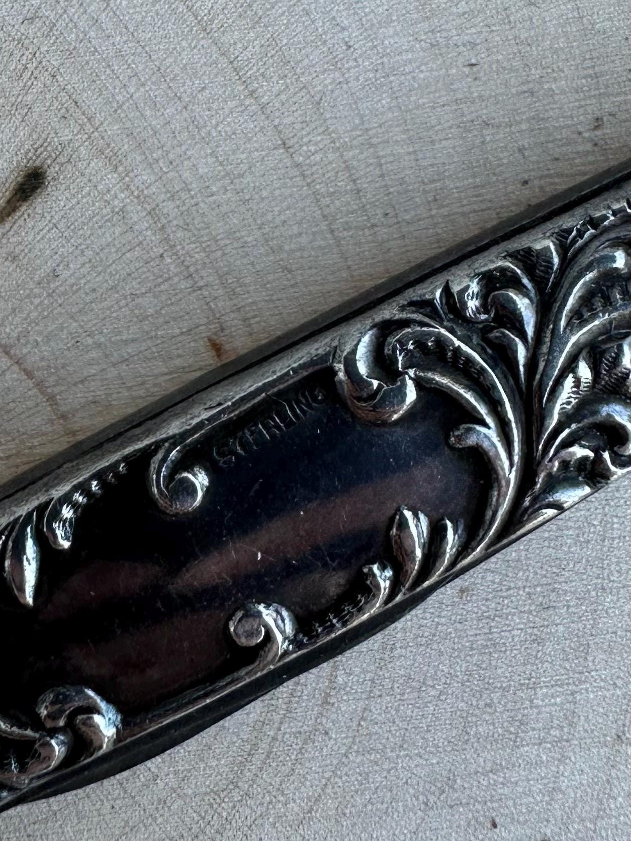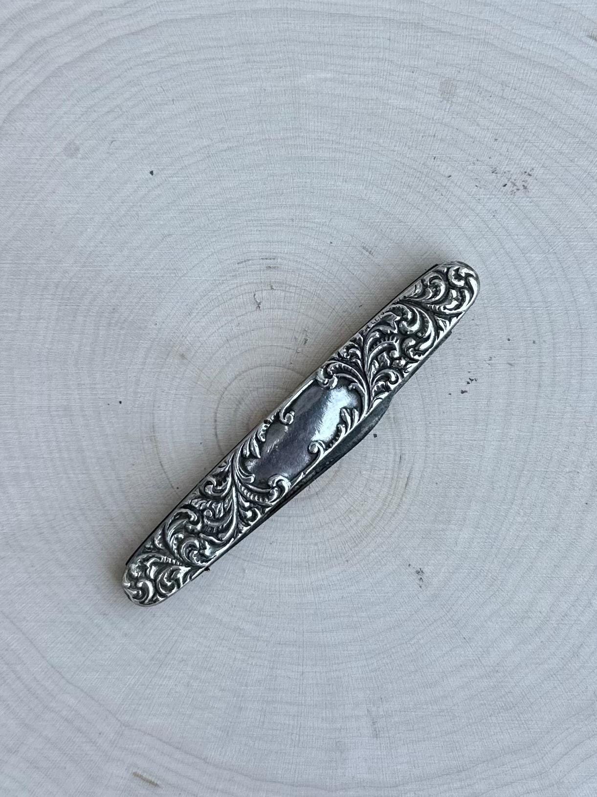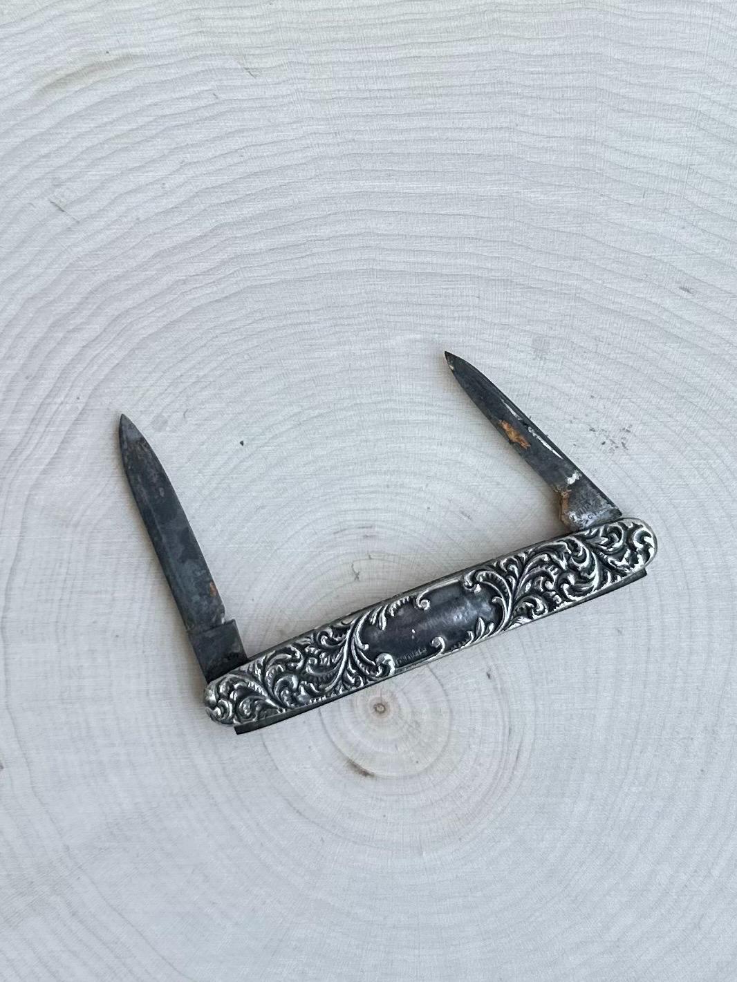 This is an antique sterling silver double blade pocket knife by Empire Co, WINSTED CT. Intricate raised design with black space in the center for engraving.