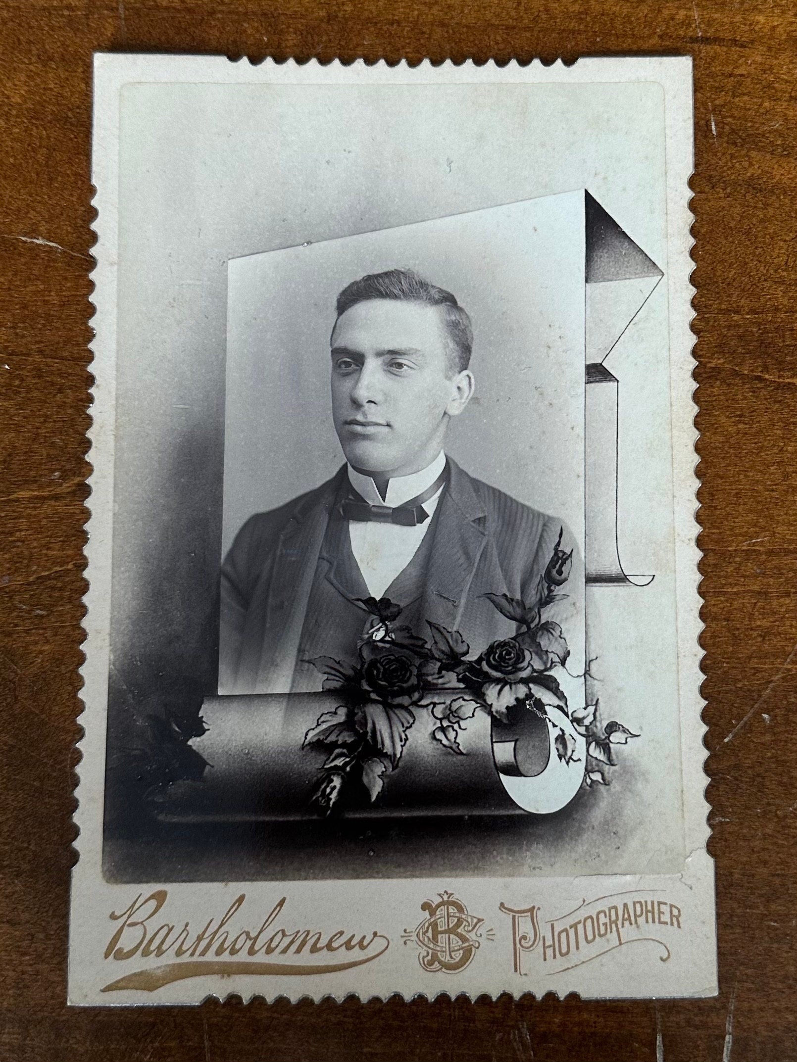 Antique Late 1800s Cabinet Card Portrait of Man Roses & Scroll Design