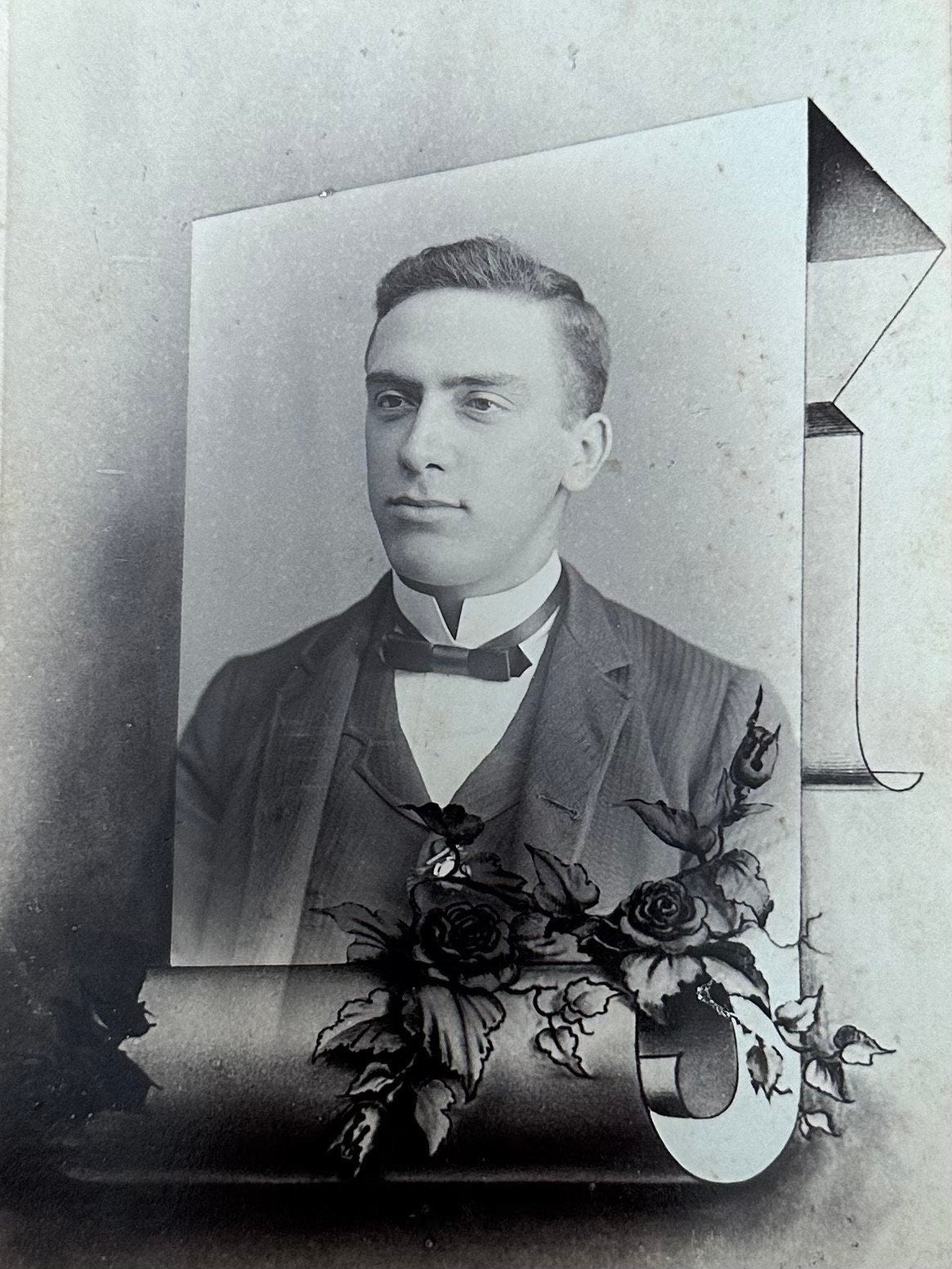 Portrait photo of a young man in period dress. Beautifully decorated with roses and the man’s photo encapsulated in a scroll design. A wonderful representation of 19th Century photography.