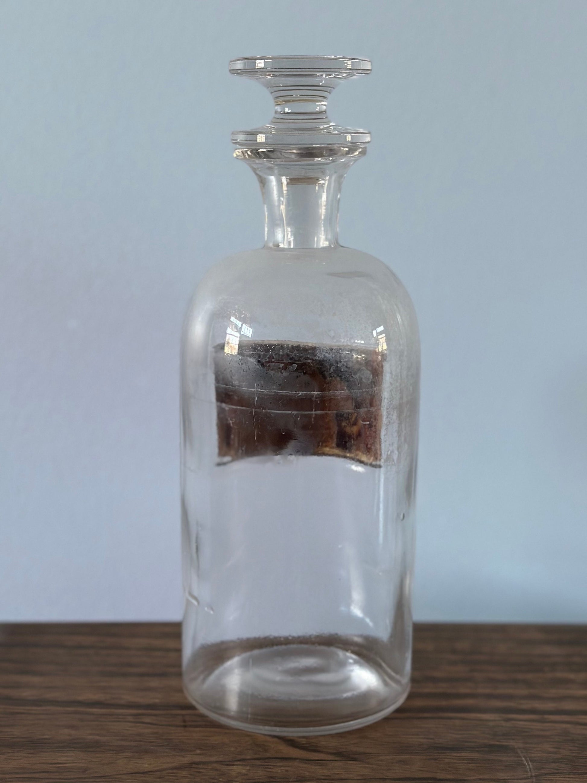 In good condition for its age. Stopper has a few small chips and drug label appears to be cracked underneath but is smooth to the touch.
