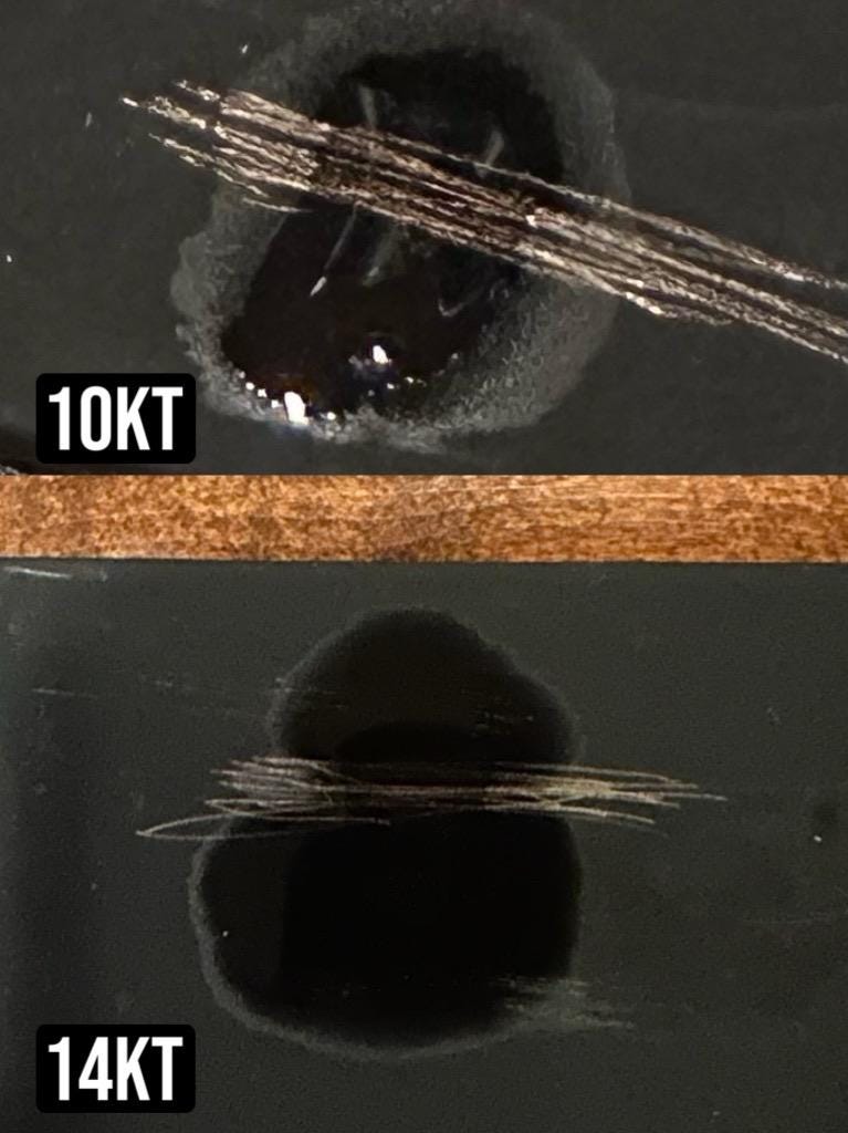 Has tested as 10kt-14kt gold (see last photo for acid tests).