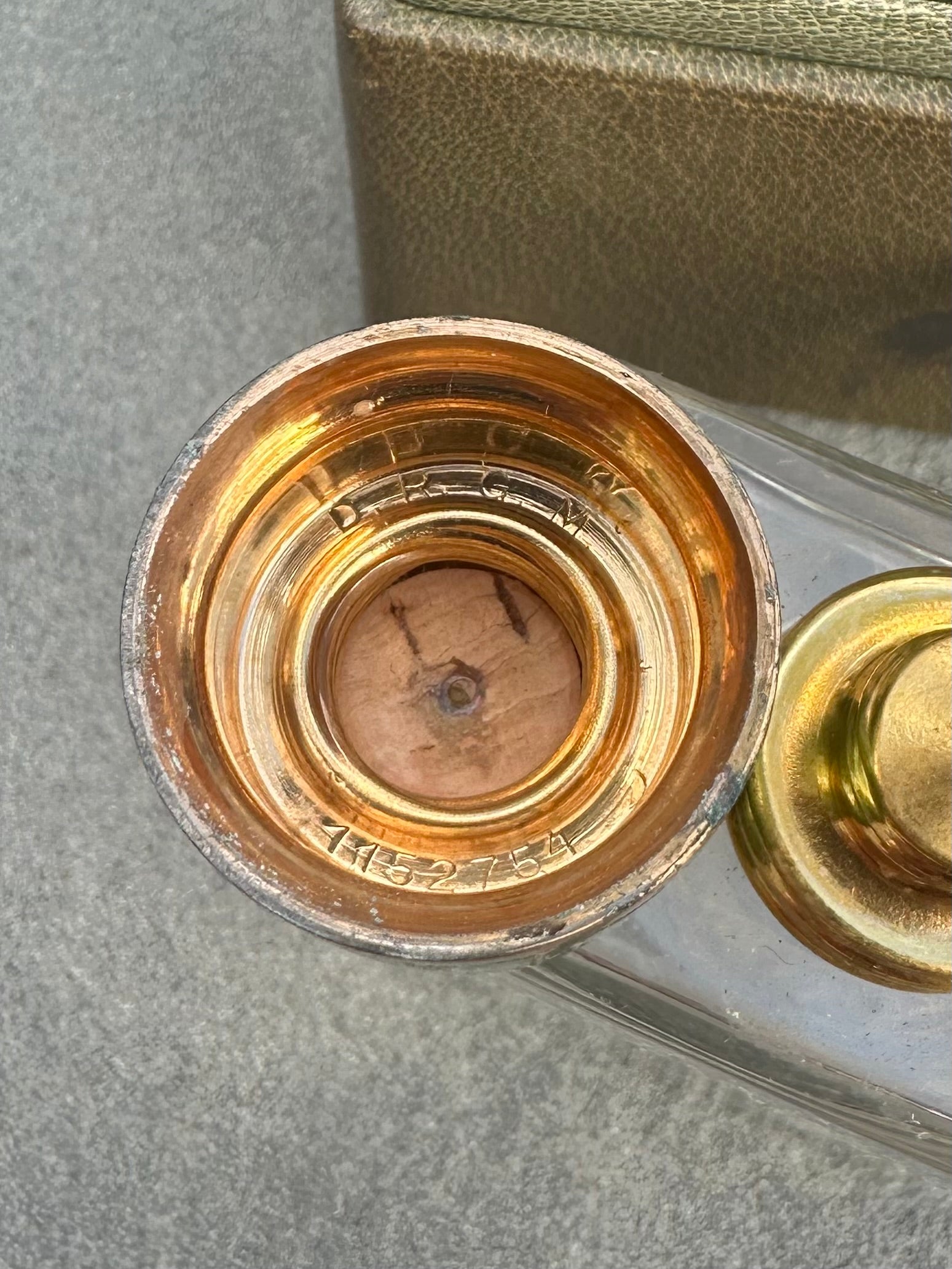They have green and gold tone guilloche enamel screw caps. Caps have cork inside. Inside of caps are stamped "D.R.G.M." & "1152754". Outside of caps are stamped "GERMANY".