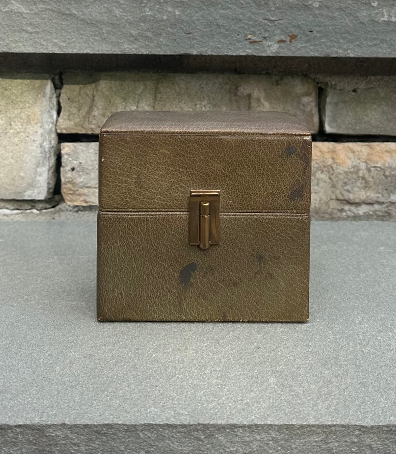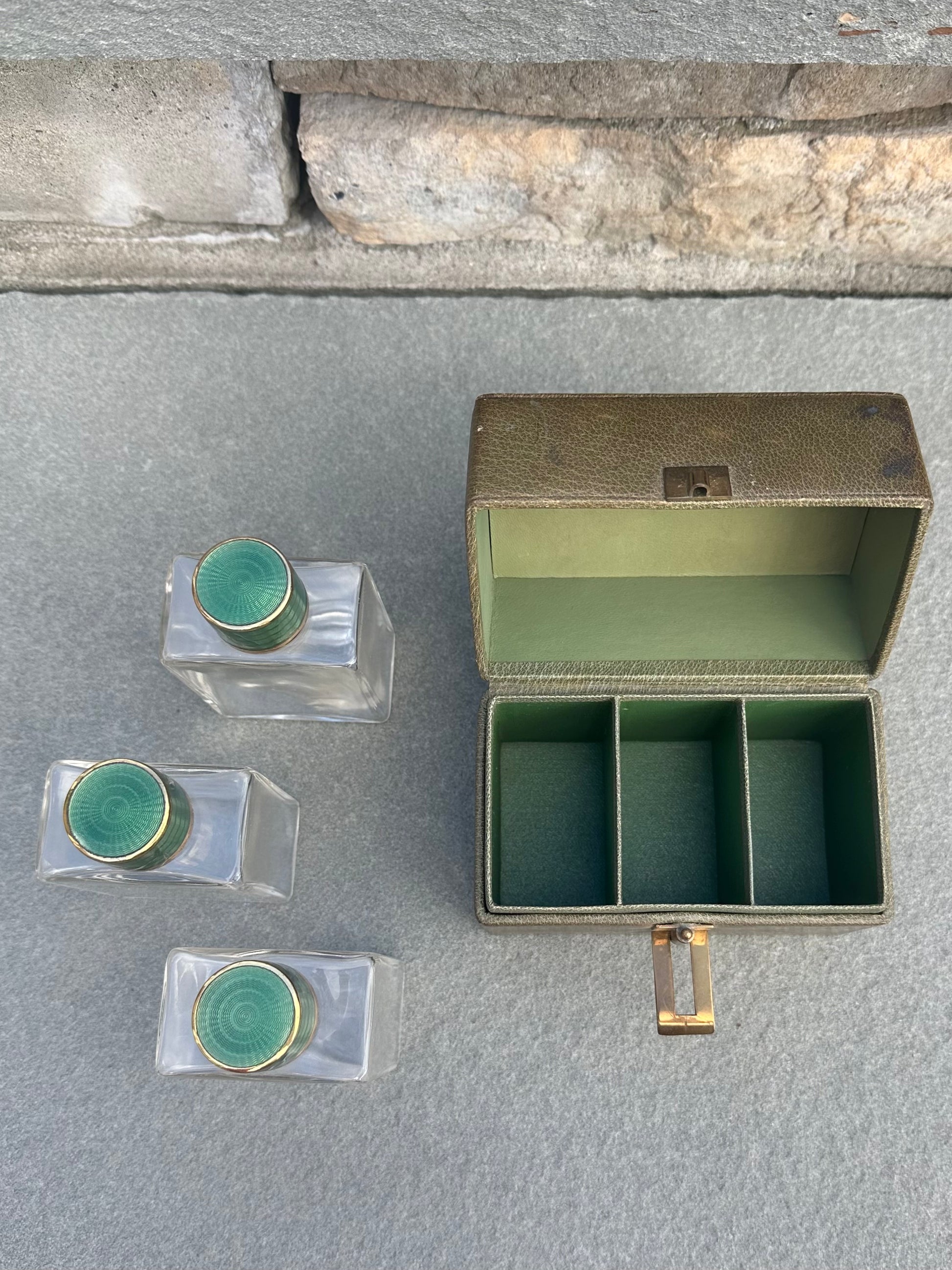 Art Deco 1920s 1930s German Guilloche Enamel & Glass Travel Perfume Cologne Bottles in Green Traveling Case