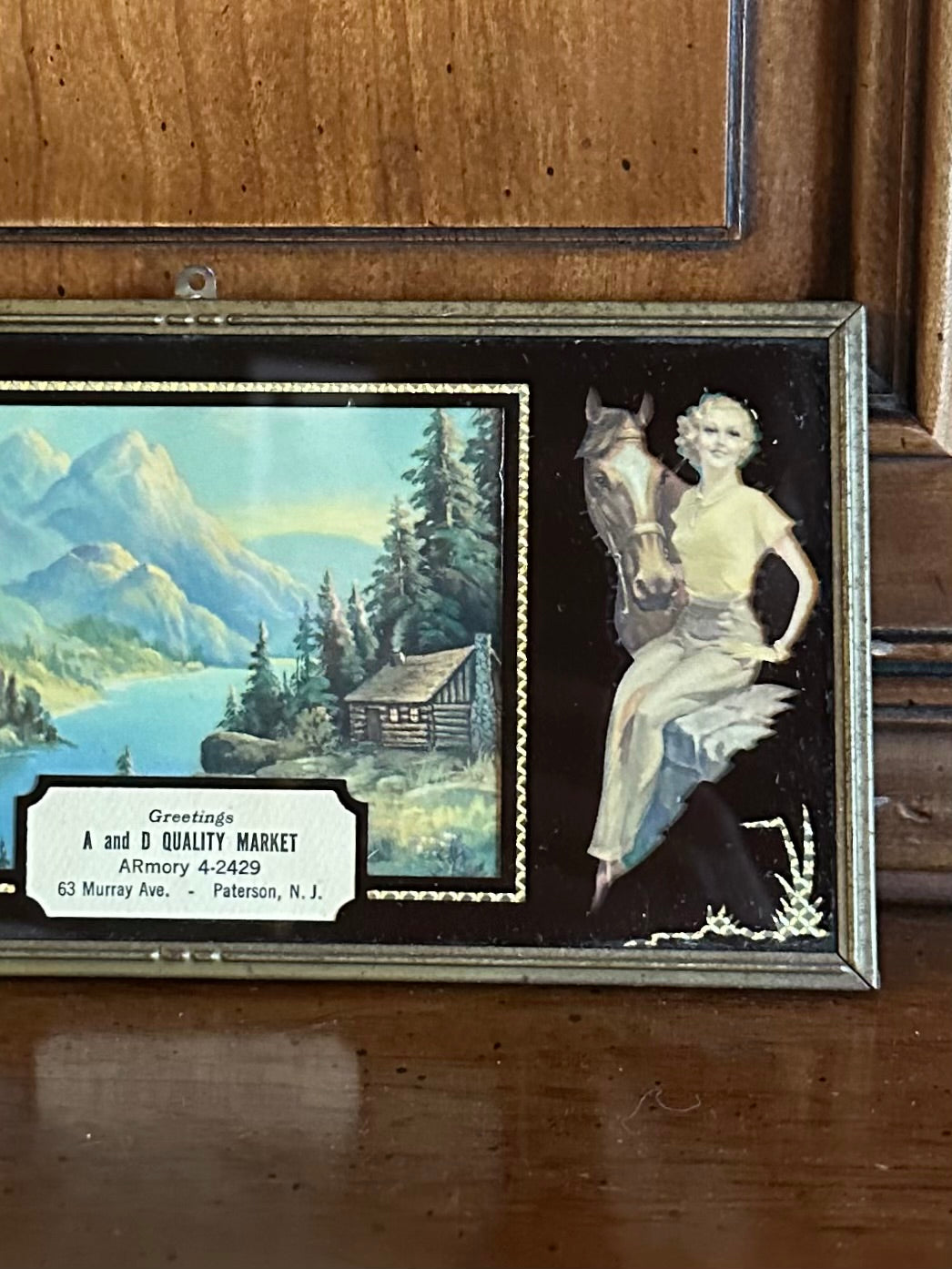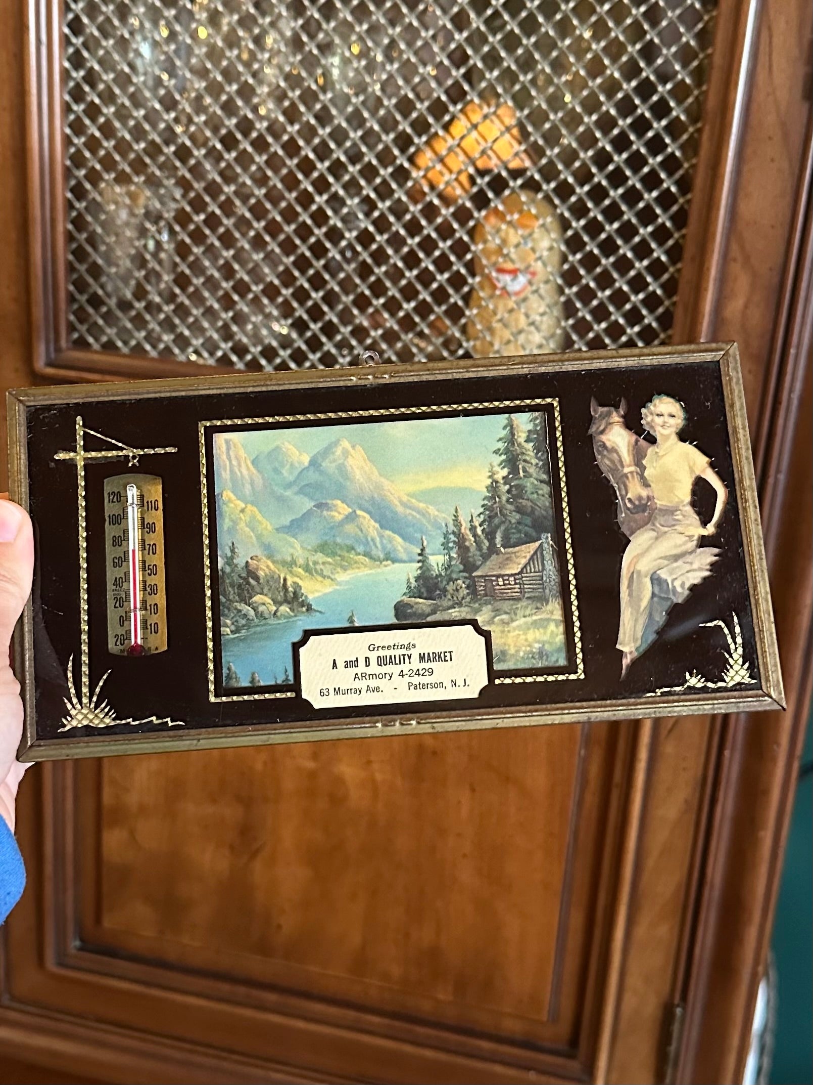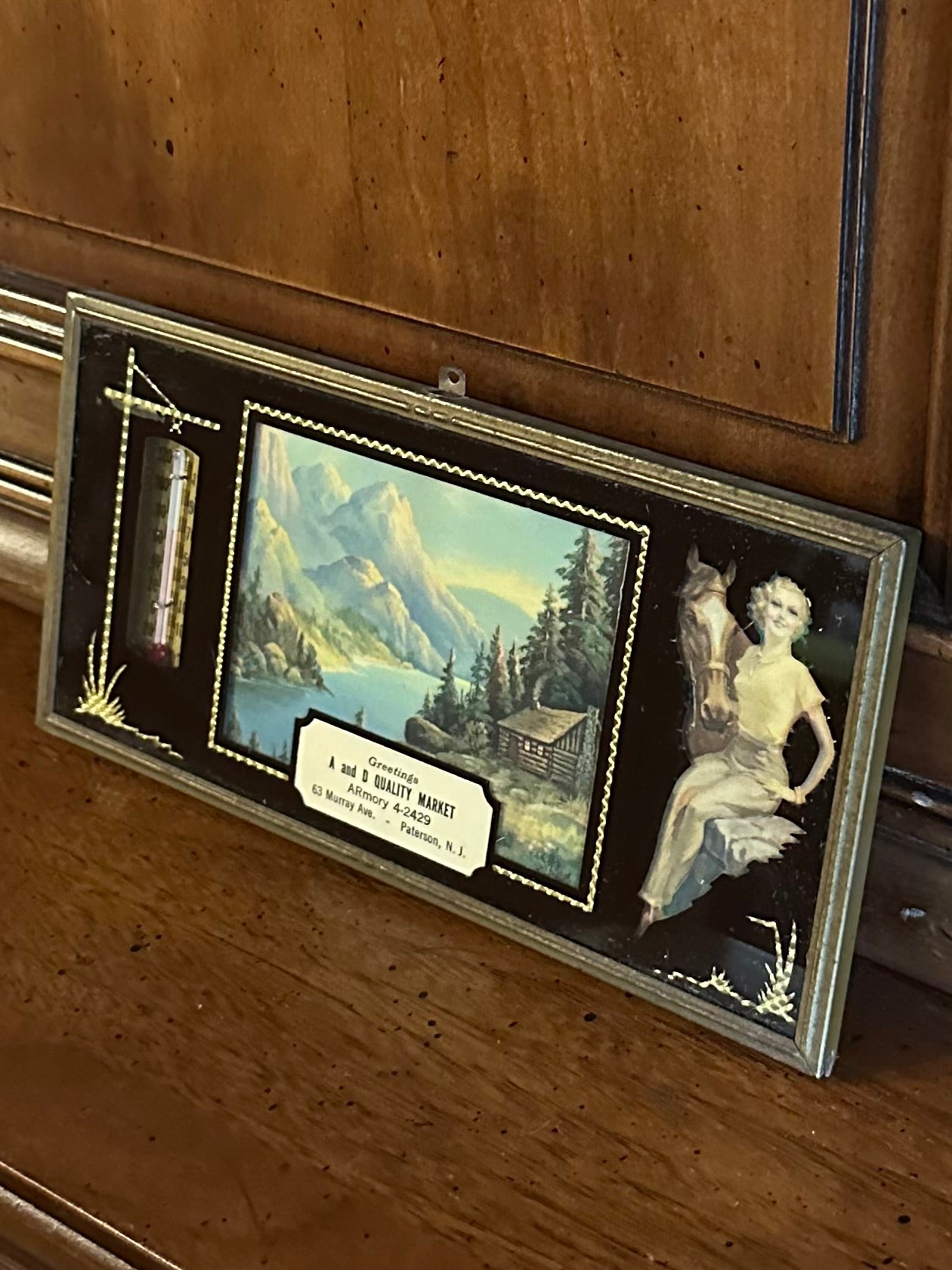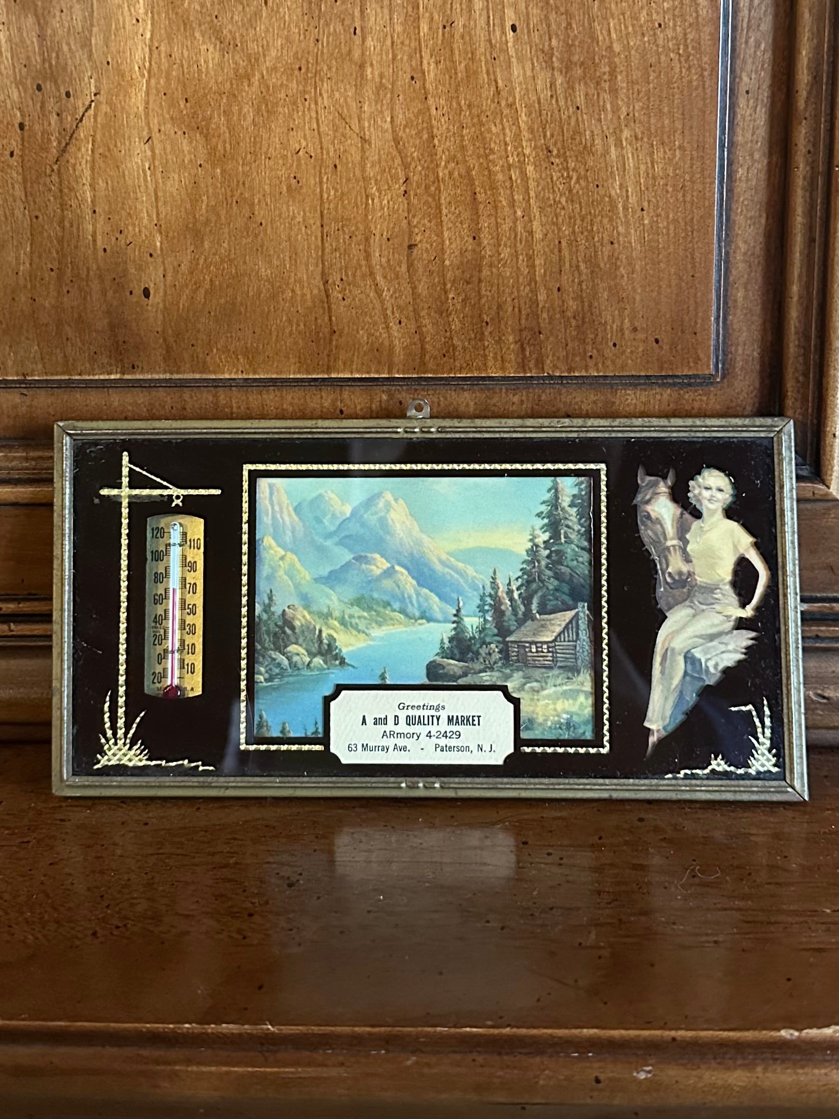 Vintage reverse painted advertising thermometer compliments of A and D Quality Market, 63 Murray Ave, Paterson, NJ. Features a pin up and horse. Thermometer is in working order!