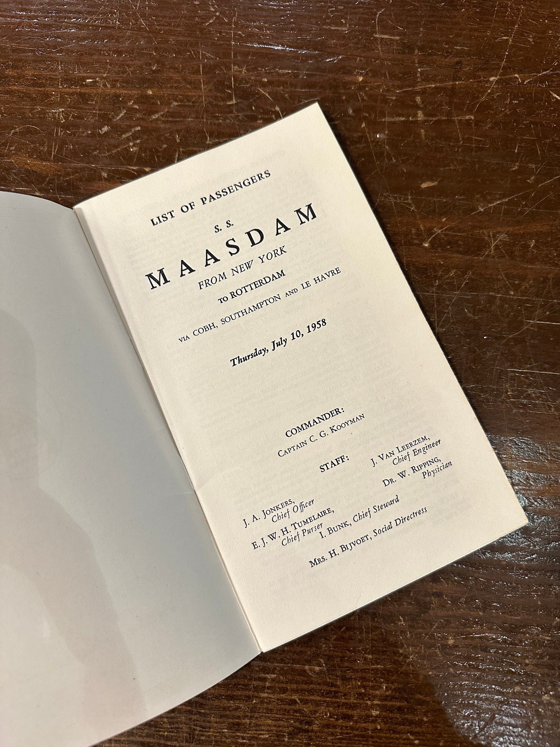 - A list of passengers booklet from the Holland-American Line cruise ship from July 10, 1958, departing from New York to Rotterdam