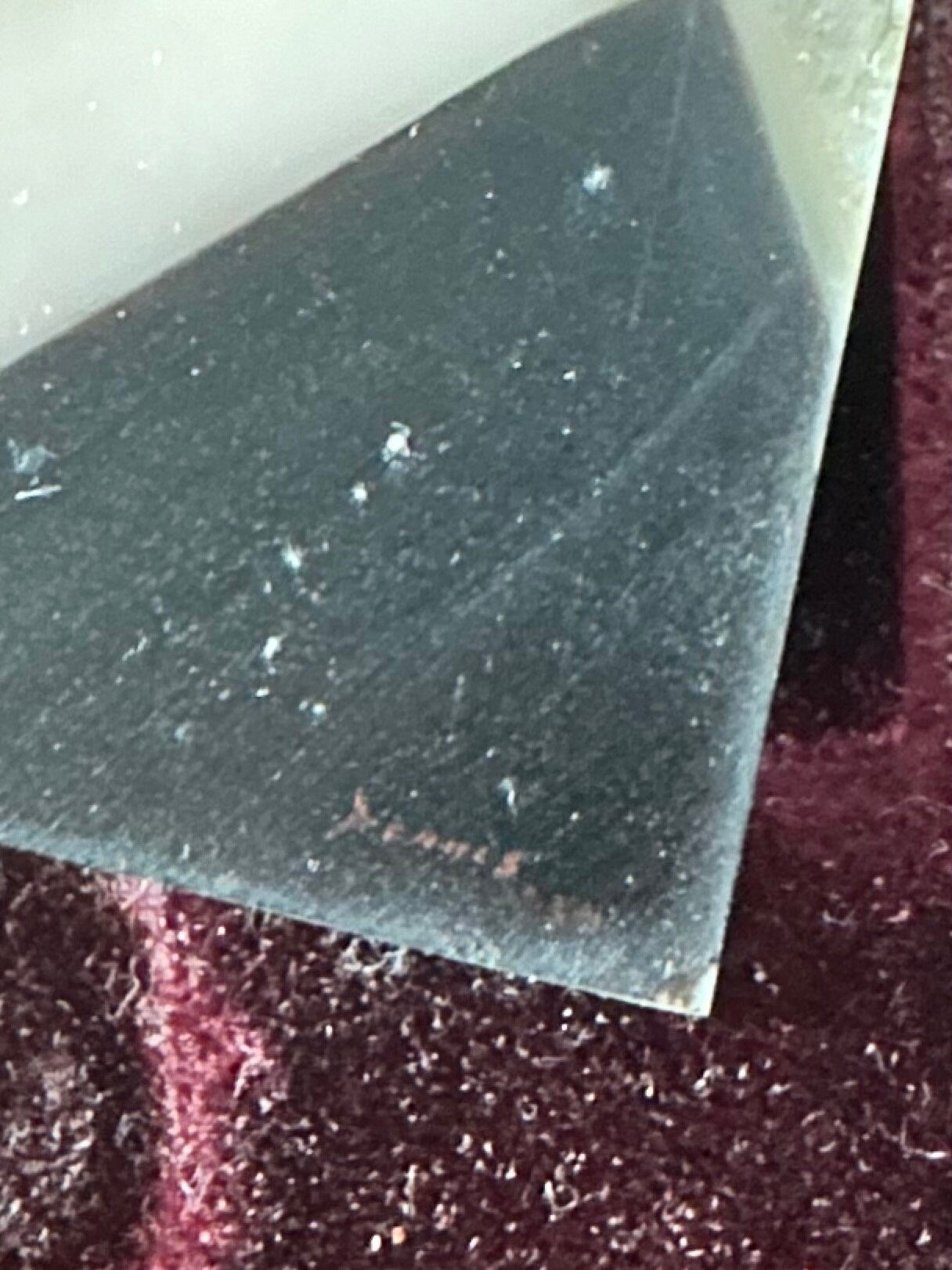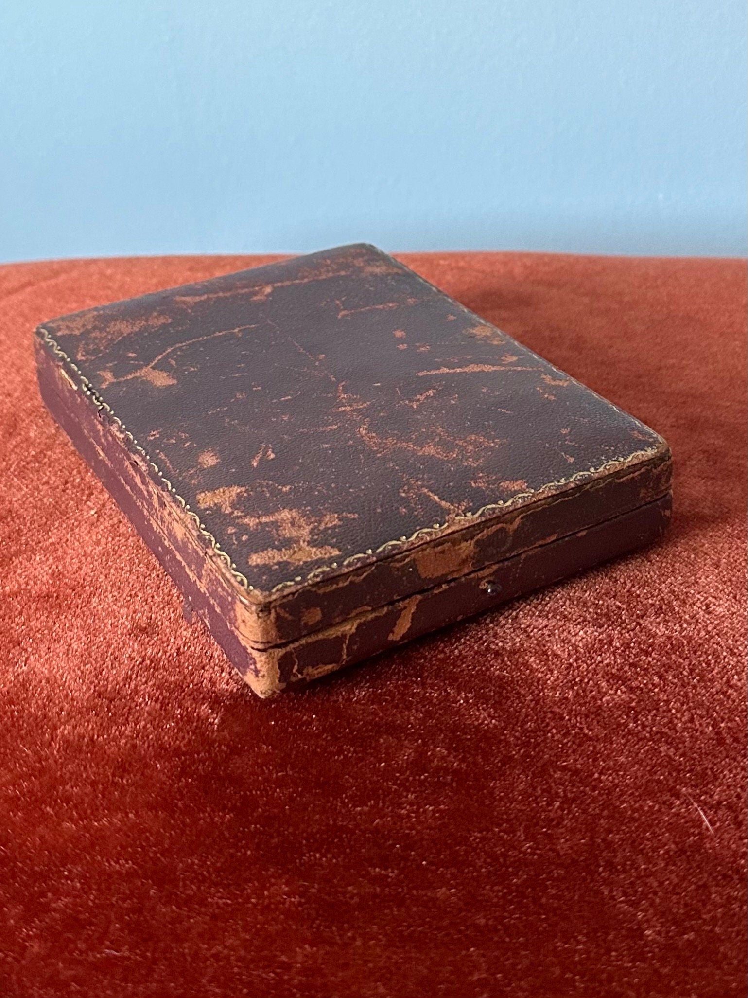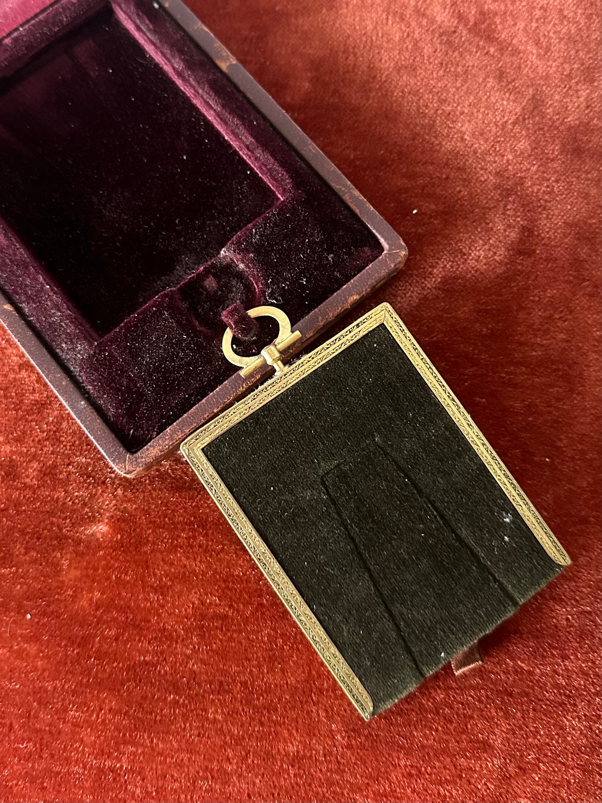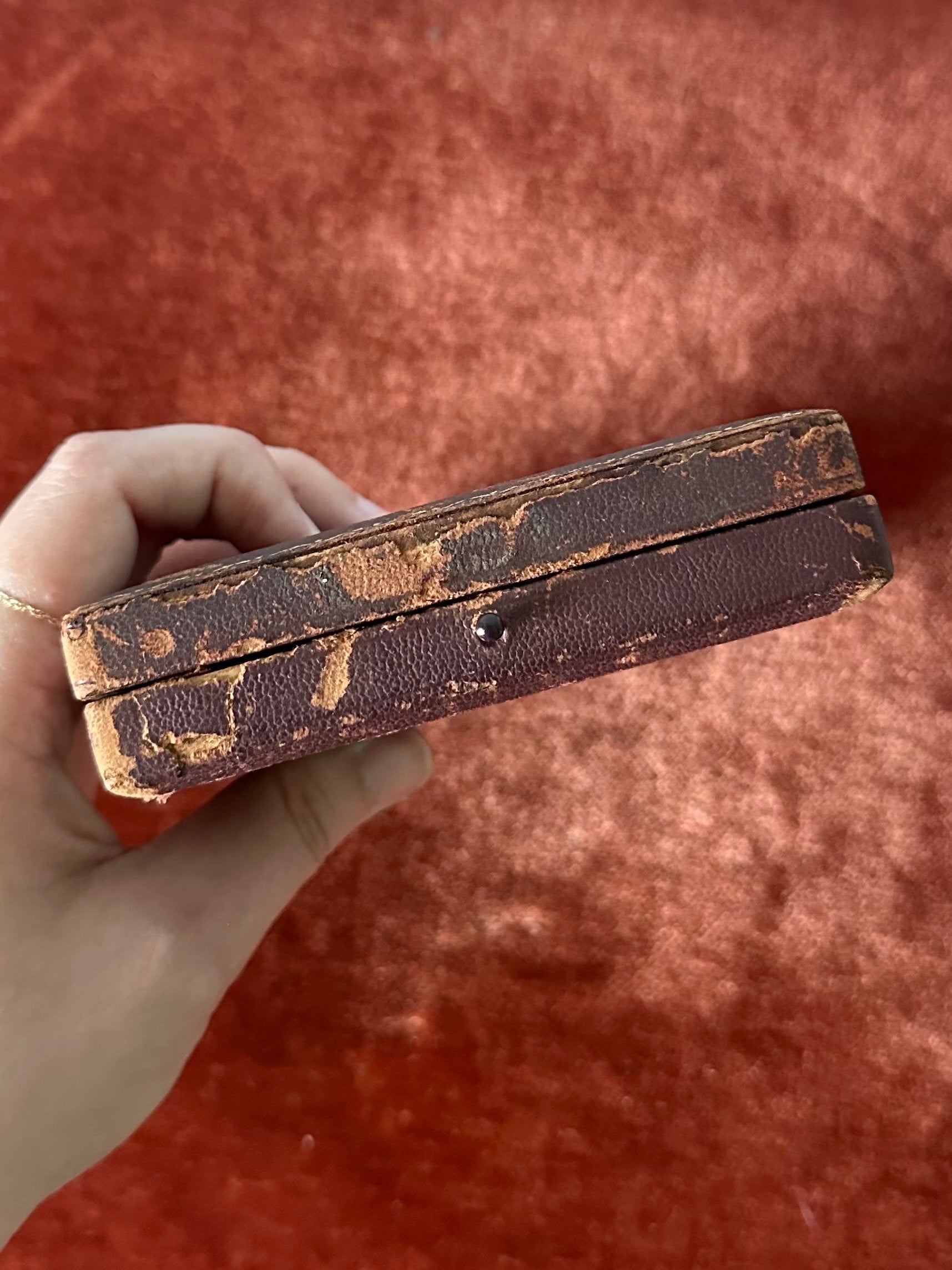 Brass frame has a convex glass cover and is affixed with a decorative hook at the top that latches securely into leather case. The back of the frame is velvet and has an easel back. Frame fits perfectly into case. On the inside of the case, one side has a maroon velvet, and the other side has a slightly less darker maroon satin.