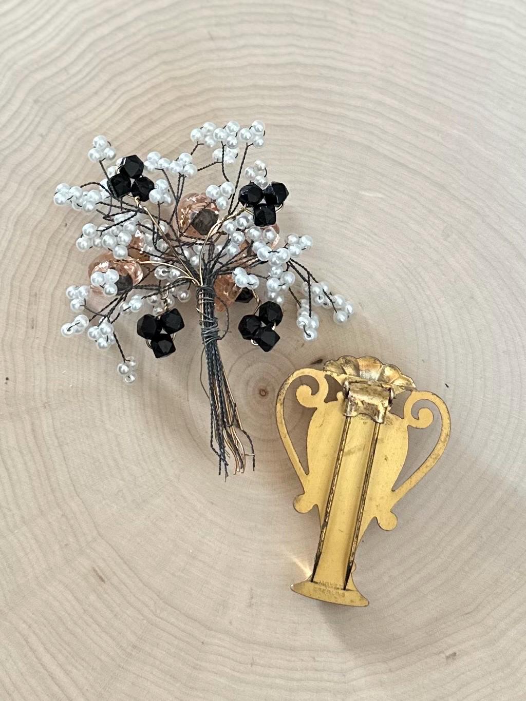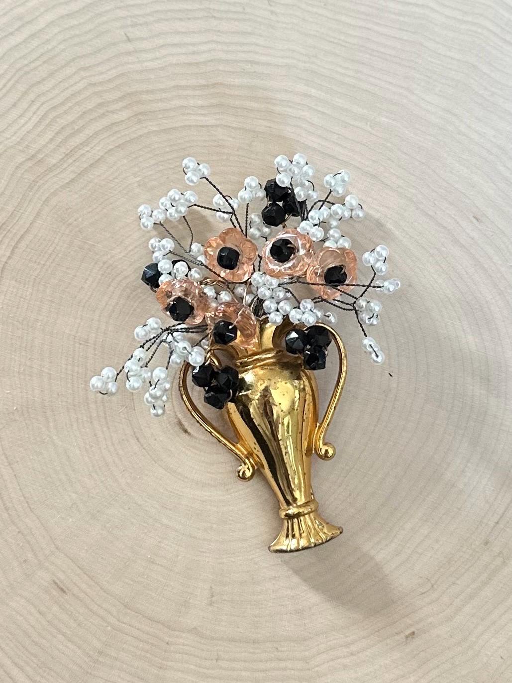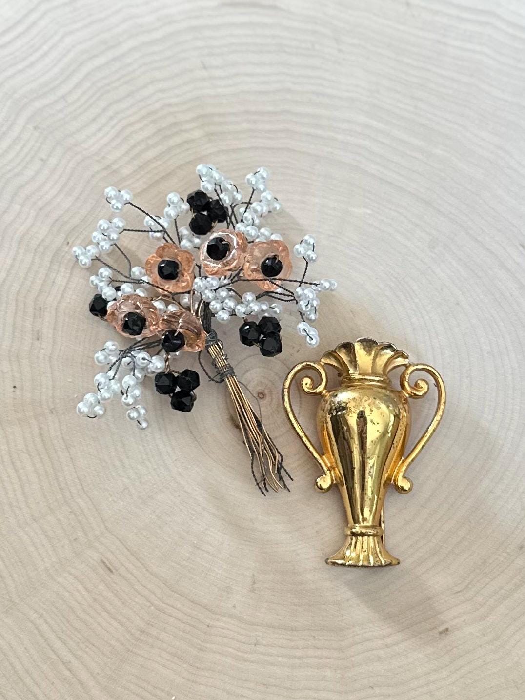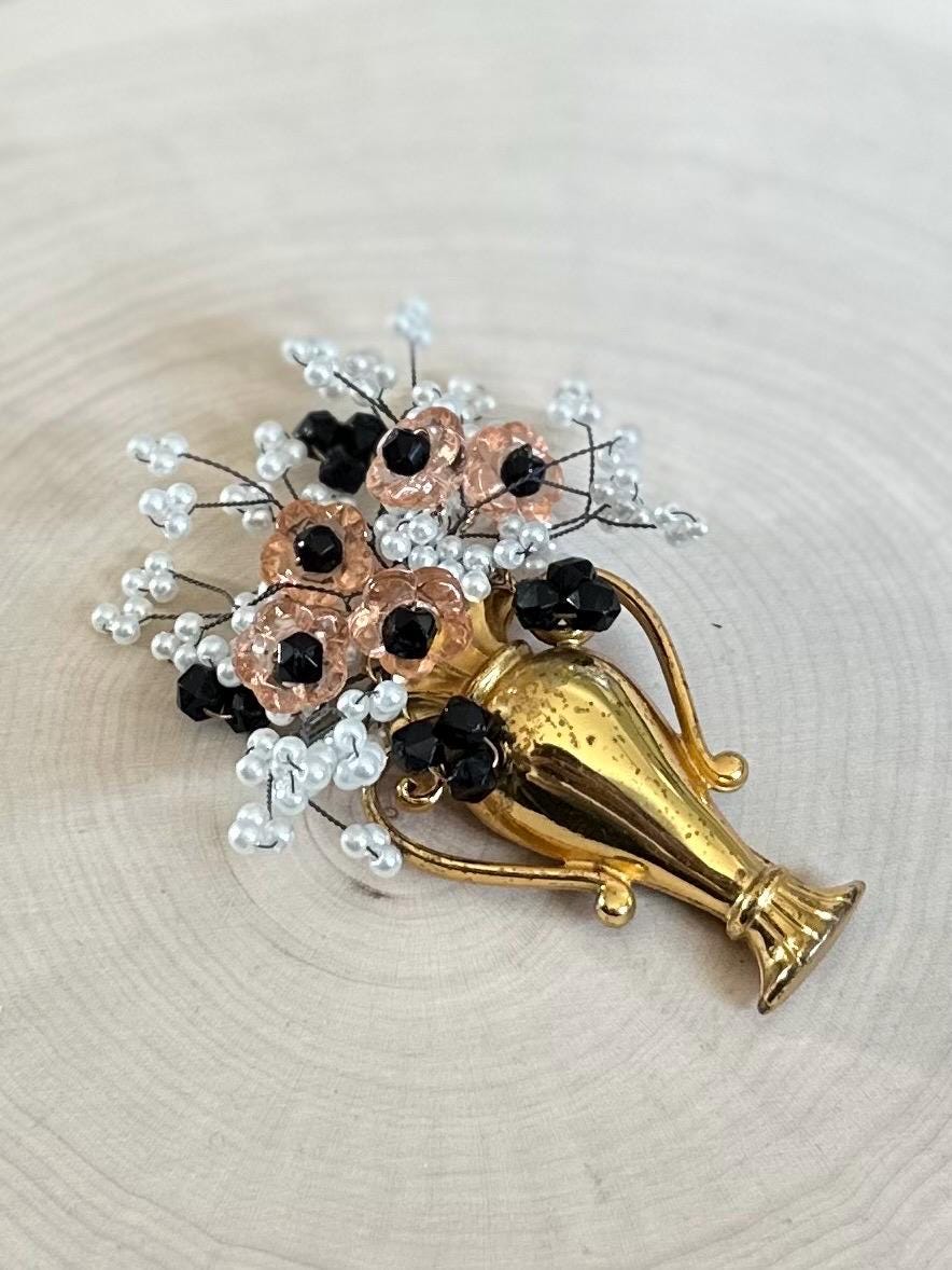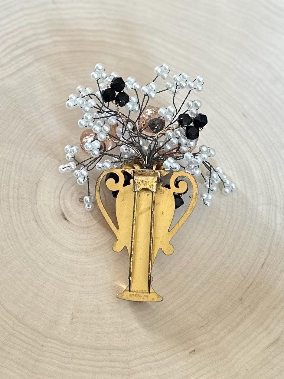 1940s 1950s Signed MONET Sterling Silver & Gold Vermeil Urn Brooch Fur Clip with Hand Beaded Wire Wrapped Beaded Flower Bouquet