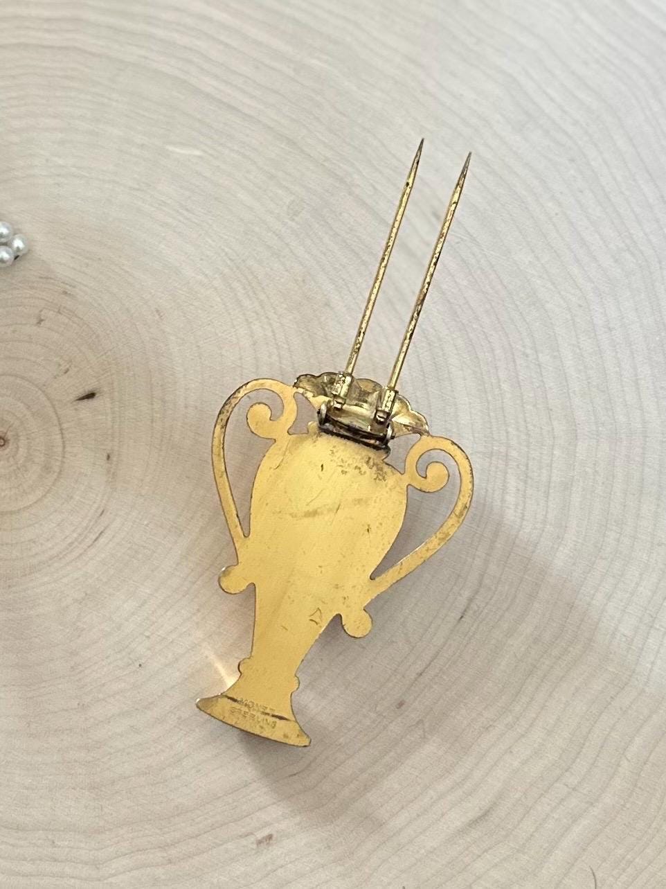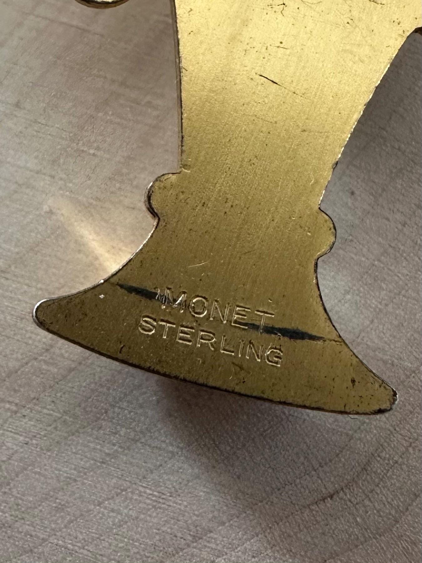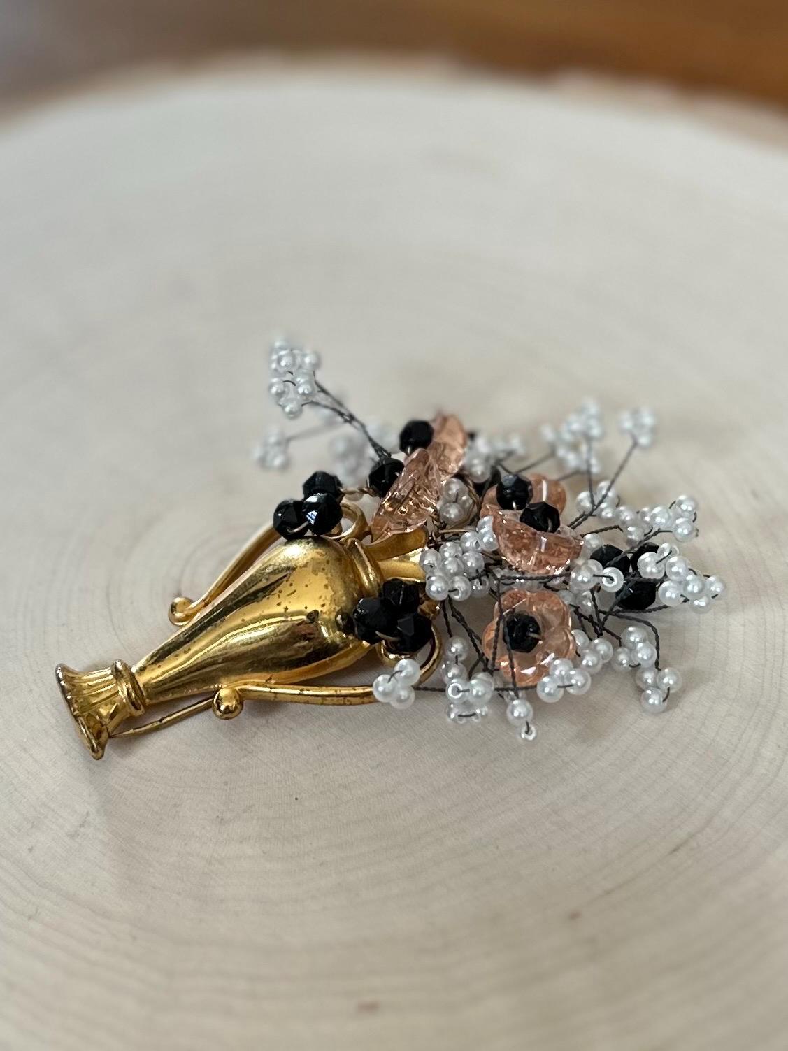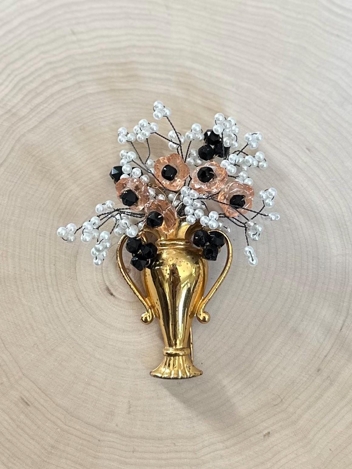1940s 1950s Signed MONET Sterling Silver & Gold Vermeil Urn Brooch Fur Clip with Hand Beaded Wire Wrapped Beaded Flower Bouquet