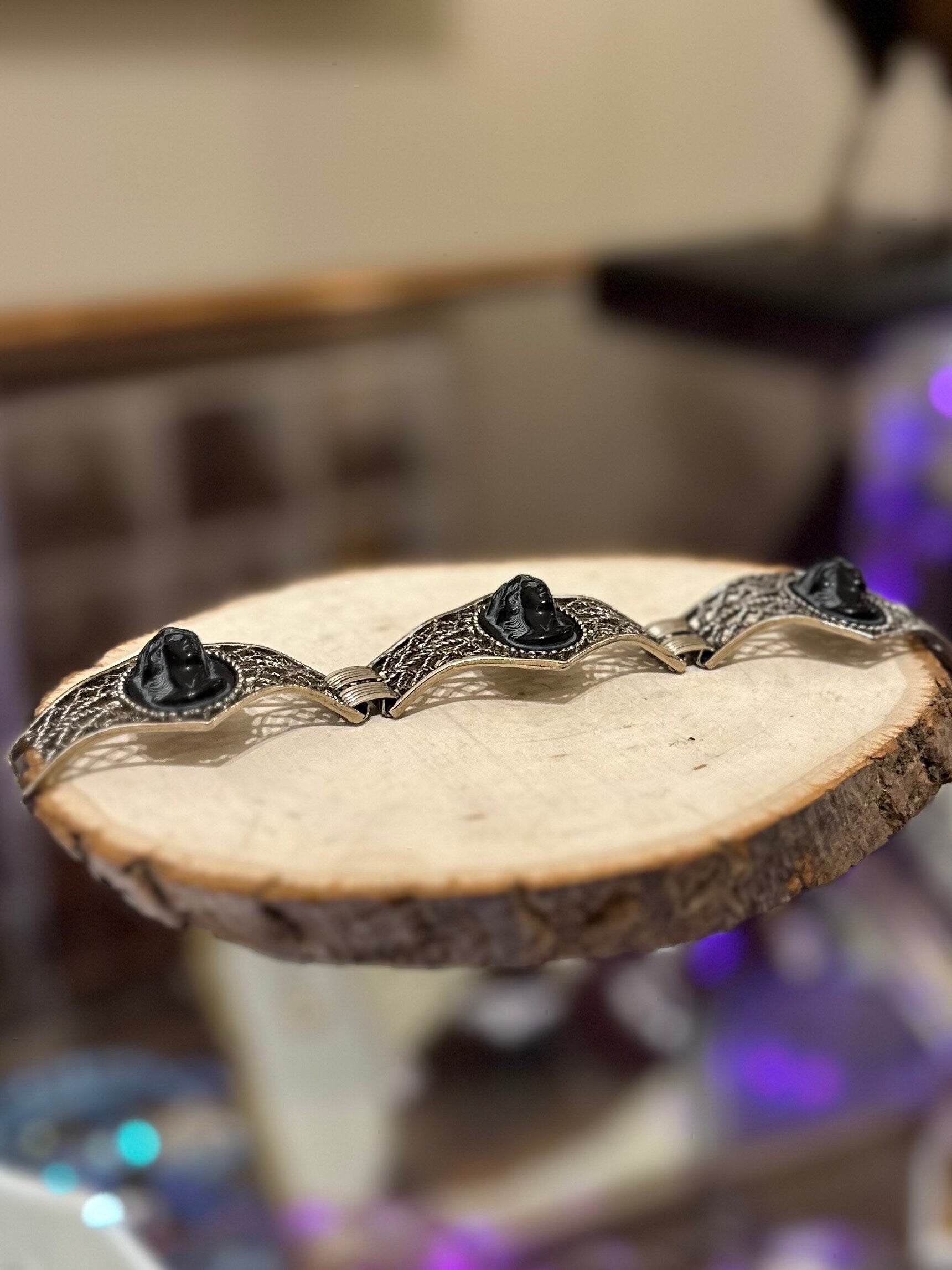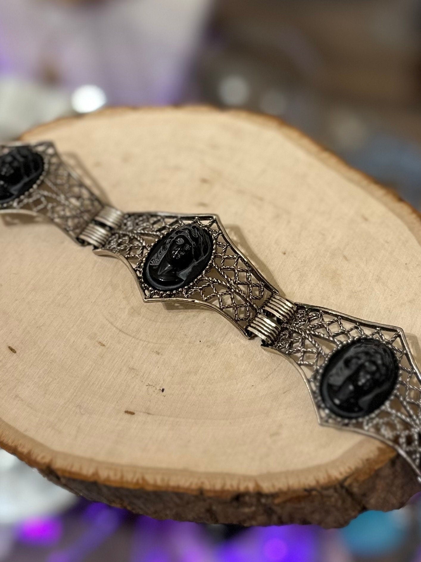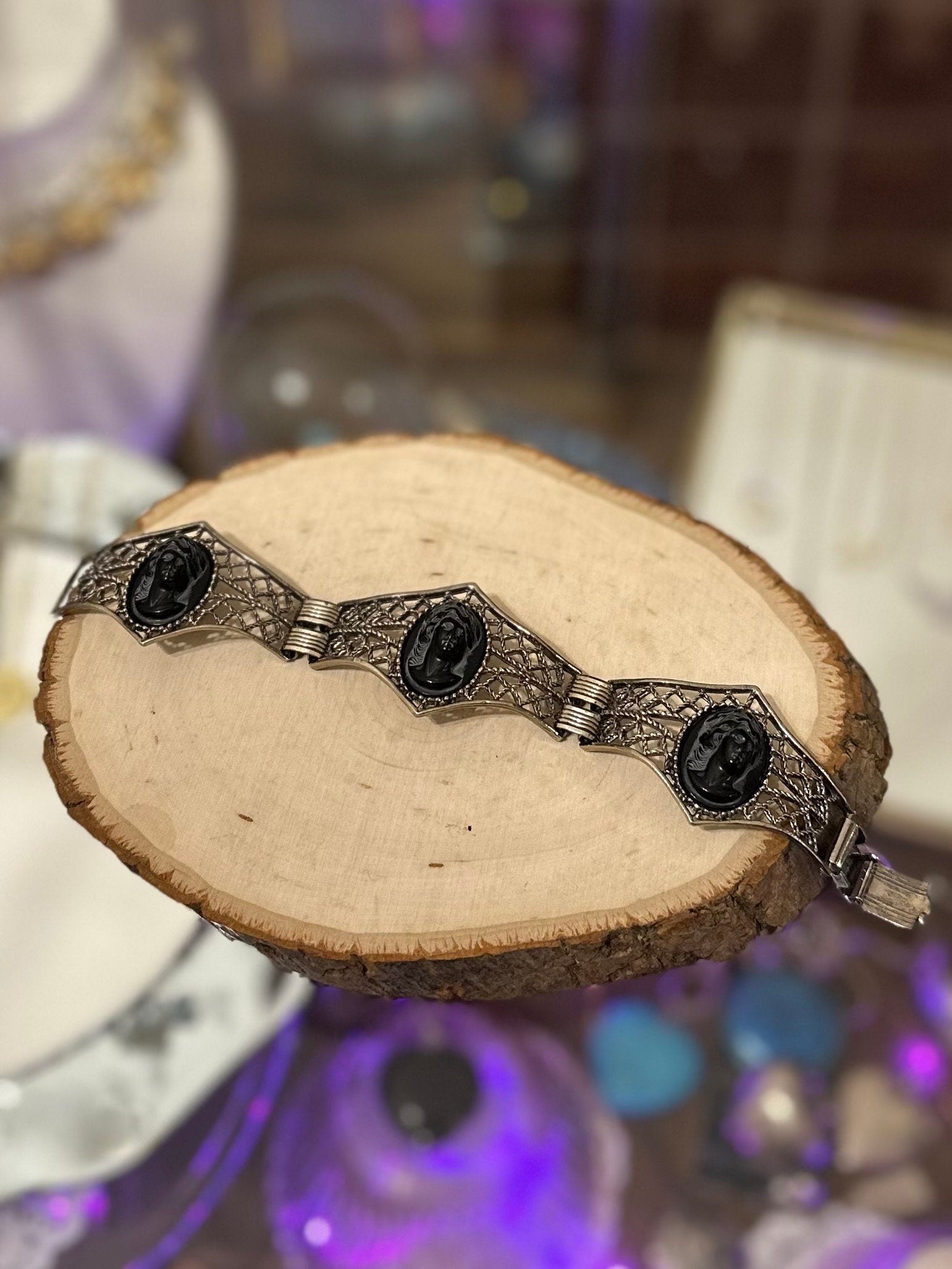 Rare Vintage Midcentury Silver Tone Black Cameo Head Three Panel Link Statement Bracelet