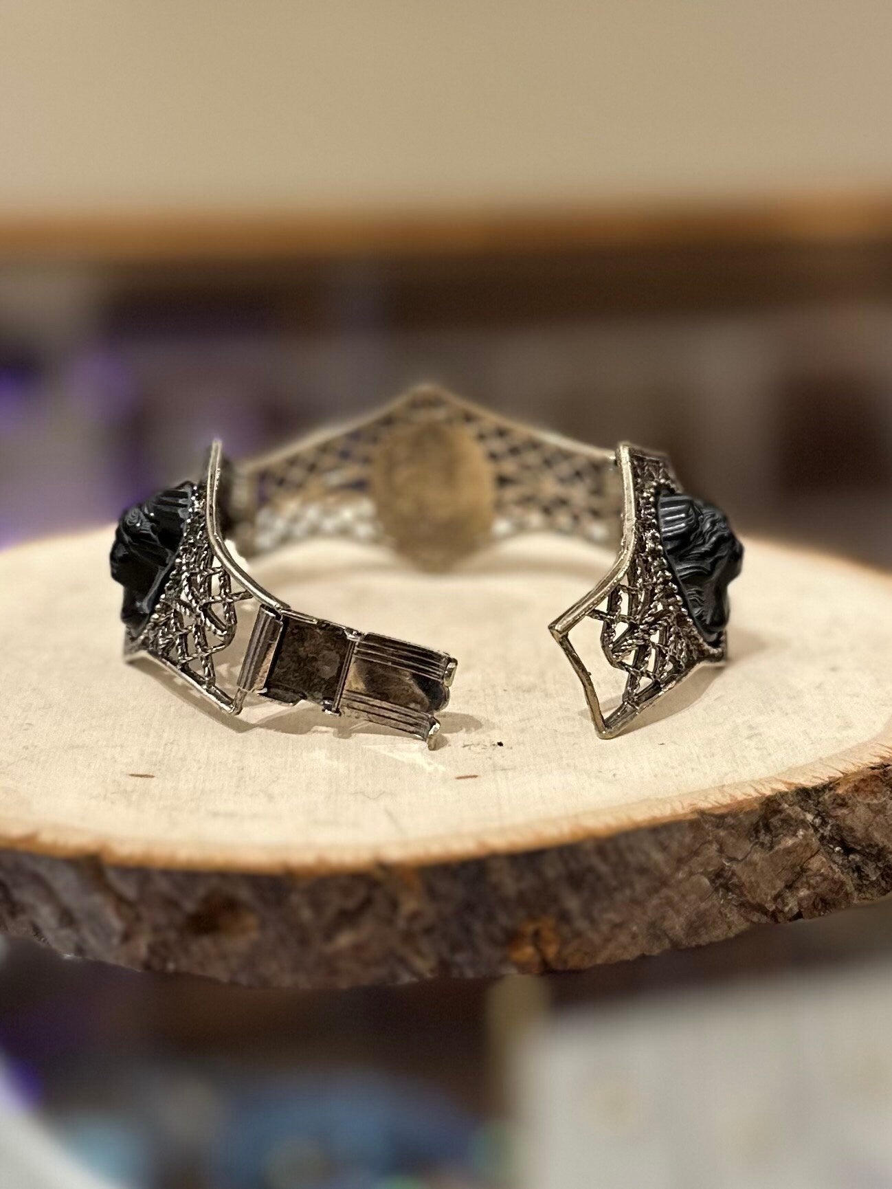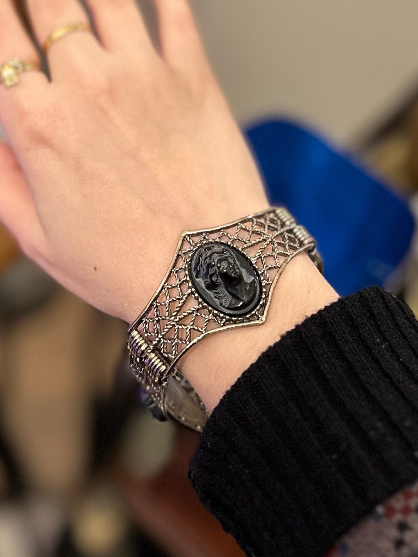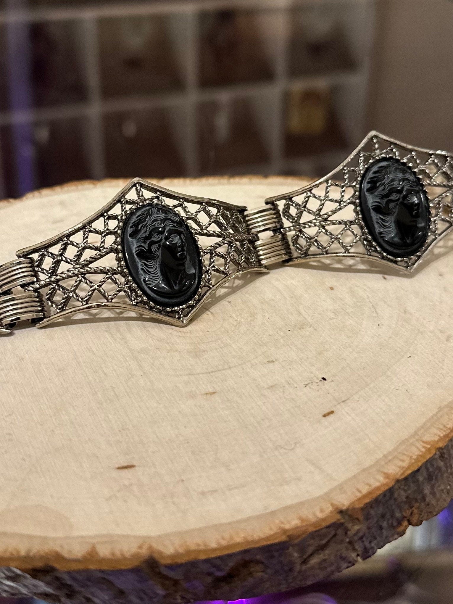 Rare Vintage Midcentury Silver Tone Black Cameo Head Three Panel Link Statement Bracelet