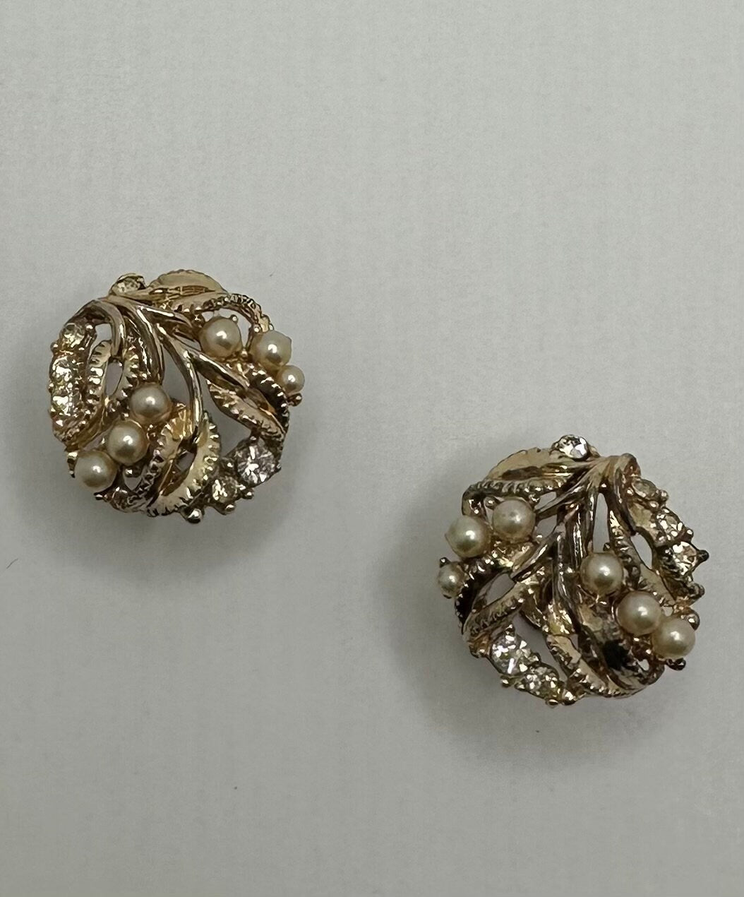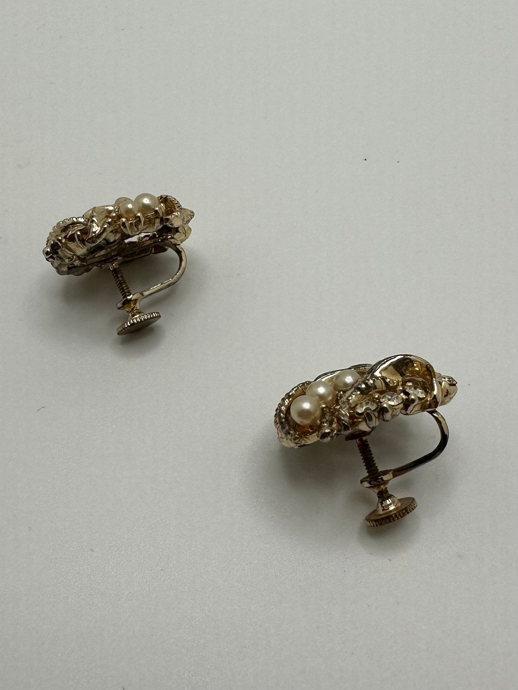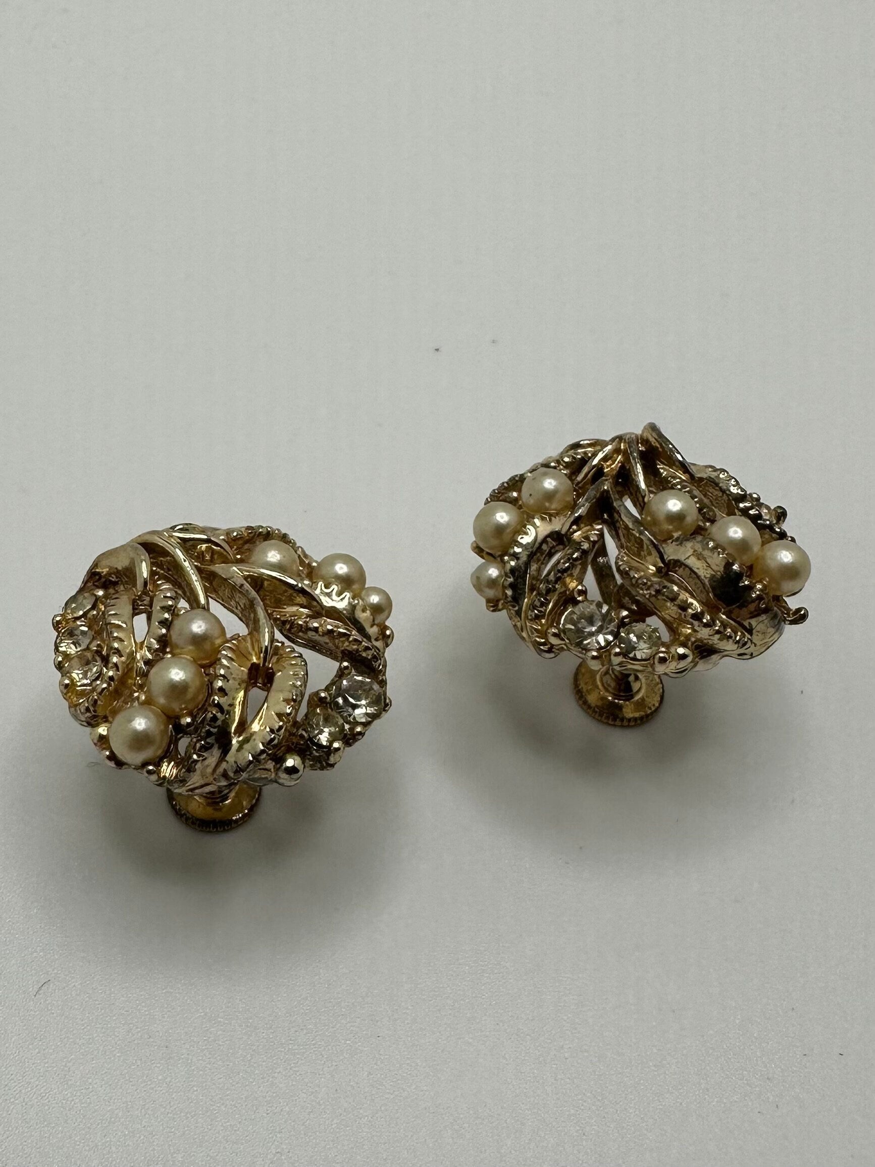 Sophisticated Vintage Faux Pearl, Rhinestone Gold Tone Screw-back Earrings