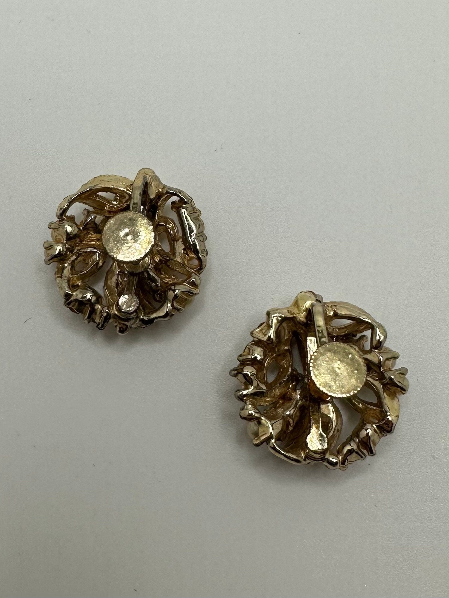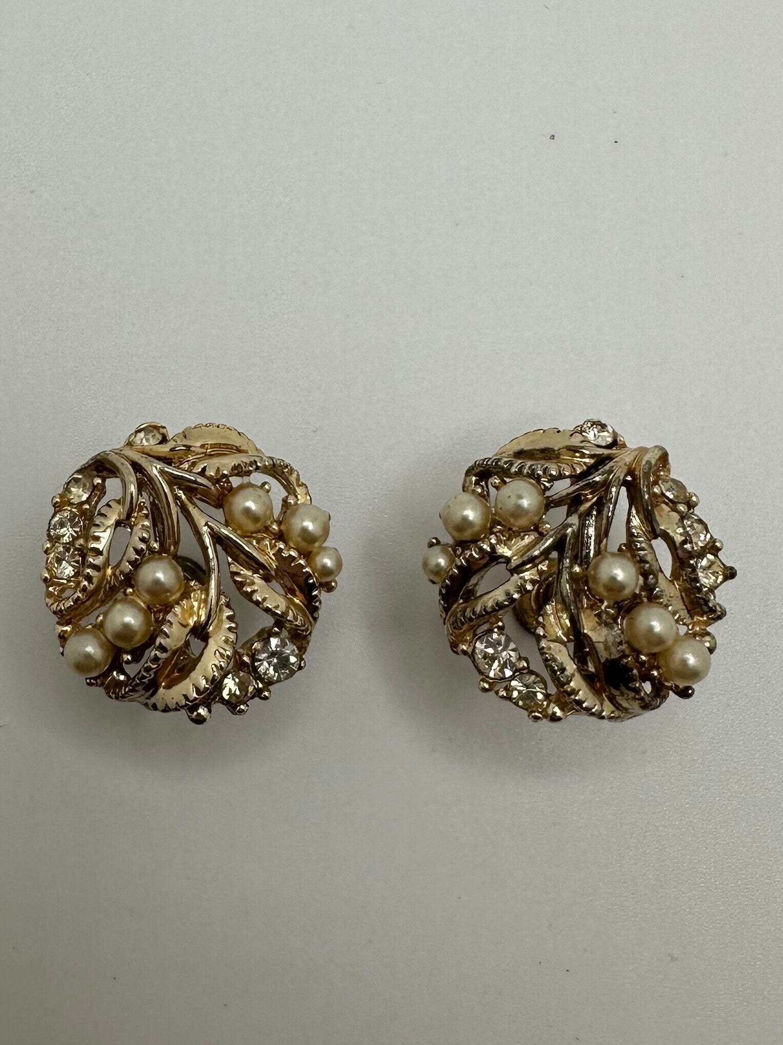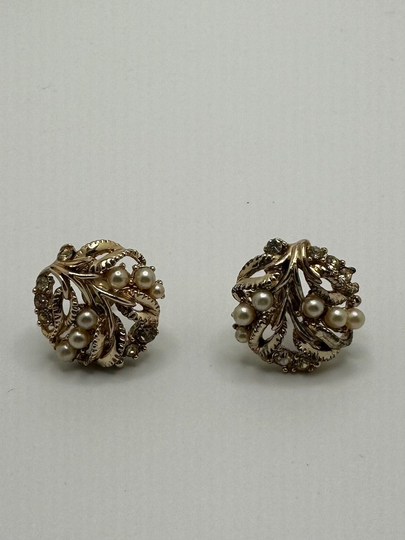 Sophisticated Vintage Faux Pearl, Rhinestone Gold Tone Screw-back Earrings