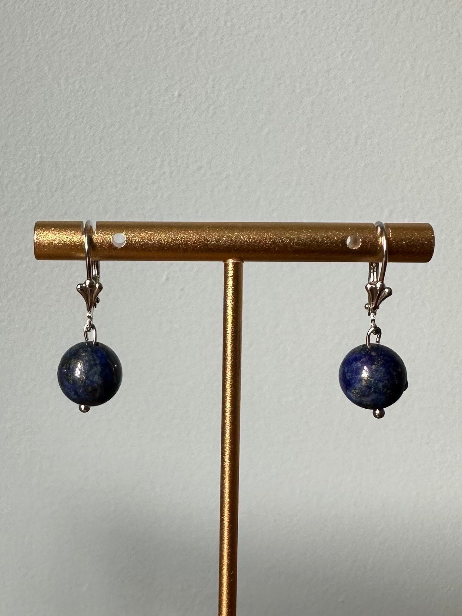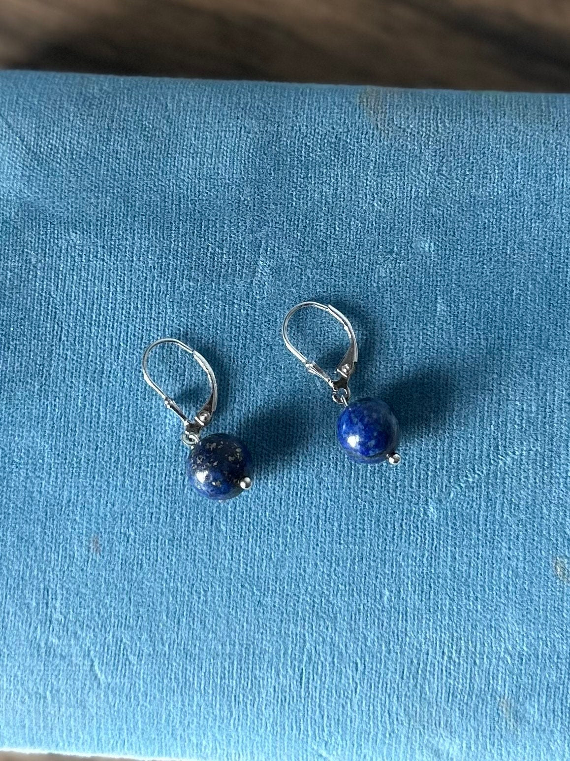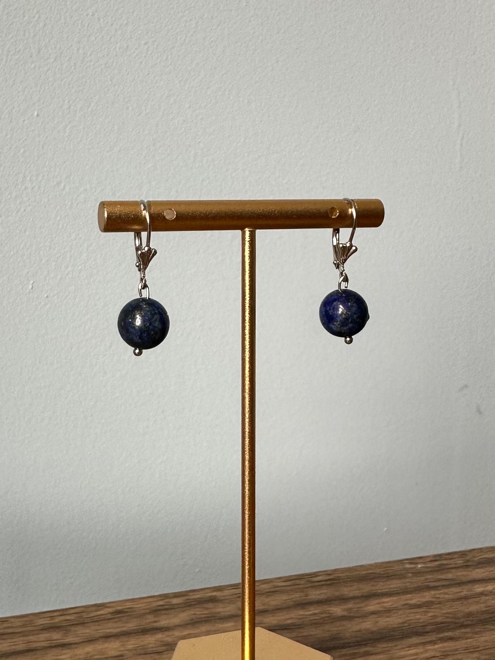 Earrings measure approximately 1.1 inch long from top of ear wire to bottom of bead. Lapis lazuli bead measures approximately 10mm.