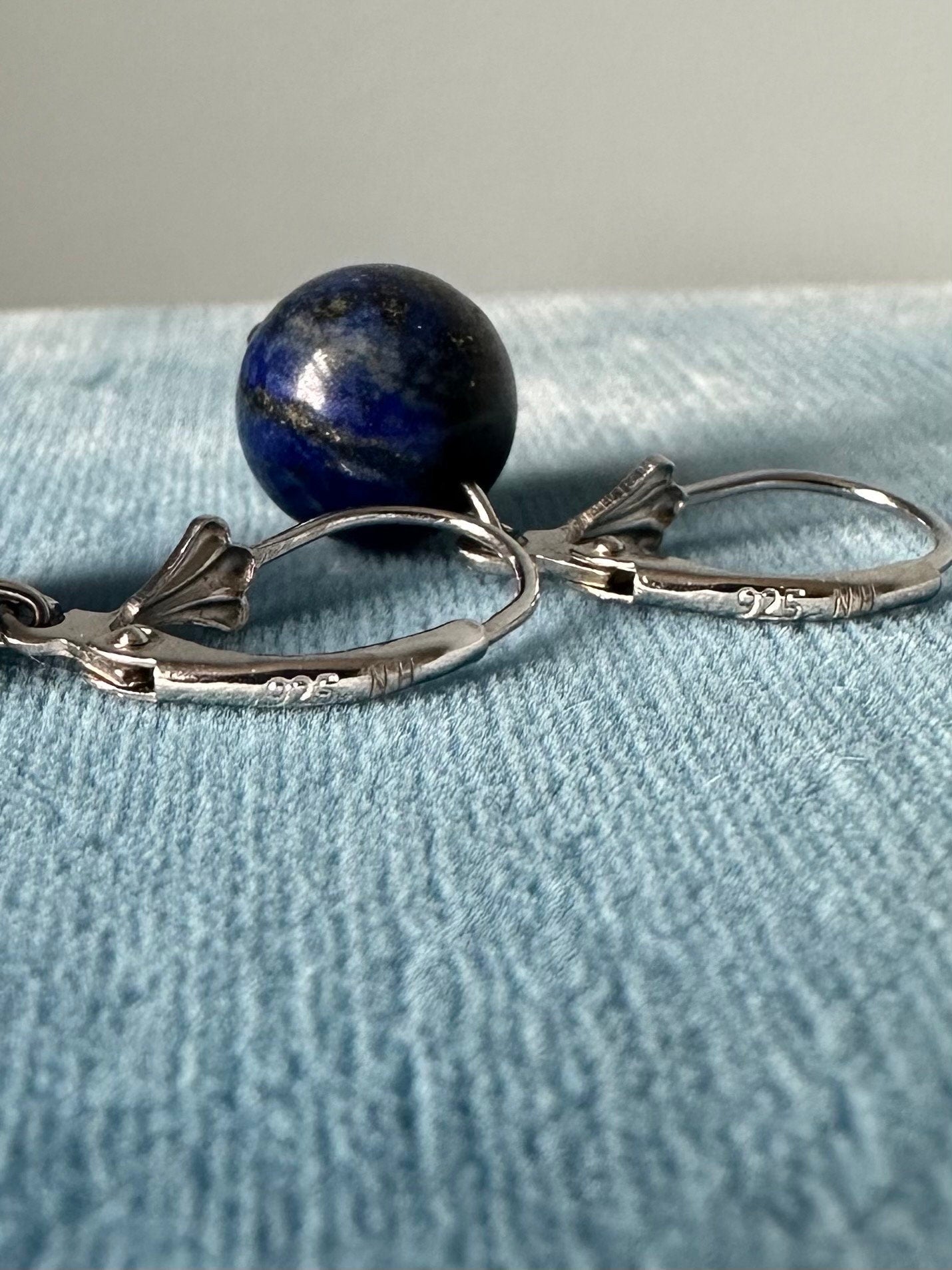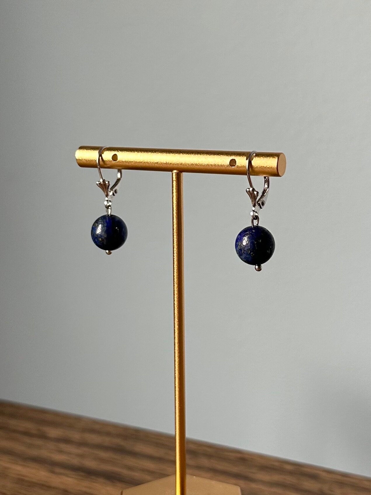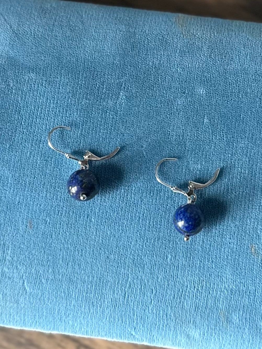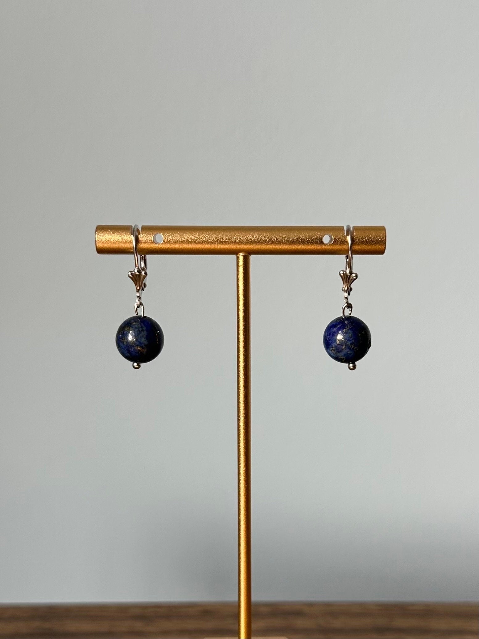 Earrings measure approximately 1.1 inch long from top of ear wire to bottom of bead. Lapis lazuli bead measures approximately 10mm.