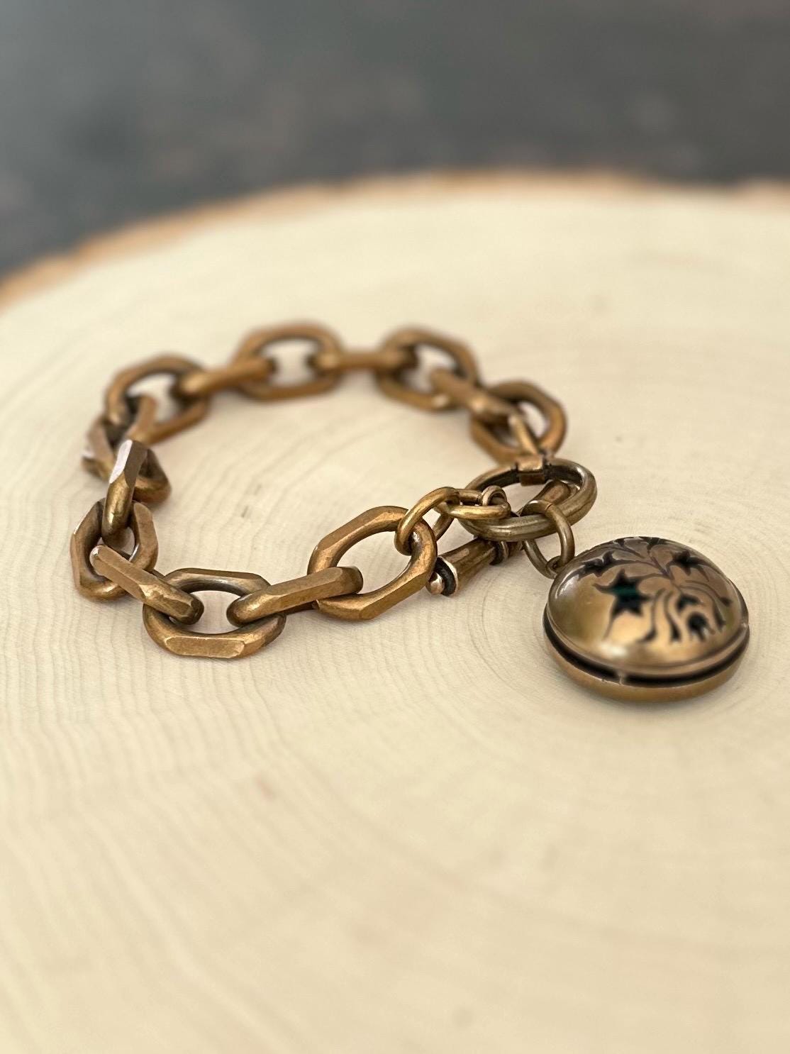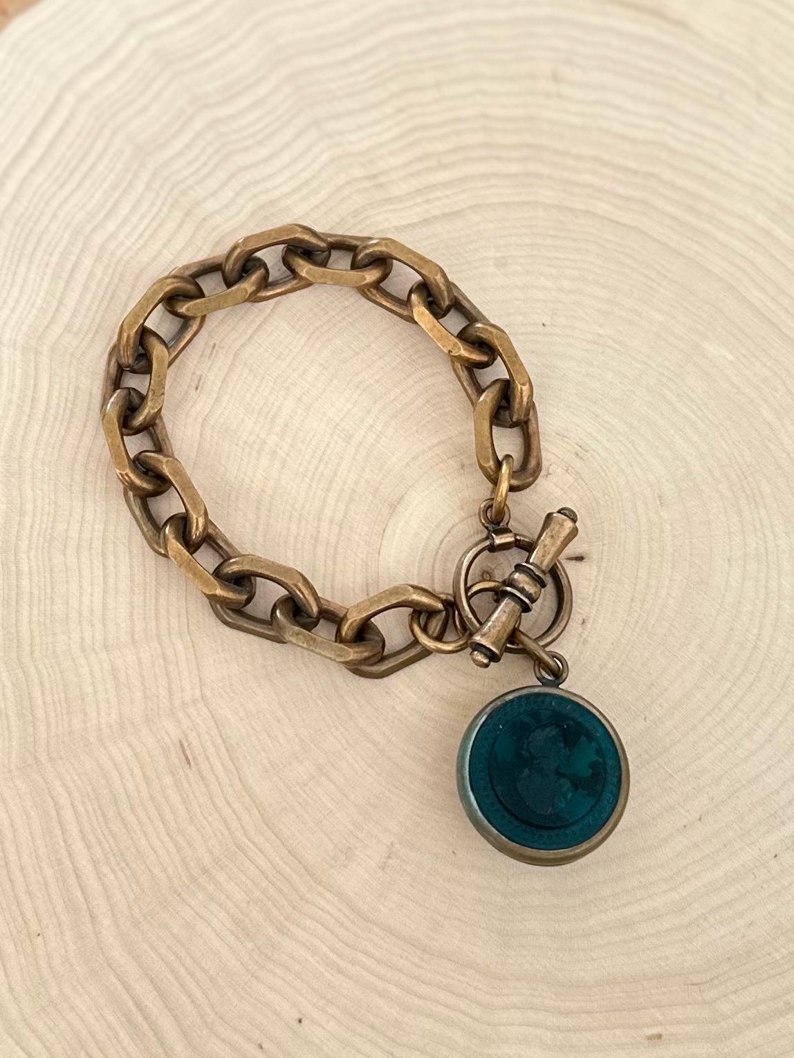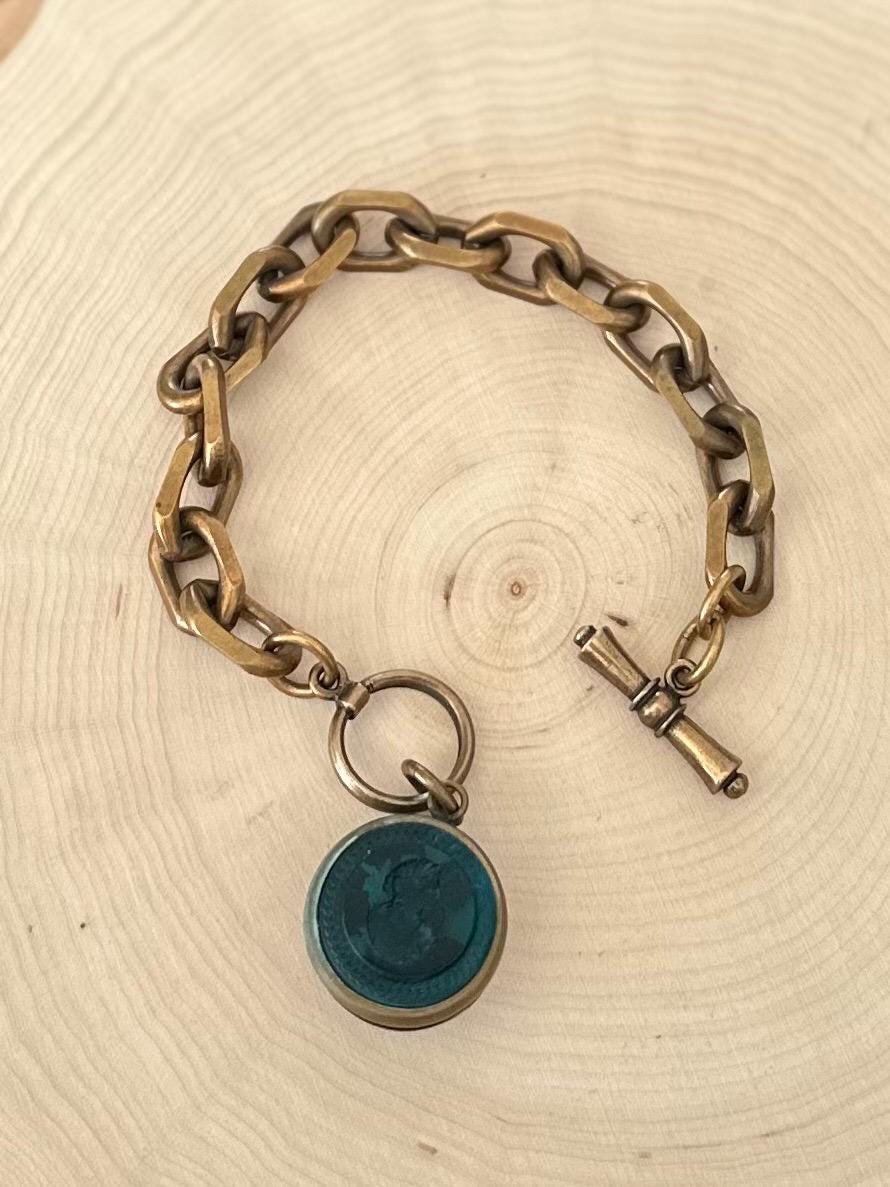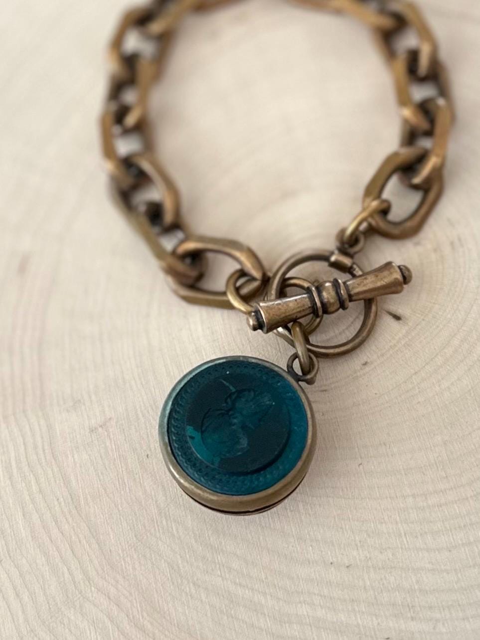 Unsigned EXTASIA chunky bronze tone chain link bracelet, with a teal blue glass intaglio or reverse cameo.