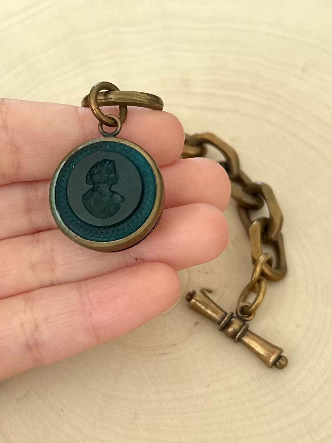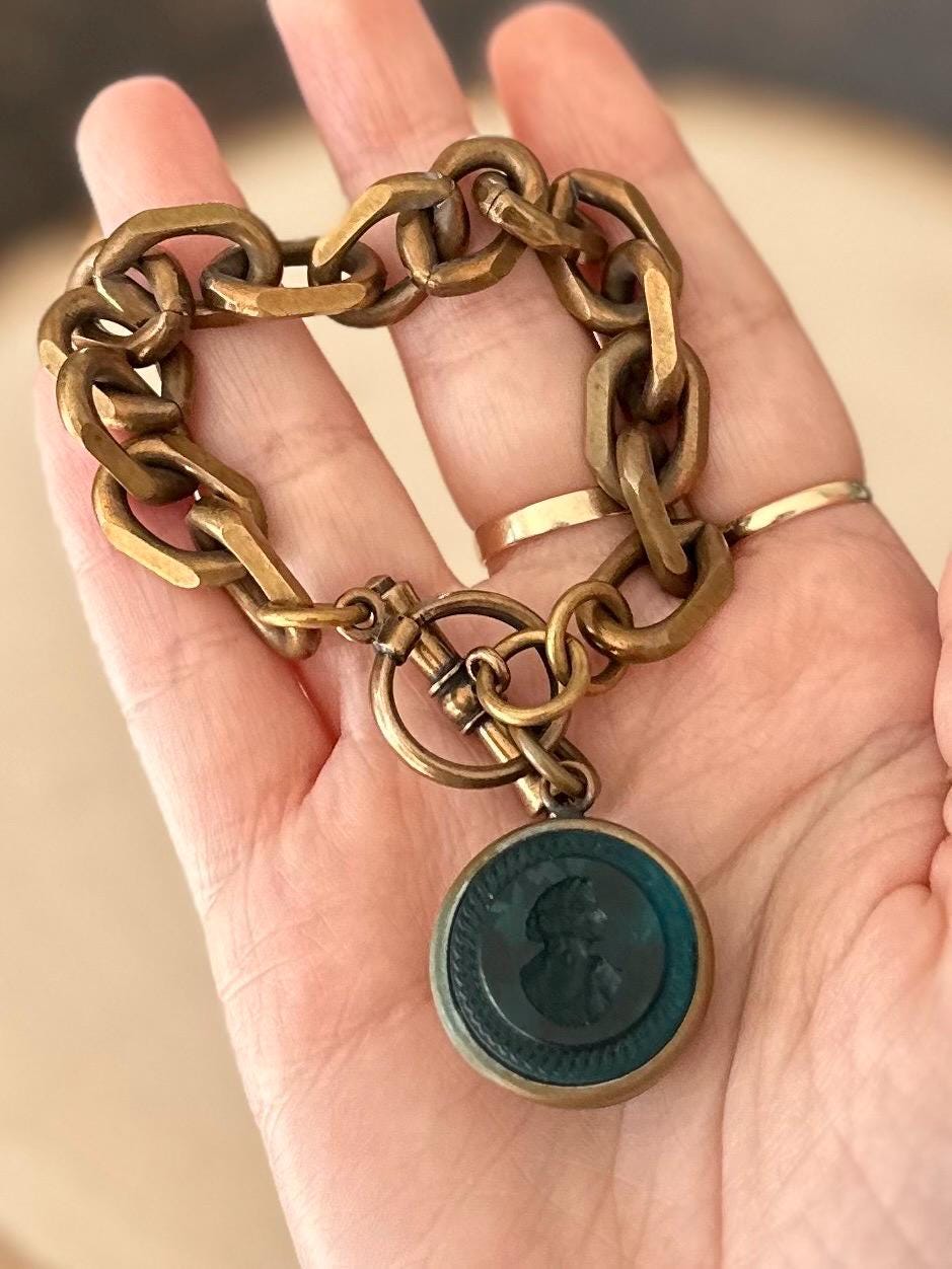 Unsigned EXTASIA Chunky Chain Link Charm Bracelet Dark Teal Blue Intaglio Reverse Cameo