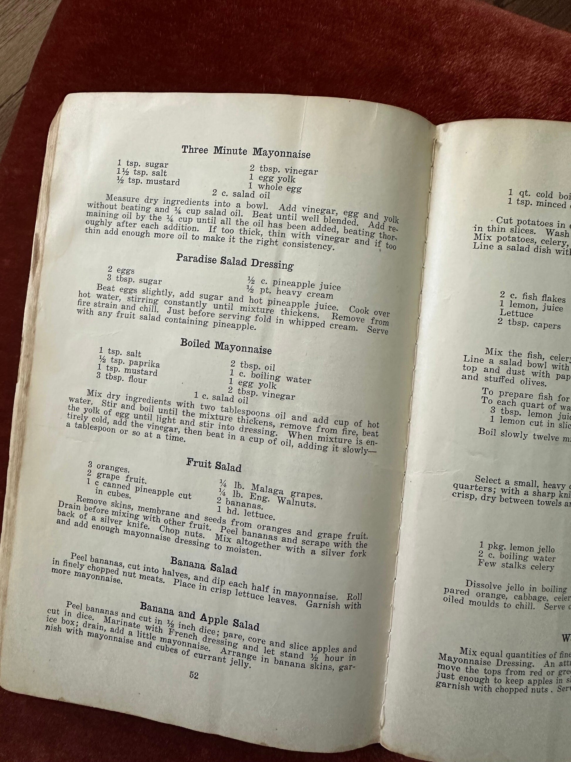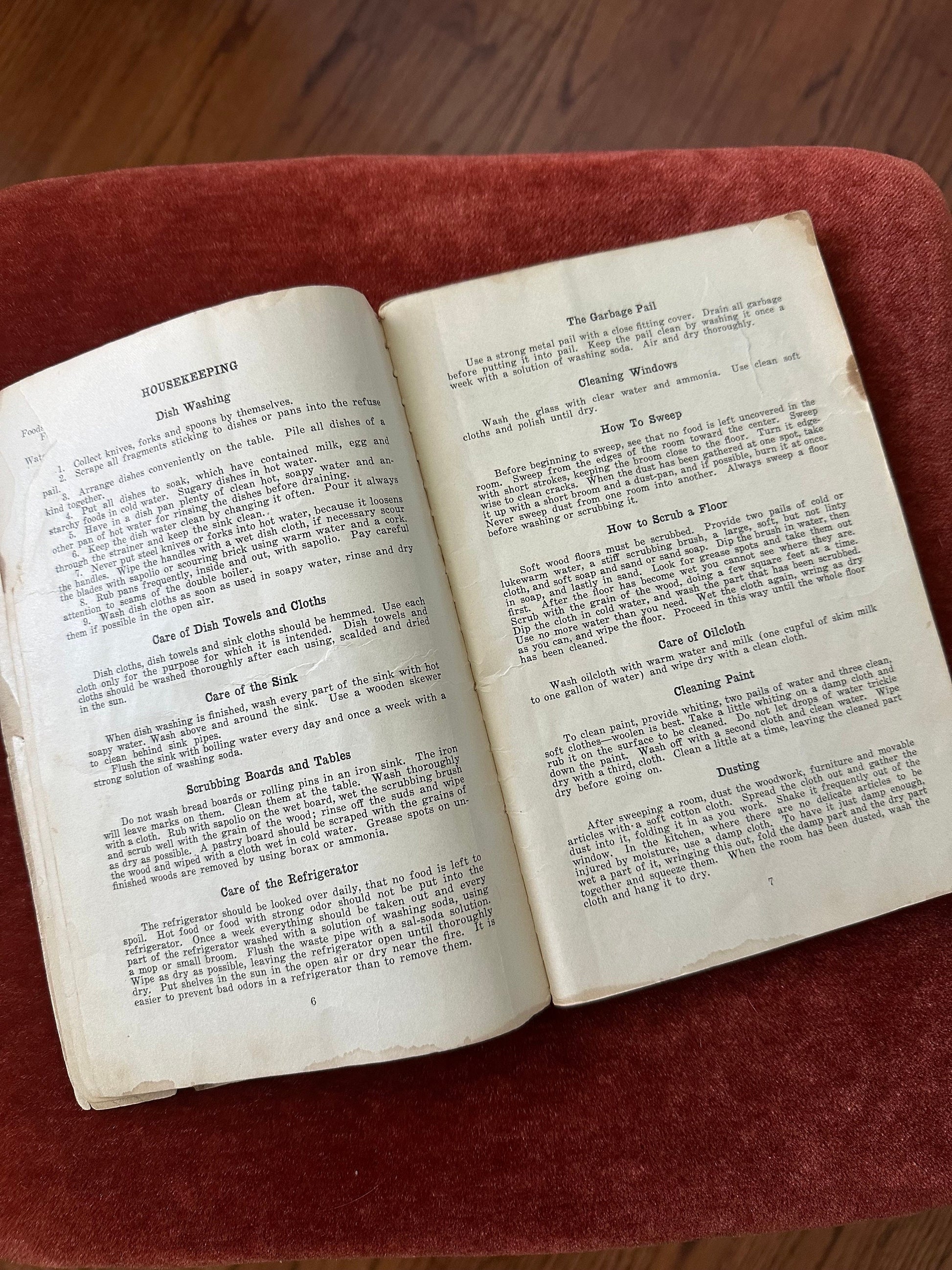 Contents include: housekeeping, personal hygiene, recipes, food preservation, invalid cooking, table service, menu building, & table manners.