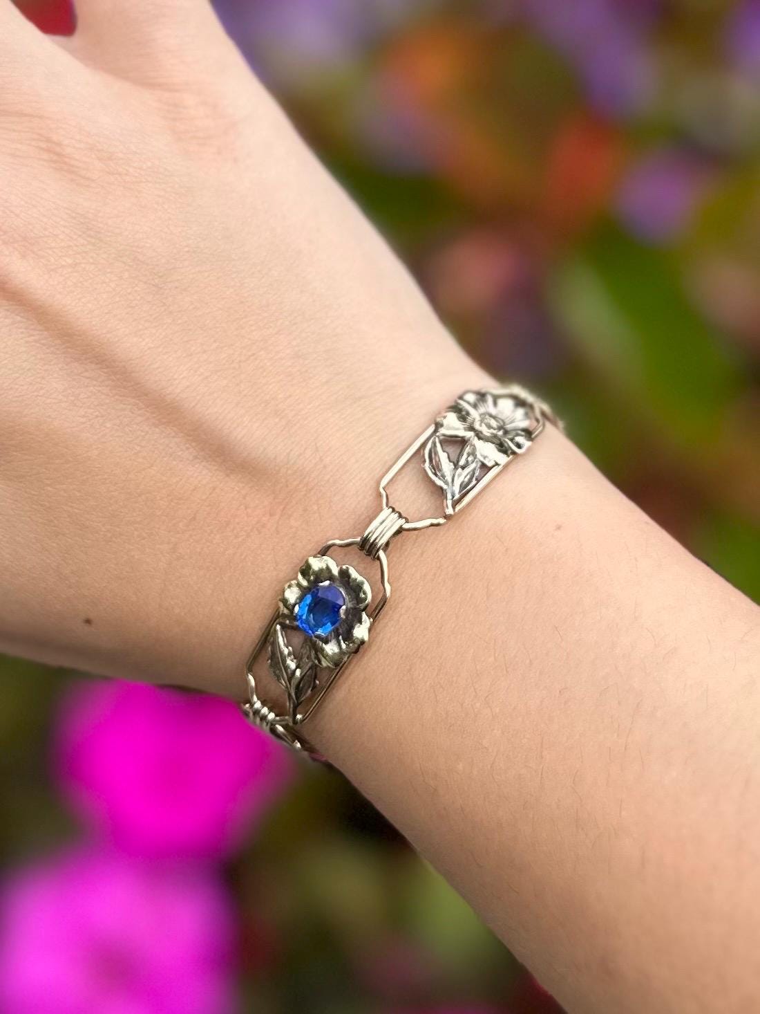 Circa 1930s. Beautiful vintage gold over sterling silver floral design panel link bracelet adorned with faceted open-back blue rhinestones.