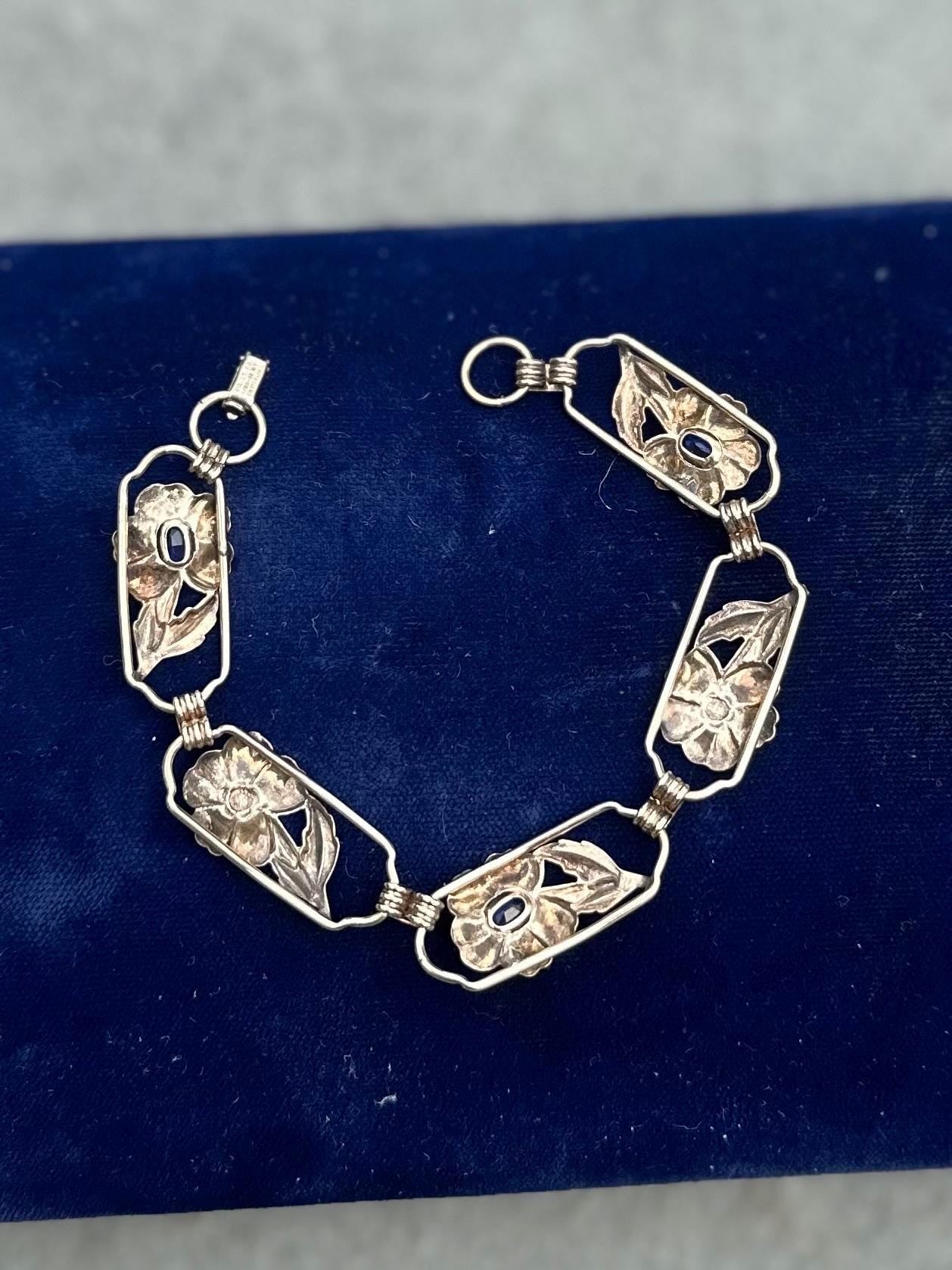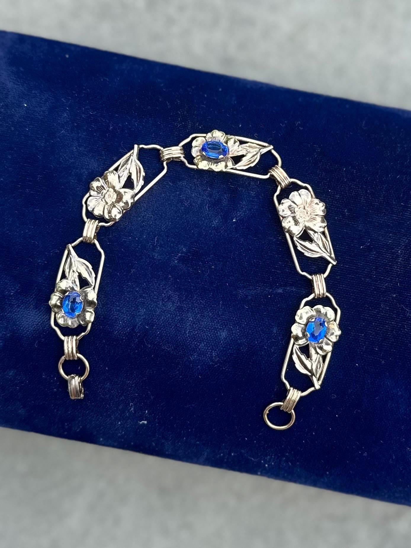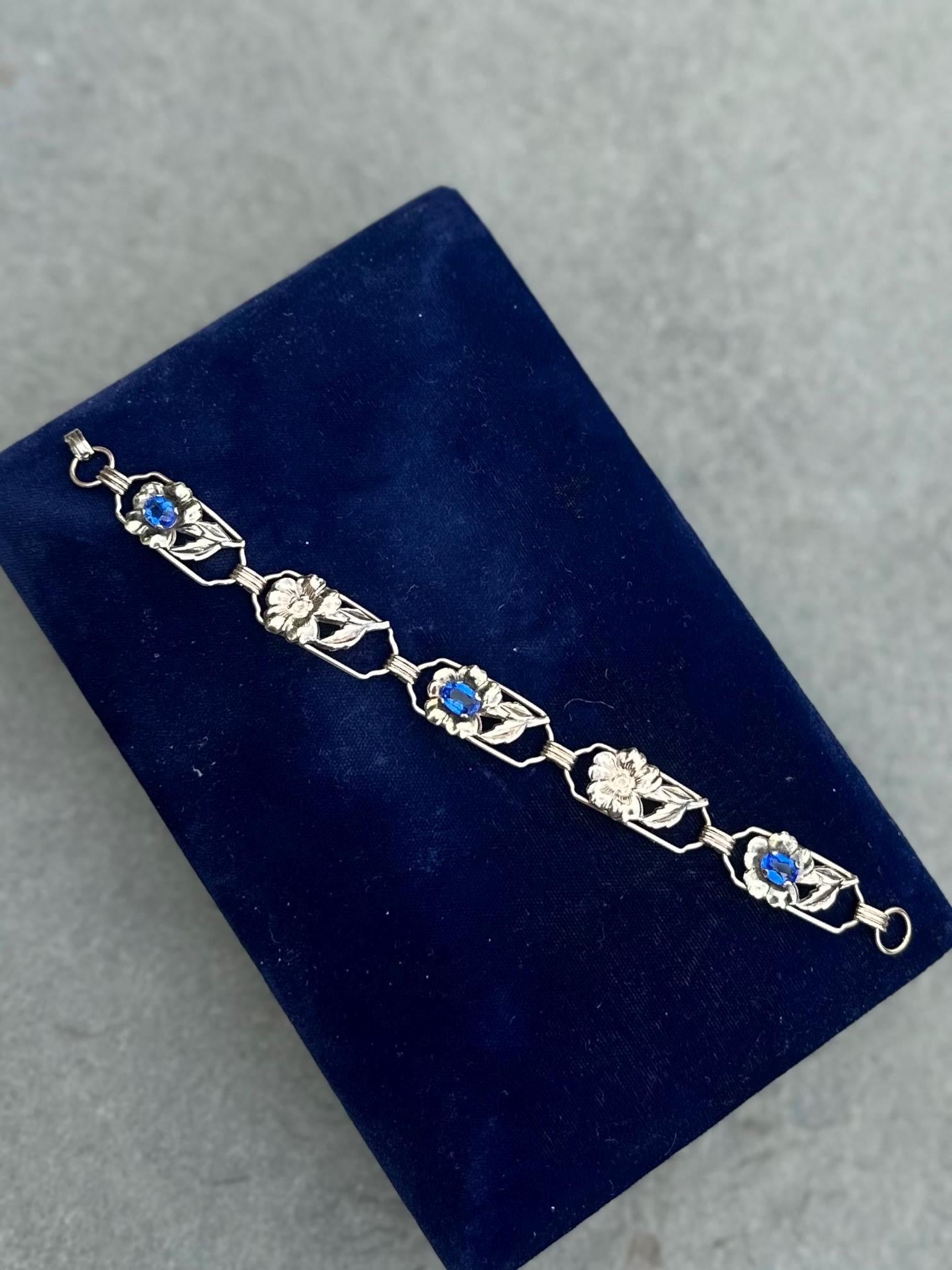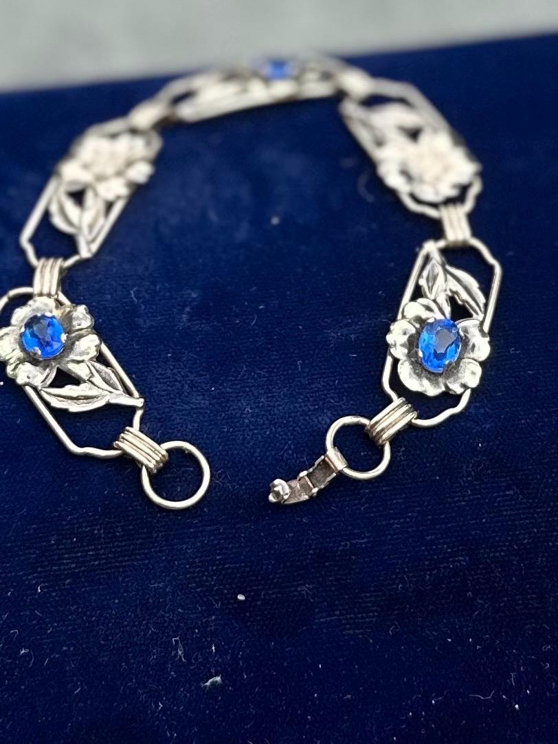 1930s Signed Providence Stock Co. 1/20 12k Gold Filled Sterling Silver Floral Blue Rhinestone Link Bracelet