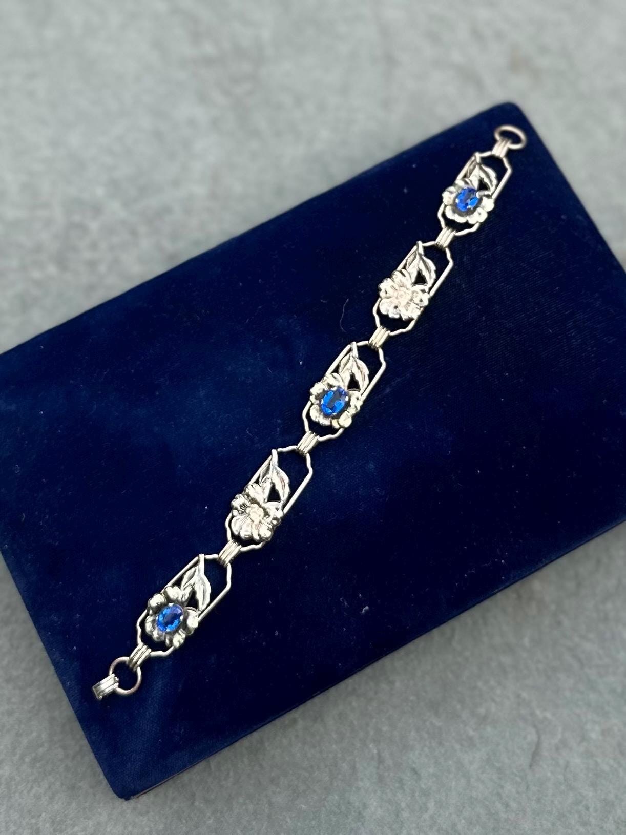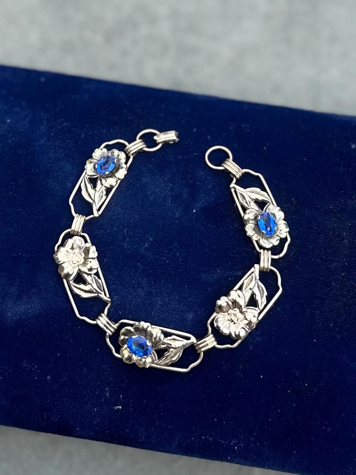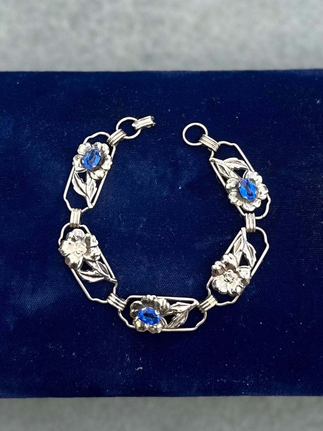 1930s Signed Providence Stock Co. 1/20 12k Gold Filled Sterling Silver Floral Blue Rhinestone Link Bracelet