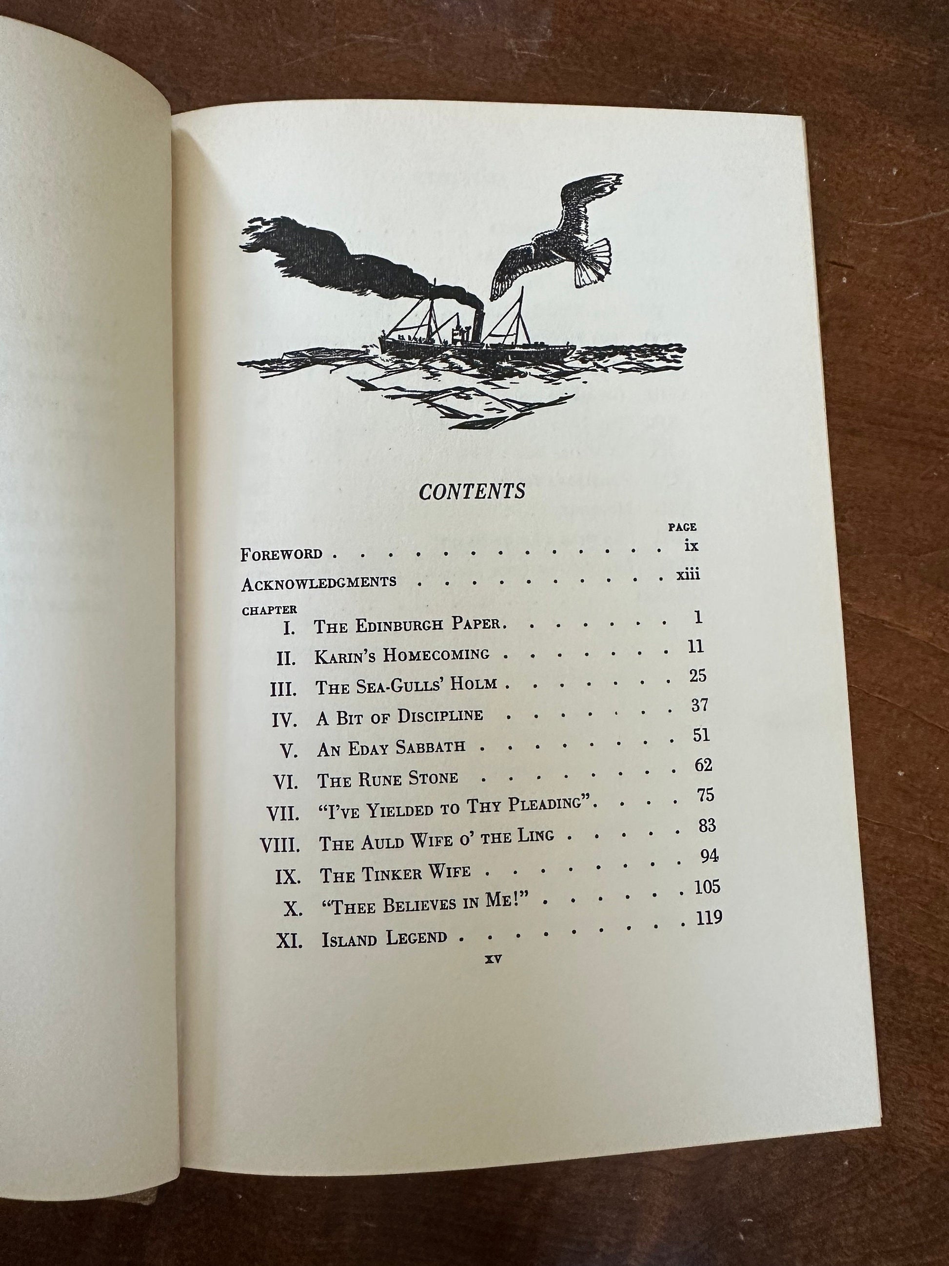 Contents include: The Edinburgh Paper, Karin’s Homecoming, The Sea-Gulls’ Holm, A Bit of Discipline, An Eday Sabbath, The Rune Stone, “I’ve Yielded to Thy Pleading,” The Auld Wife O’ the Ling, The Tinker Wife, “Thee Believes in Me!,” Island Legend, Stormy Petrels, A Rock in the Sea, The Lost Stone, The Kelp Tangles, The Five-Shilling Piece, The Frithjof Saga, “A White Bird’s Wing,” Frithjof’s Drapa, Moorings, “Go With a Light Heart,” and the Ring of Odin. There is also a glossary.