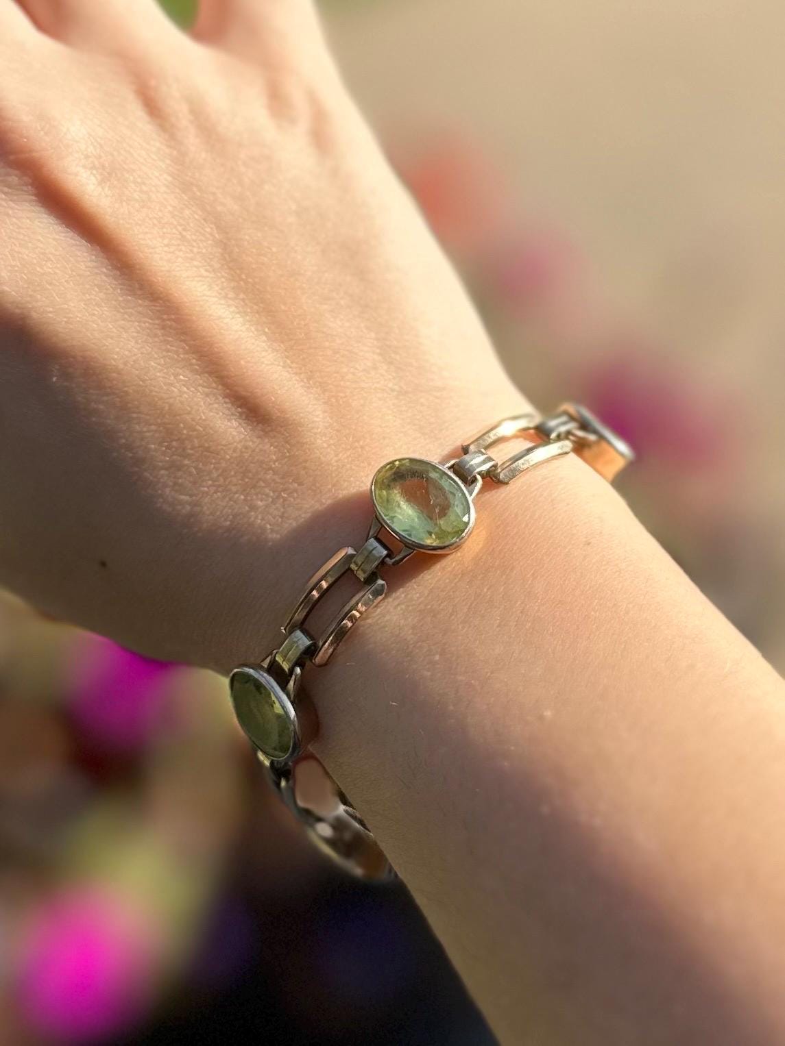 This bracelet features beautifully faceted light green glass bezel-set in a gold filled open back setting.
