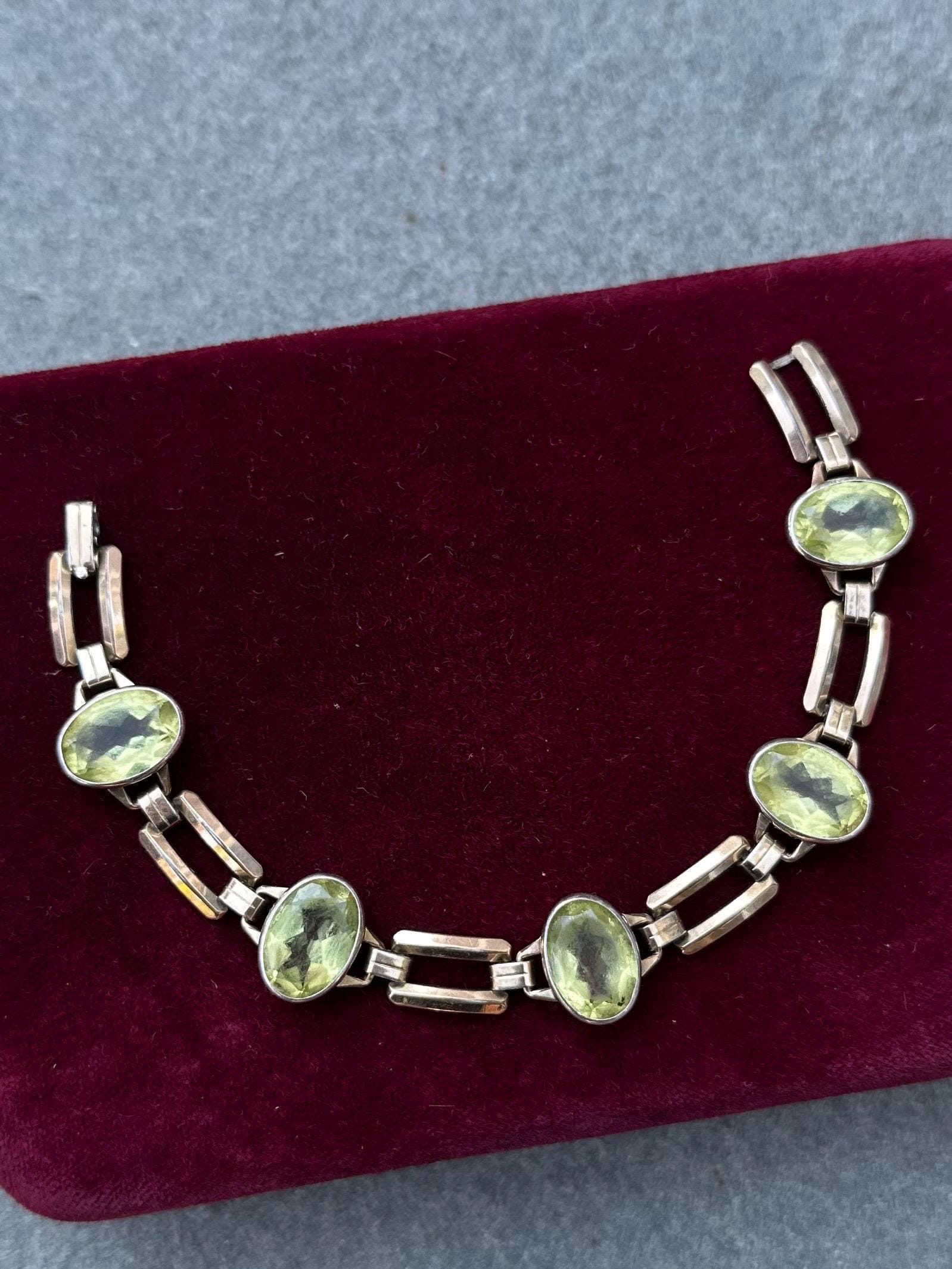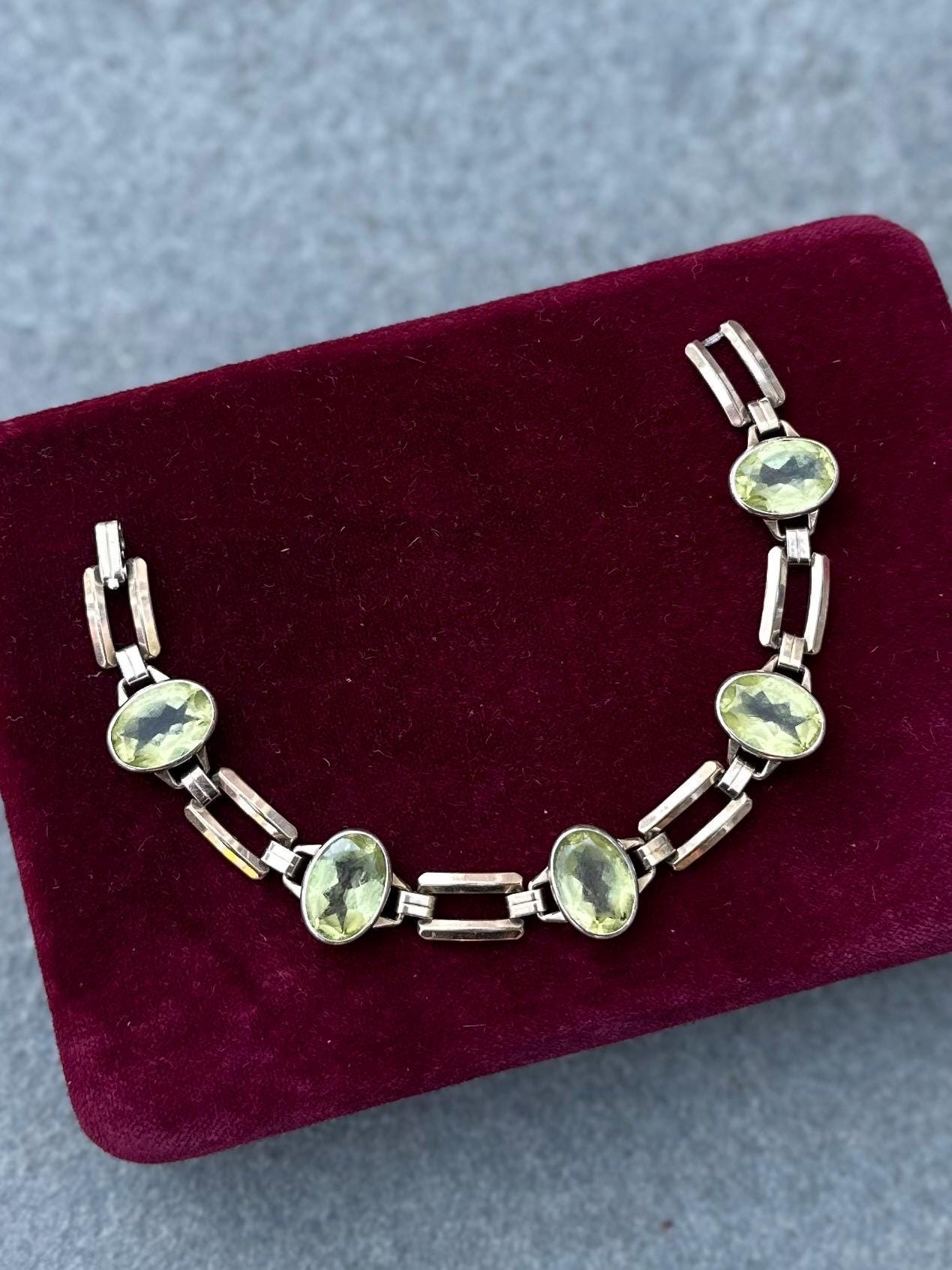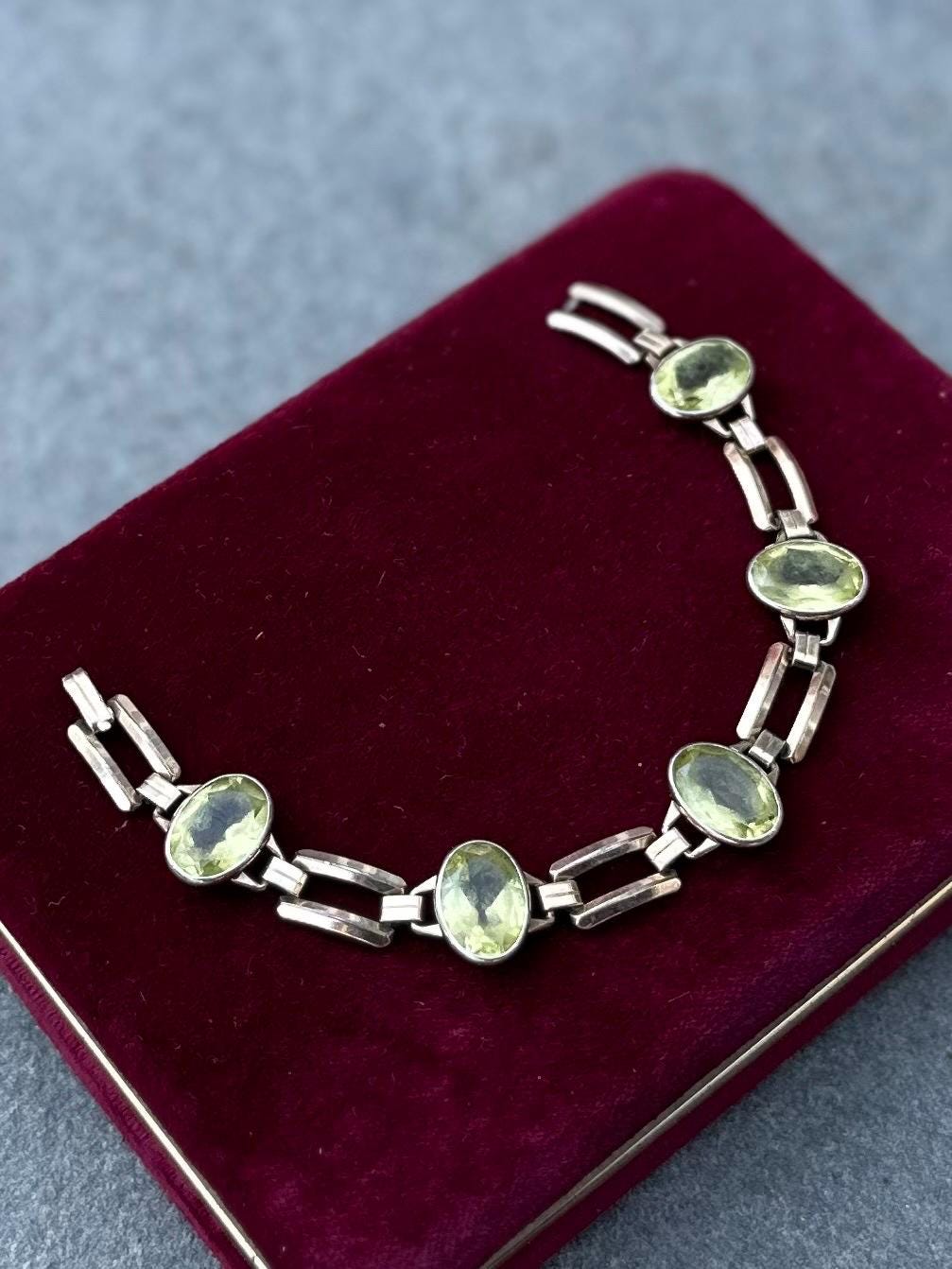 1940s Art Deco Signed ENGEL BROTHERS 1/20 10k Gold Filled Faceted Cut Light Green Glass Stones Link Bracelet 7”