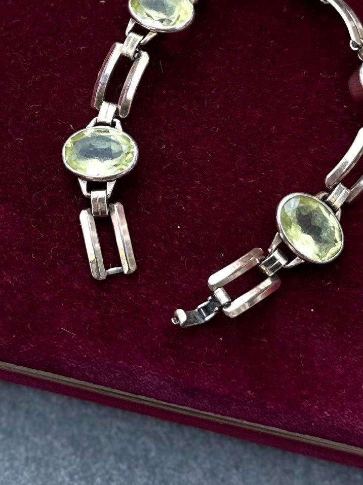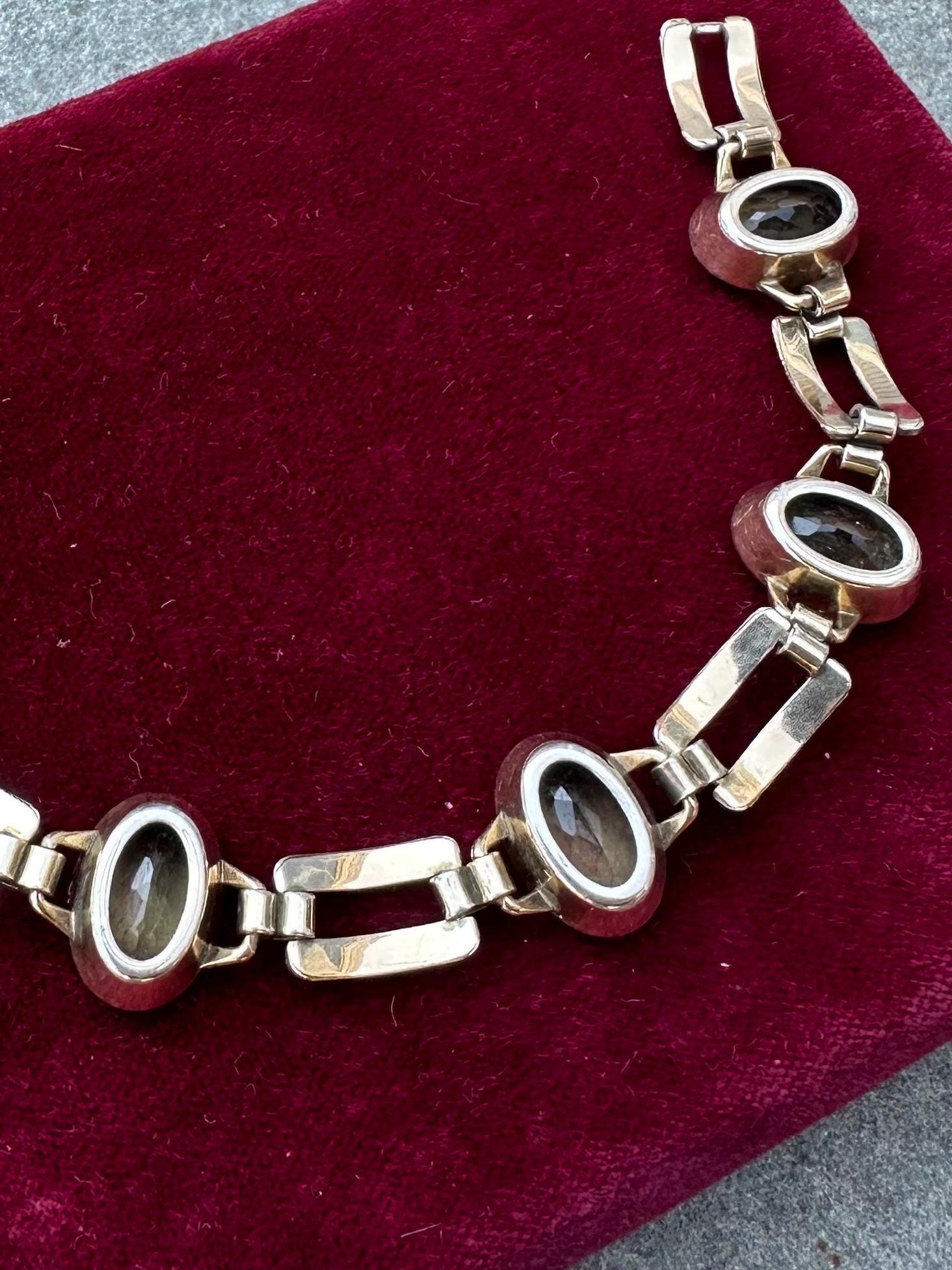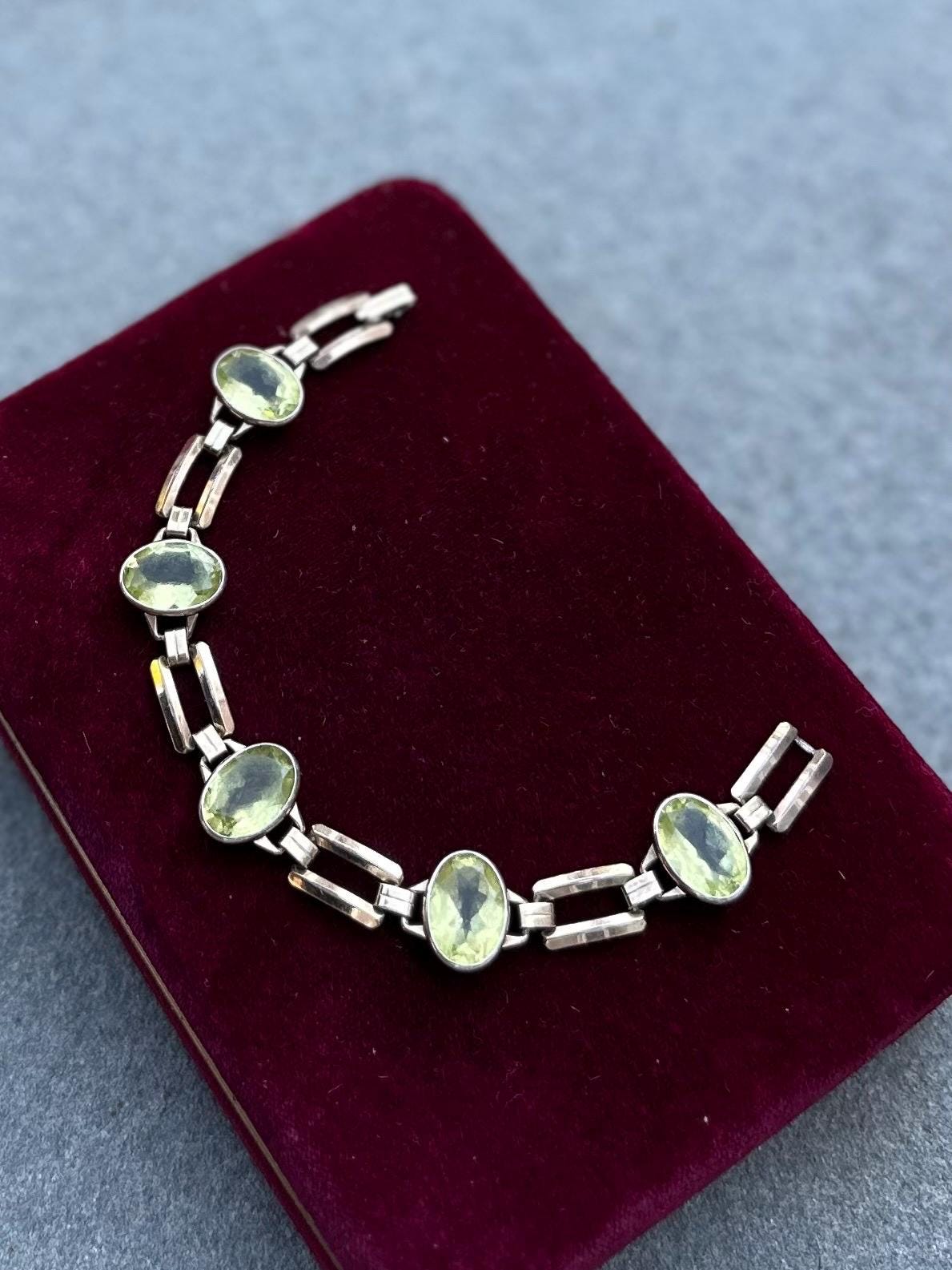 1940s Art Deco Signed ENGEL BROTHERS 1/20 10k Gold Filled Faceted Cut Light Green Glass Stones Link Bracelet 7”