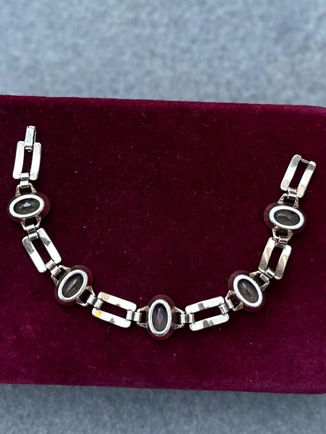 Bracelet measures approximately 7 inches long by 0.55 inch wide, and has a fold over snap clasp.